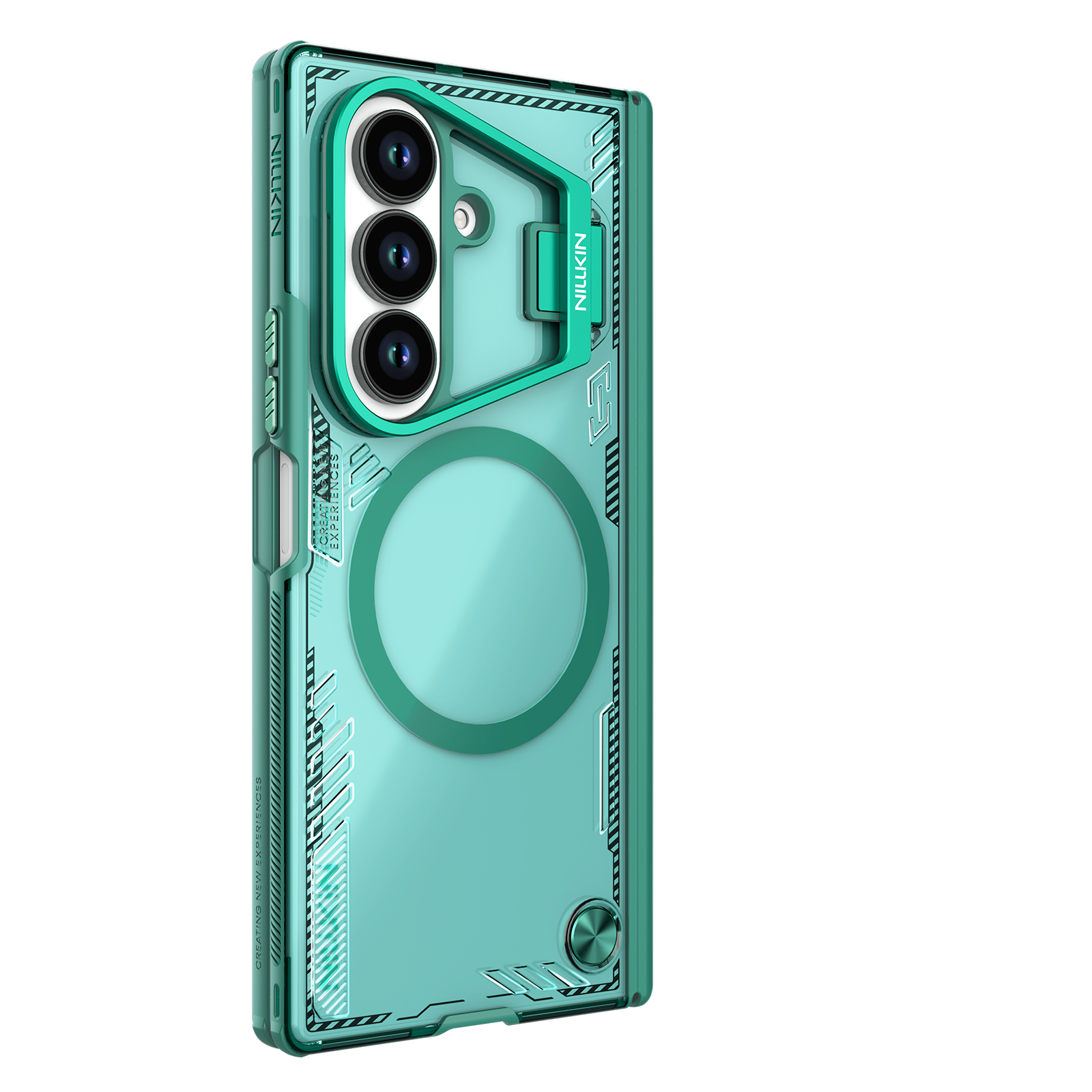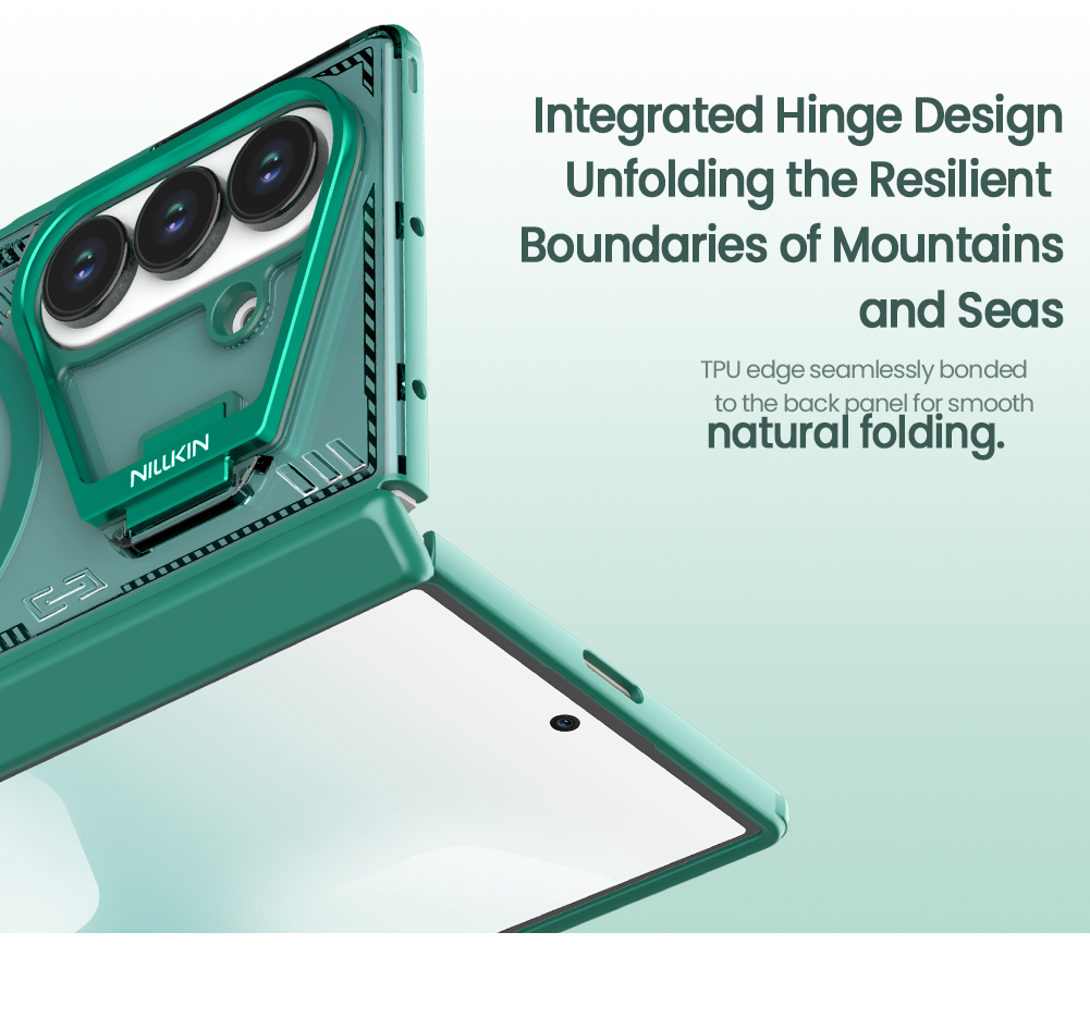 Противоударный чехол зеленого цвета с поддержкой беспроводной зарядки MagSafe и с откидной металлической защитной крышкой для камеры (версия с открытой крышкой) от Nillkin серии Iceblade Prop Magnetic для телефона Samsung Galaxy Fold 7 создан для любителей активного отдыха.