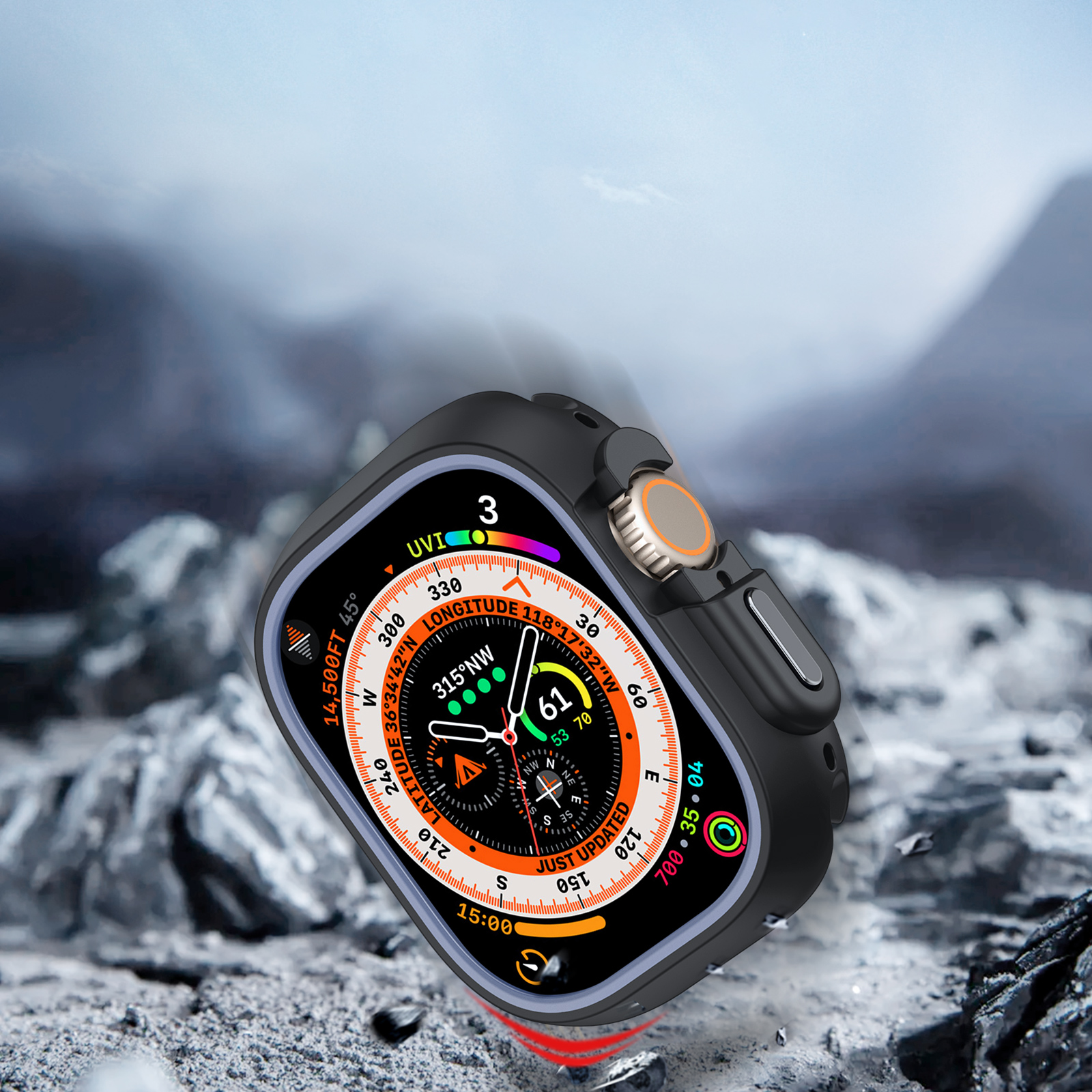 Оригинальный чехол черный с серой вставкой (Black/Gray) от Dux Ducis серии Bamo Series Case для смарт-часов Apple Watch Ultra 1 и 2 размер 49мм, представляет собой цельную конструкцию, которая обеспечивает полную защиту ваших часов от падений. Боковые рамки изготовлены из экологически чистого ПК и мягкого ТПУ, что предохраняет ваши часы от царапин и износа при использовании.
