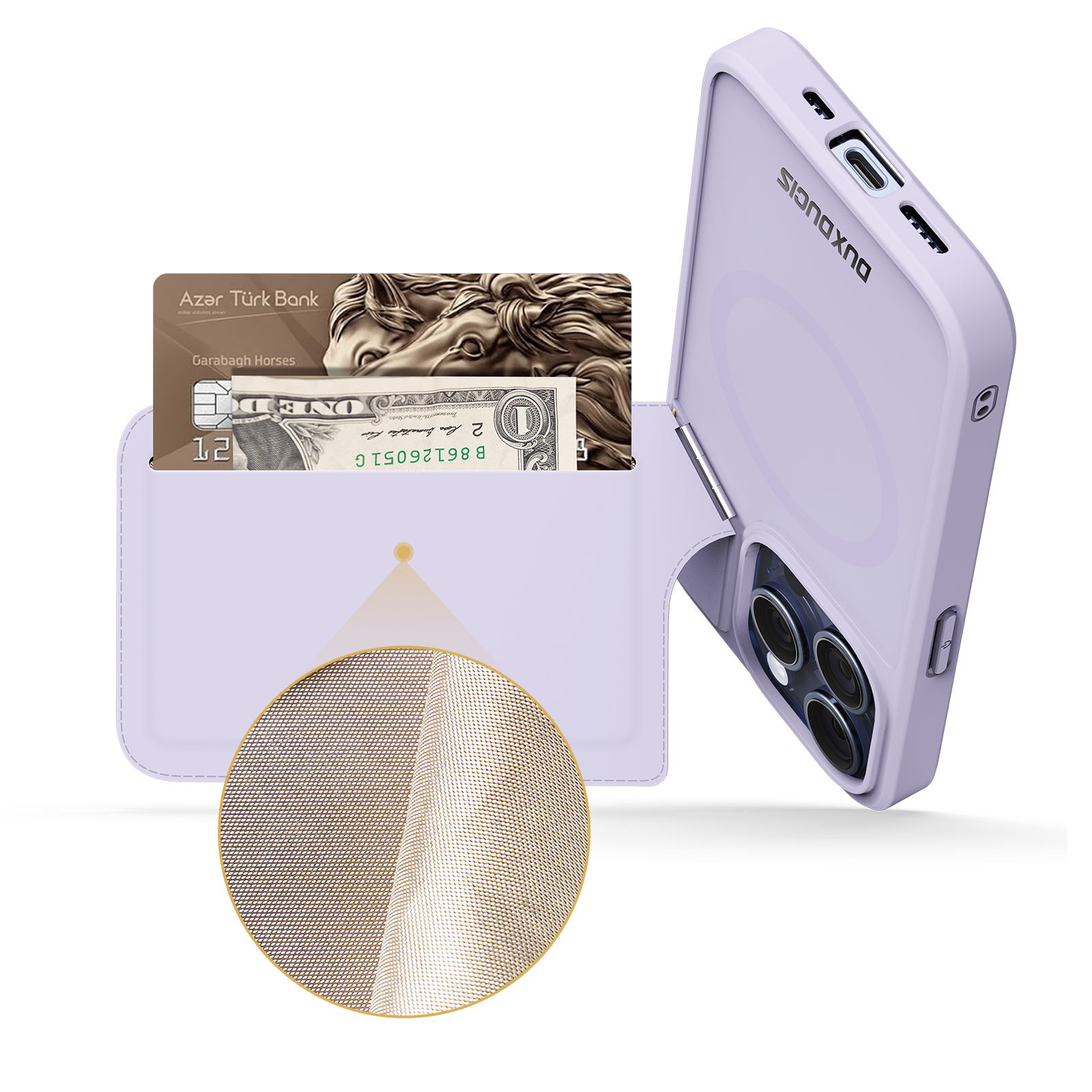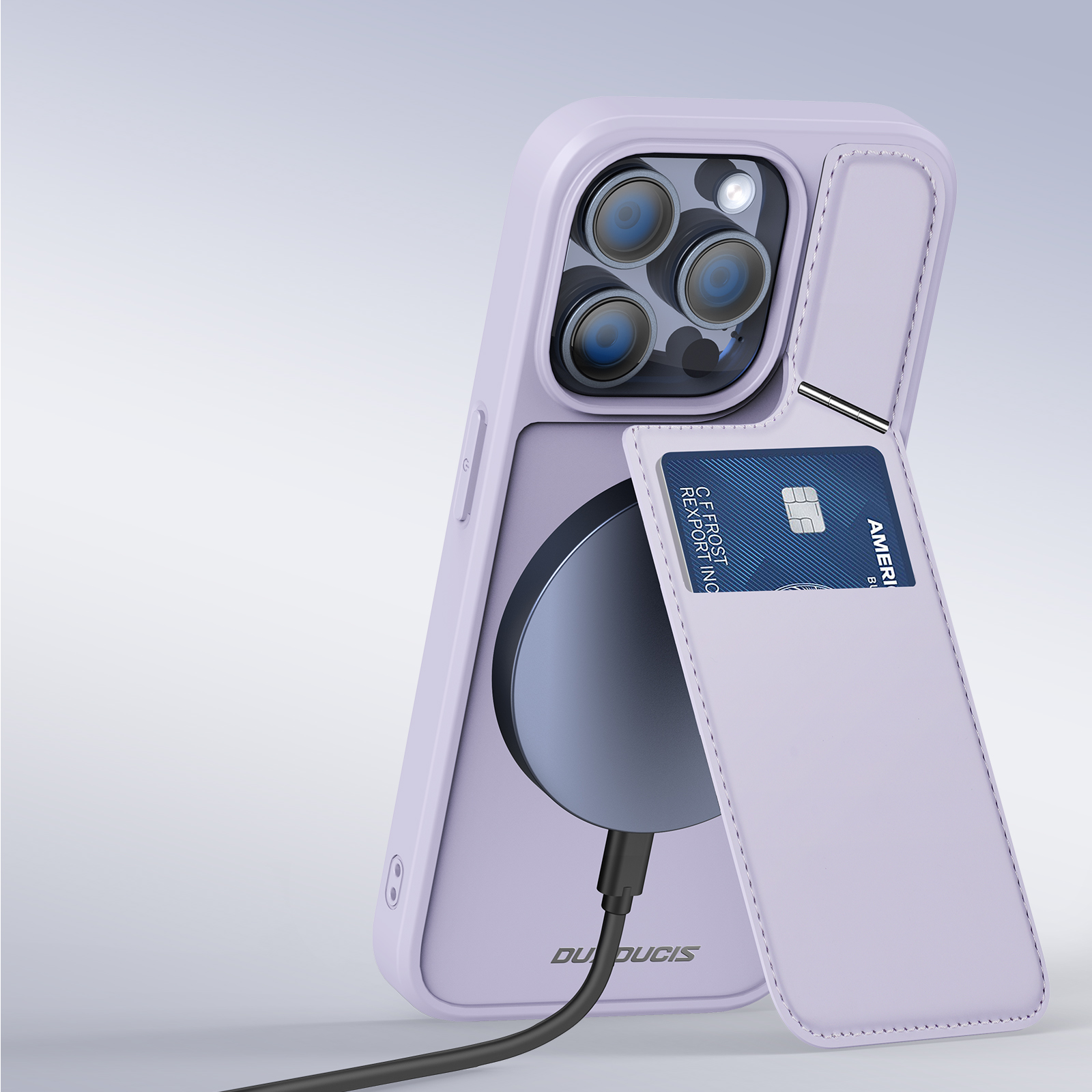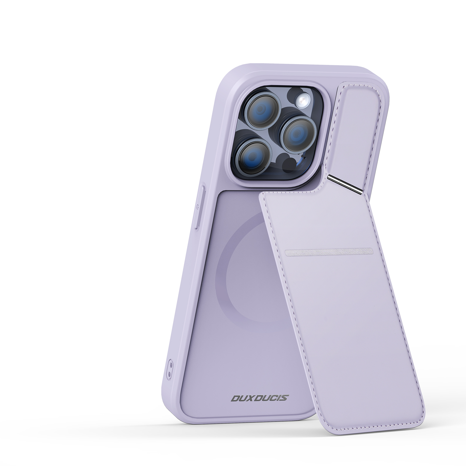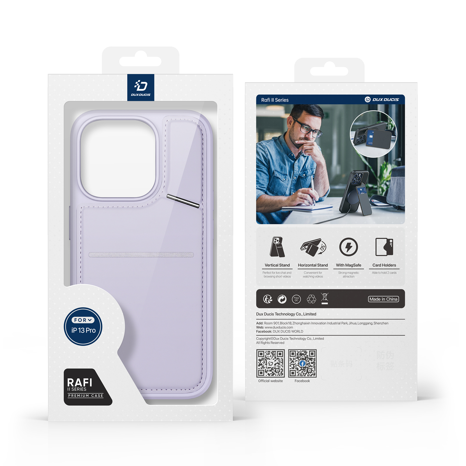 Чехол фиолетового цвета с картхолдером и откидной подставкой от Dux Ducis для iPhone 13 Pro, серия Rafi II Mag Series Case (версия с поддержкой MagSafe). Задняя часть этого чехла покрыта слоем гладкой кожи. Он имеет два держателя для карт, один снаружи и один внутри, внутренний имеет функцию защиты от кражи.