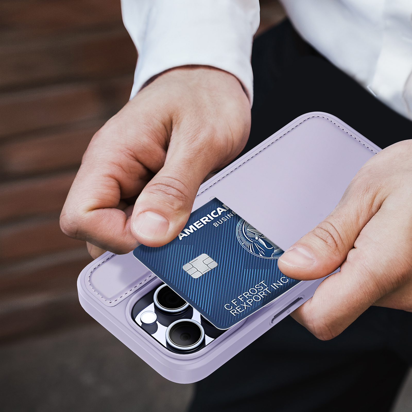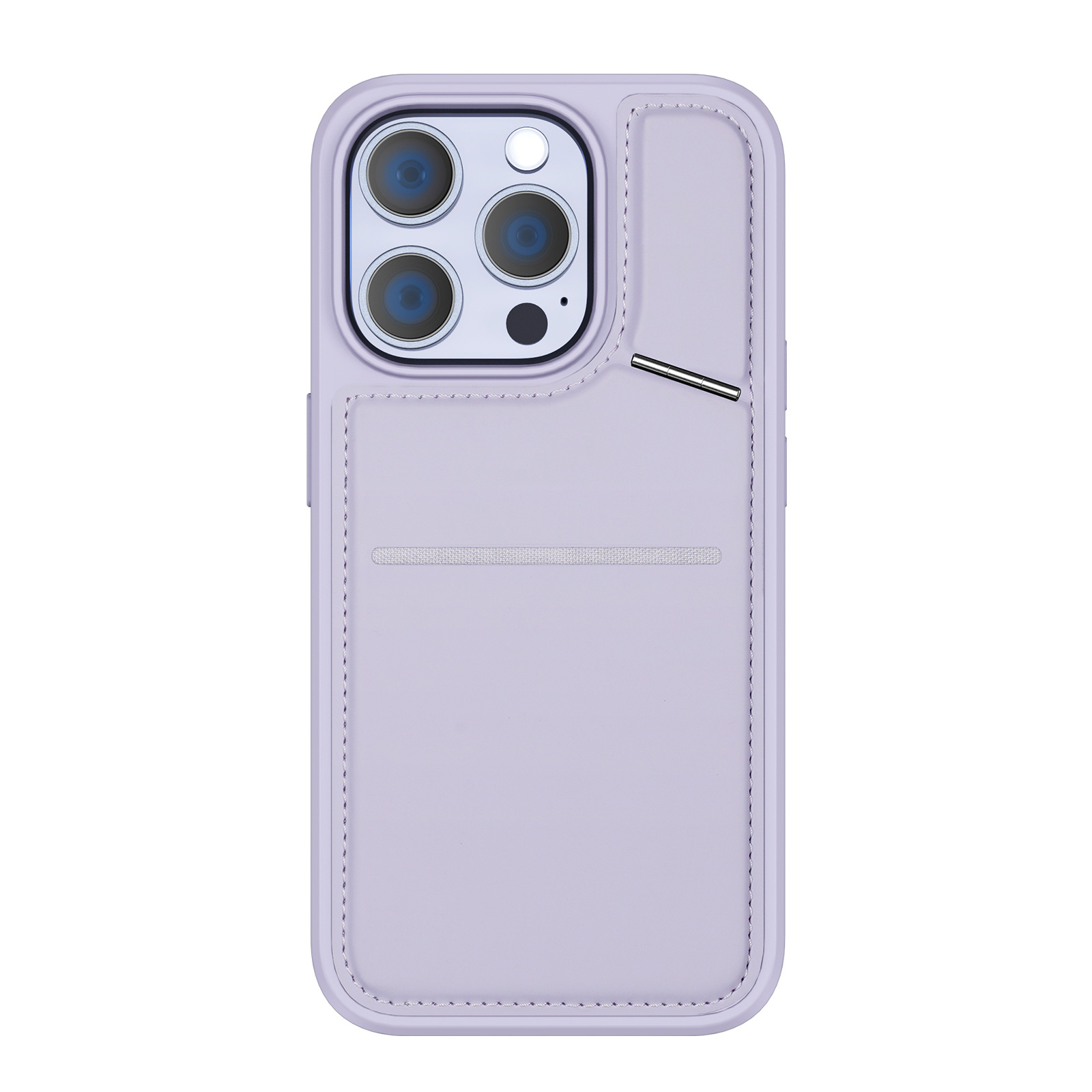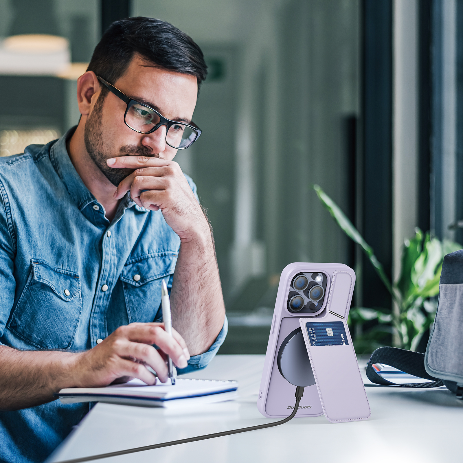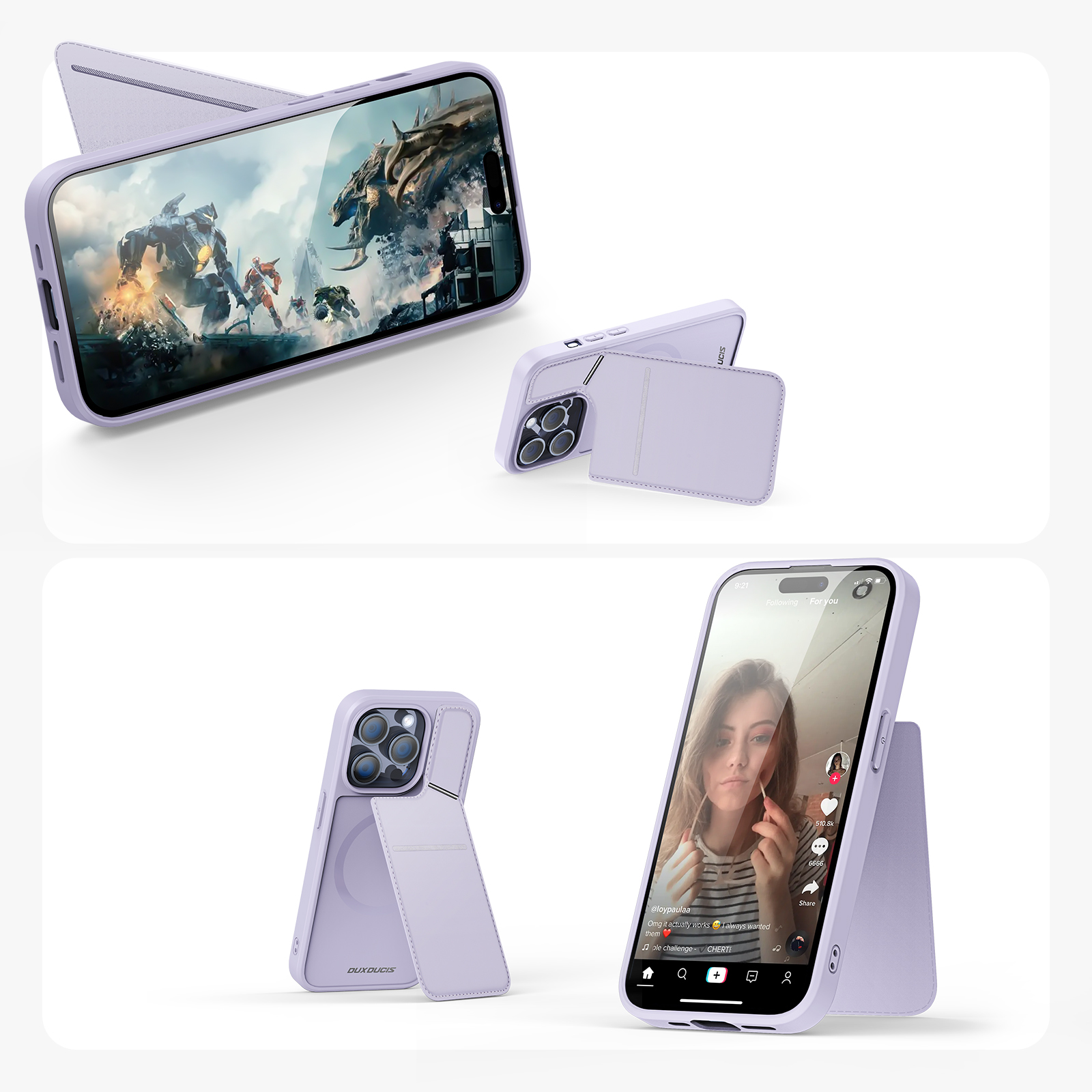 Чехол фиолетового цвета с картхолдером и откидной подставкой от Dux Ducis для iPhone 13 Pro, серия Rafi II Mag Series Case (версия с поддержкой MagSafe). Задняя часть этого чехла покрыта слоем гладкой кожи. Он имеет два держателя для карт, один снаружи и один внутри, внутренний имеет функцию защиты от кражи.