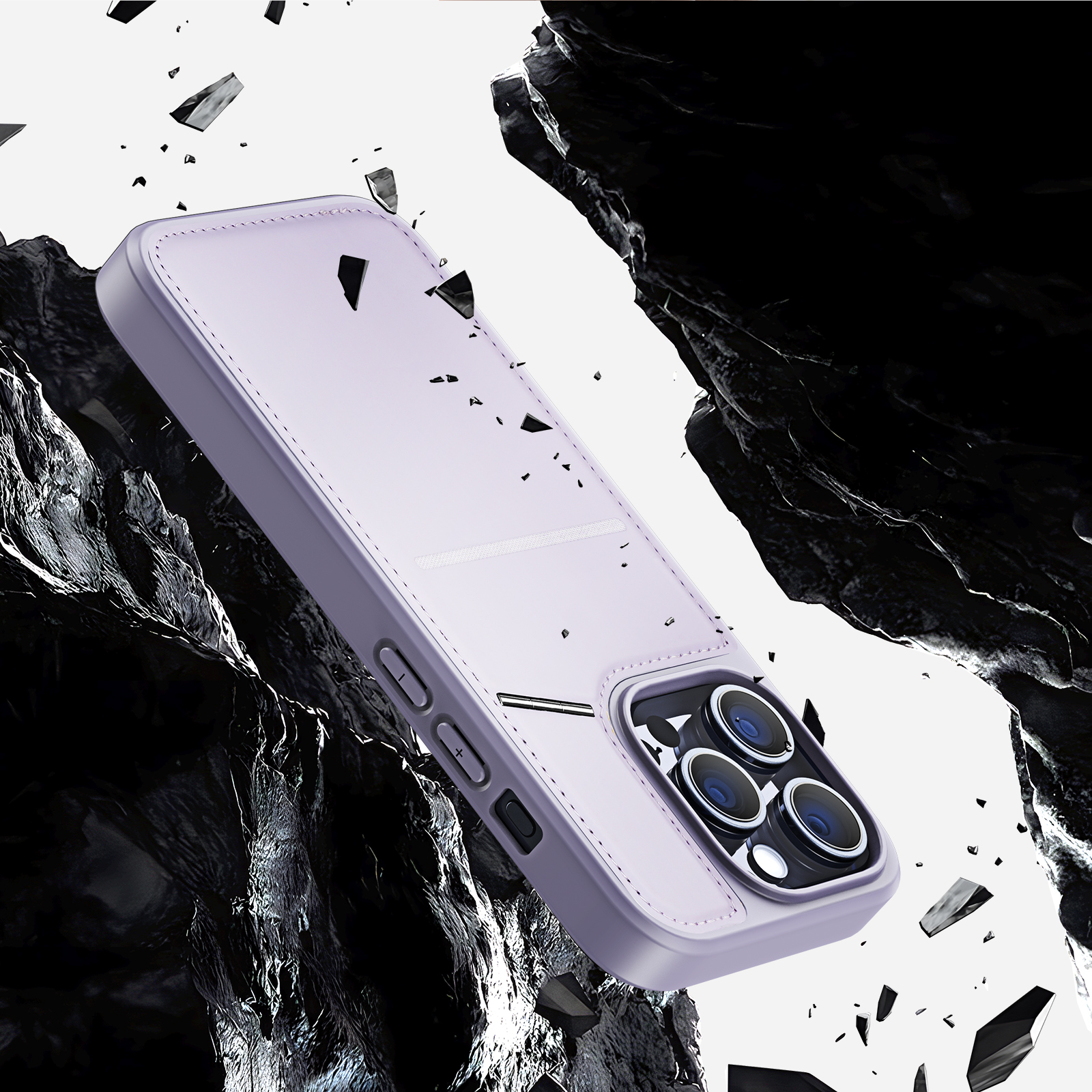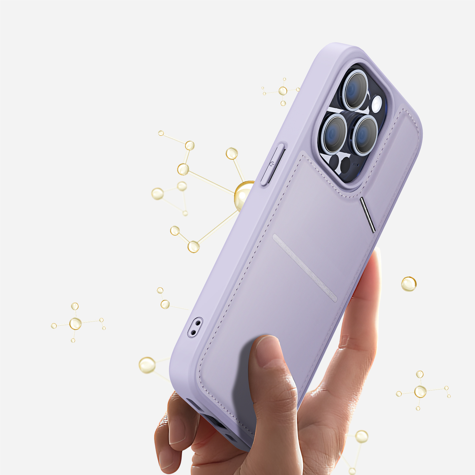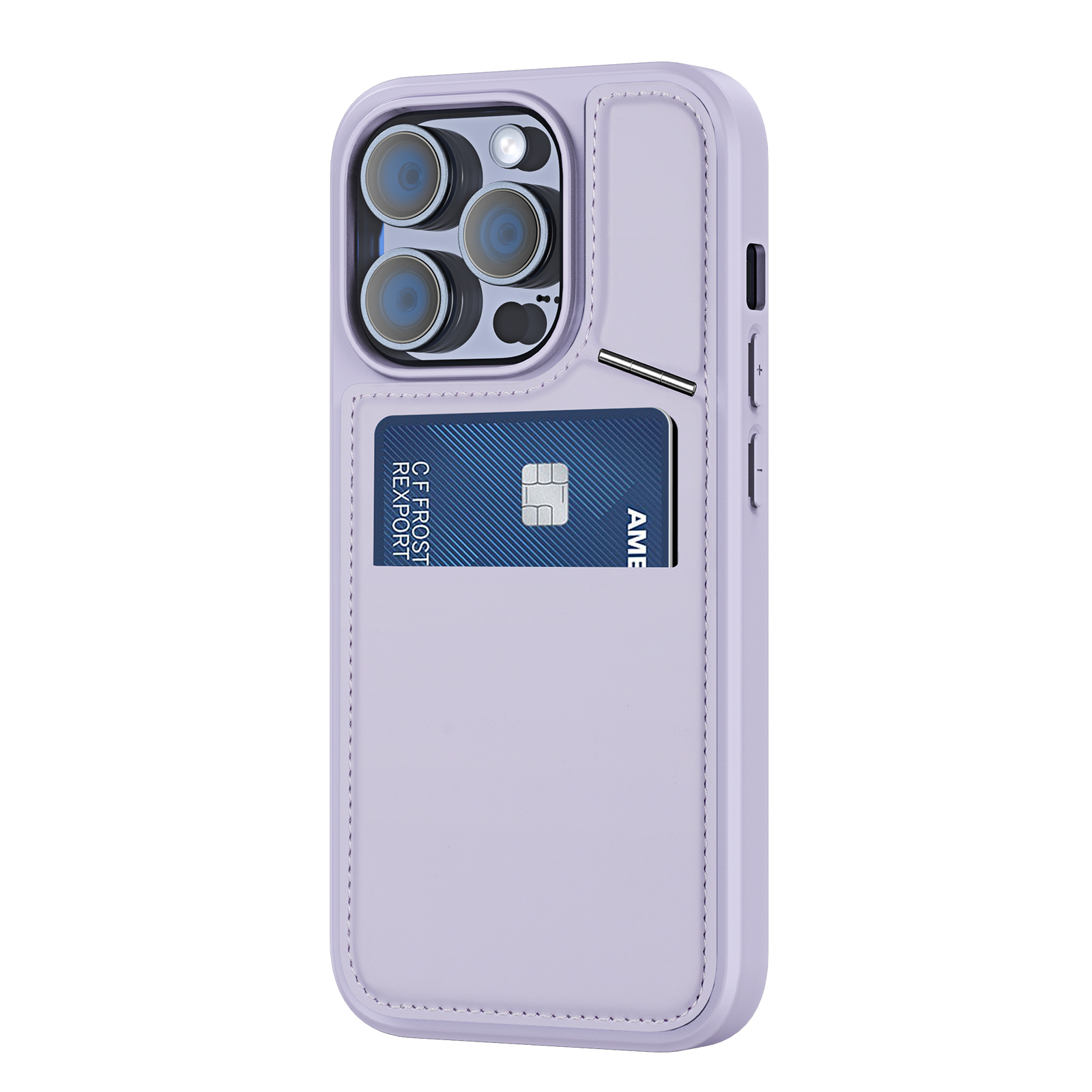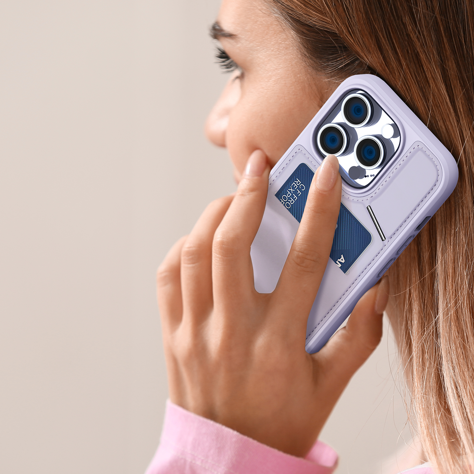 Чехол фиолетового цвета с картхолдером и откидной подставкой от Dux Ducis для iPhone 13 Pro, серия Rafi II Mag Series Case (версия с поддержкой MagSafe). Задняя часть этого чехла покрыта слоем гладкой кожи. Он имеет два держателя для карт, один снаружи и один внутри, внутренний имеет функцию защиты от кражи.
