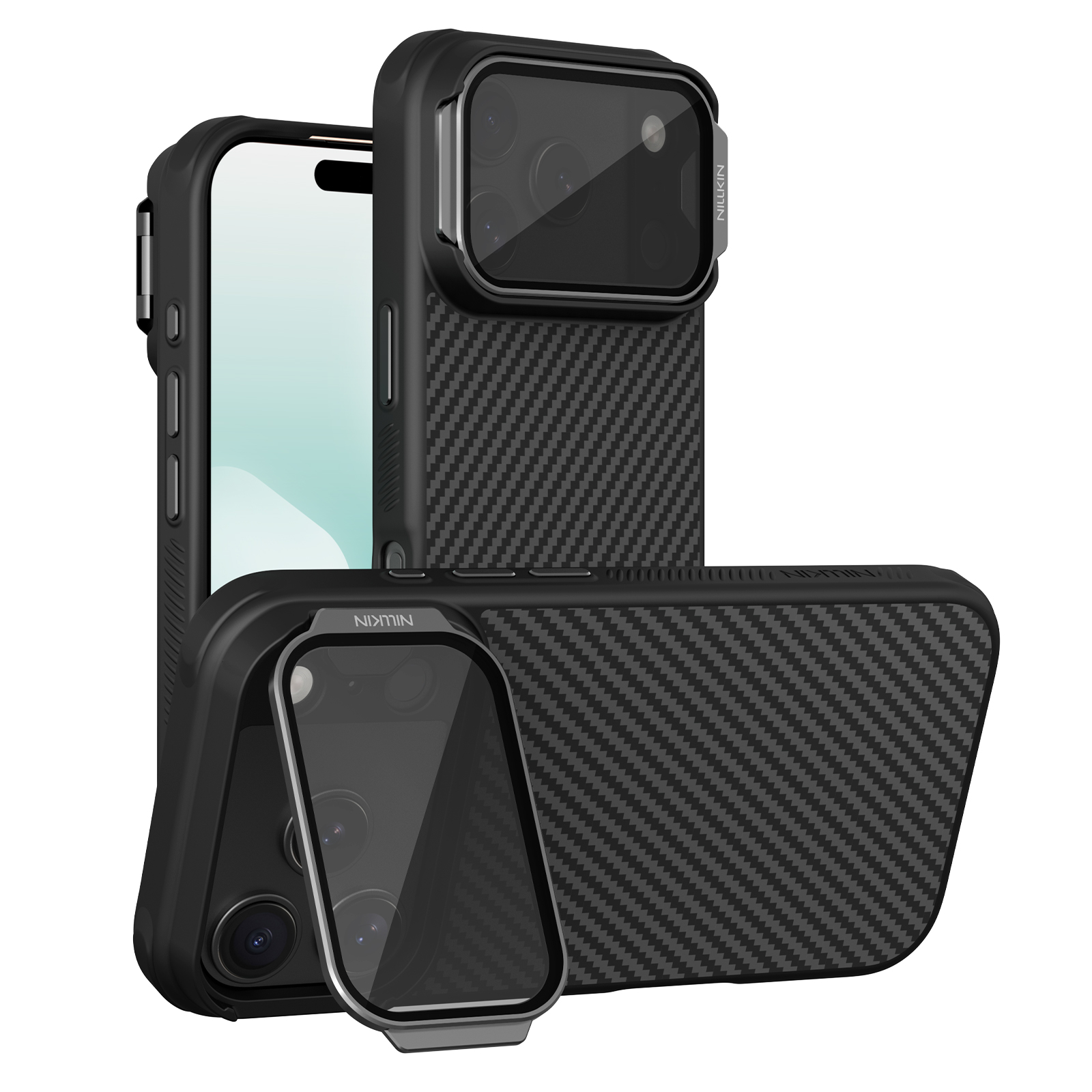 Чехол из карбона с прозрачной откидной крышкой для камеры от Nillkin серии CarboProp Magnetic Case (версия с тонированной крышкой объектива) и с функцией поддержки магнитной зарядки MagSafe для телефона iPhone 17 Pro.