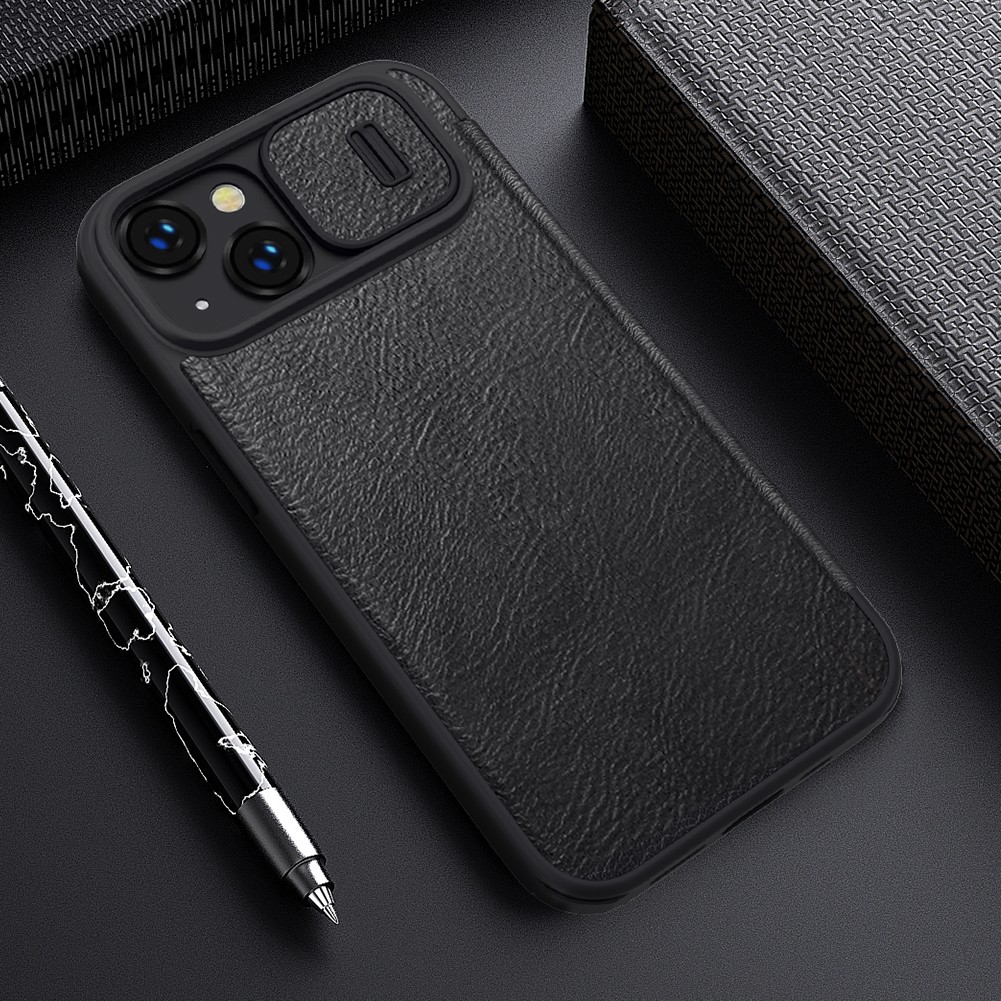 Ударопрочный устойчивый к царапинам и нескользящий чехол книжка от Nillkin серии Qin Pro Leather черного цвета на телефон iPhone 13 и iPhone 14, с защитной шторкой для задней камеры