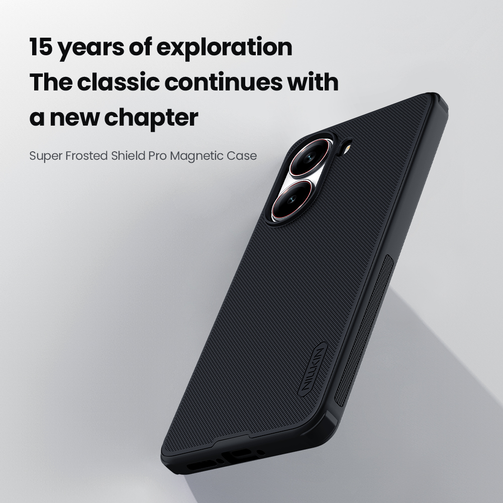Защитный чехол черного цвета от Nillkin серии Super Frosted Shield Pro Magnetic для смартфона Xiaomi Redmi Turbo 4 с усиленными боковыми рамками по четырем углам и встроенным магнитом, изготавливается из экологичных материалов PC и TPU путем высокоточного литья под давление с высокой температурой.