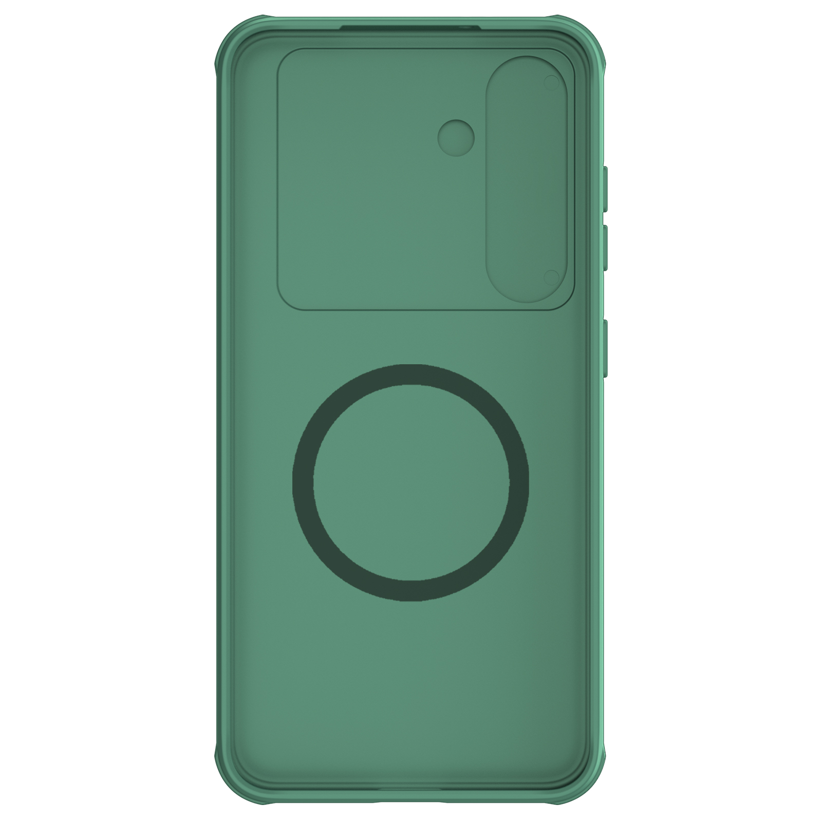 Противоударный чехол зеленого цвета (Deep Green) с защитной крышкой для задней камеры и встроенным круглым магнитом от Nillkin серии CamShield Pro Magnetic Case для смартфона Samsung Galaxy S24.