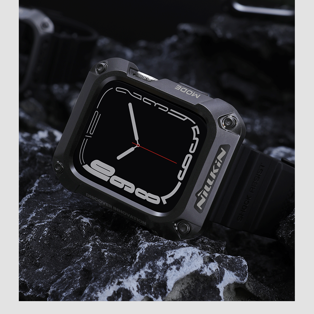 Металлический черный бампер-чехол для смарт часов Apple Watch Series 7 и 8, 45мм, в комплекте с мягким усиленным ремешком из ТПУ с двойным замком для максимальной надежности.