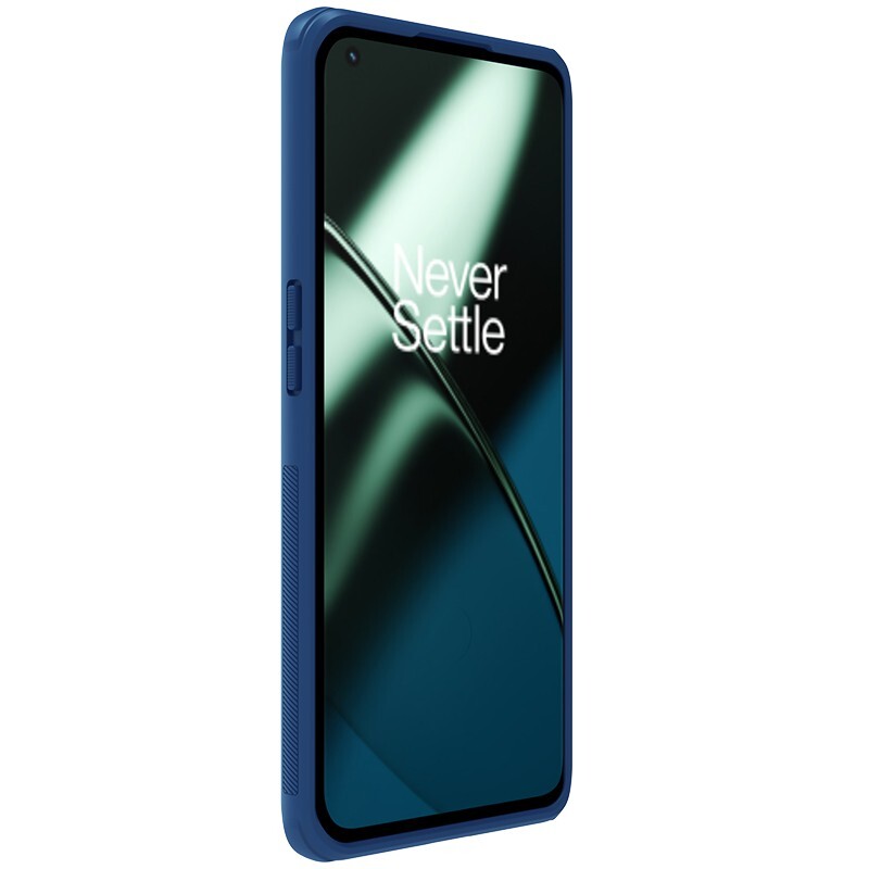 Защитный чехол синего цвета от Nillkin серии Super Frosted Shield для смартфона OnePlus Ace 2 и 11R с усиленными боковыми рамками по четырем углам, изготавливается из экологичных материалов PC и TPU путем высокоточного литья под давление с высокой температурой.
