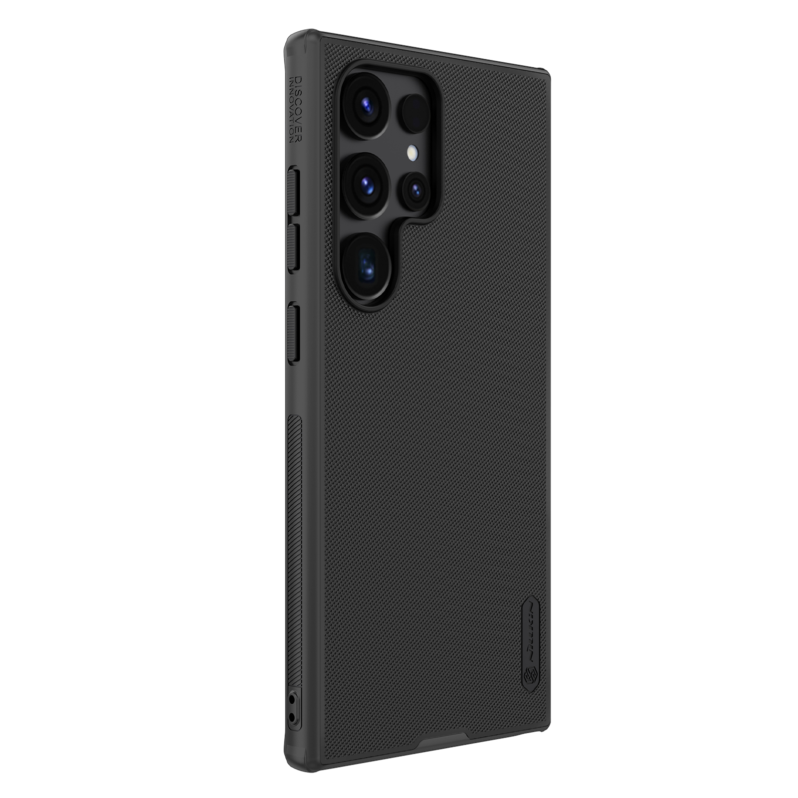 Усиленный защитный чехол черного цвета от Nillkin серии Super Frosted Shield для смартфона Samsung Galaxy S24 Ultra с усиленными боковыми рамками по четырем углам, изготавливается из экологичных материалов PC и TPU путем высокоточного литья под давление с высокой температурой.