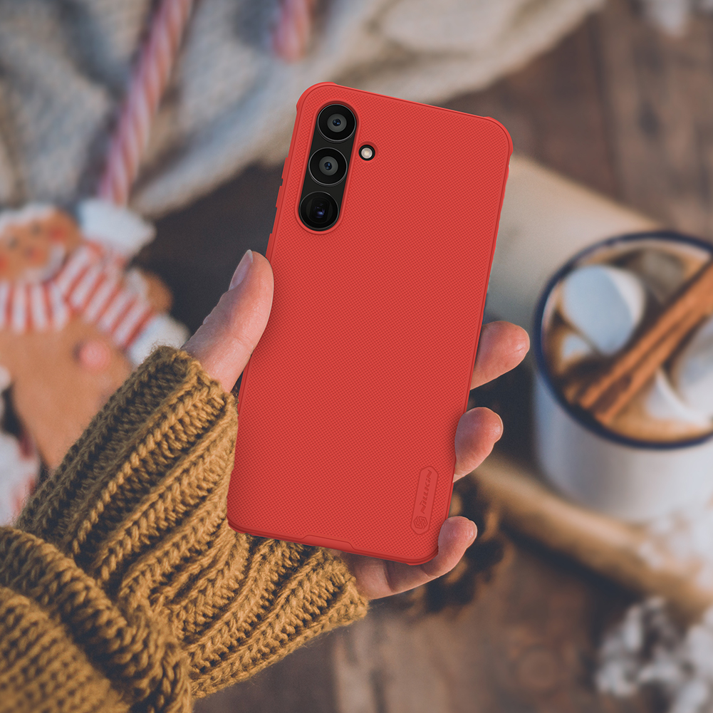 Усиленный защитный чехол красного цвета от Nillkin серии Super Frosted Shield для смартфона Samsung Galaxy A55 с усиленными боковыми рамками по четырем углам, изготавливается из экологичных материалов PC и TPU путем высокоточного литья под давление с высокой температурой.