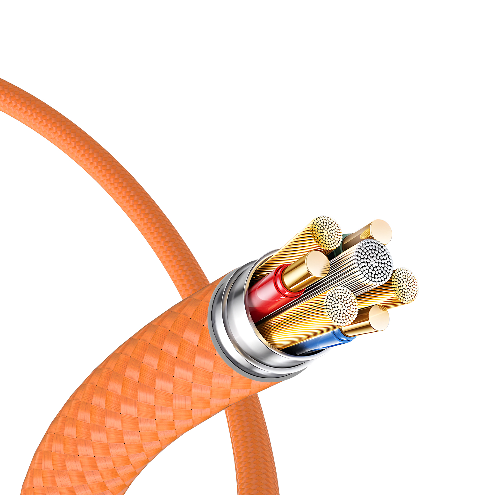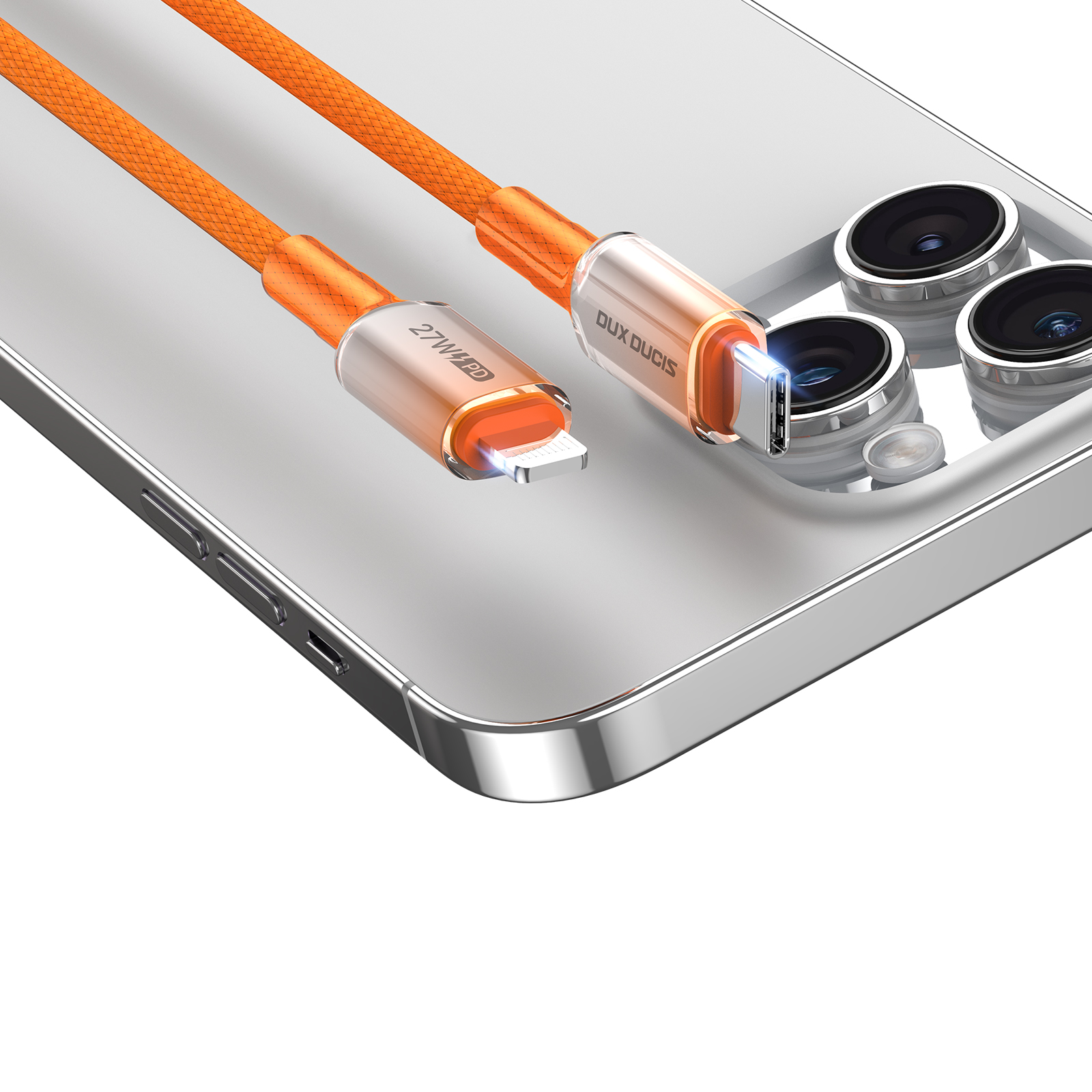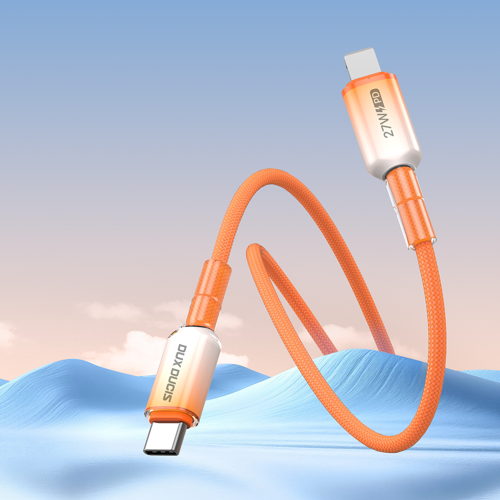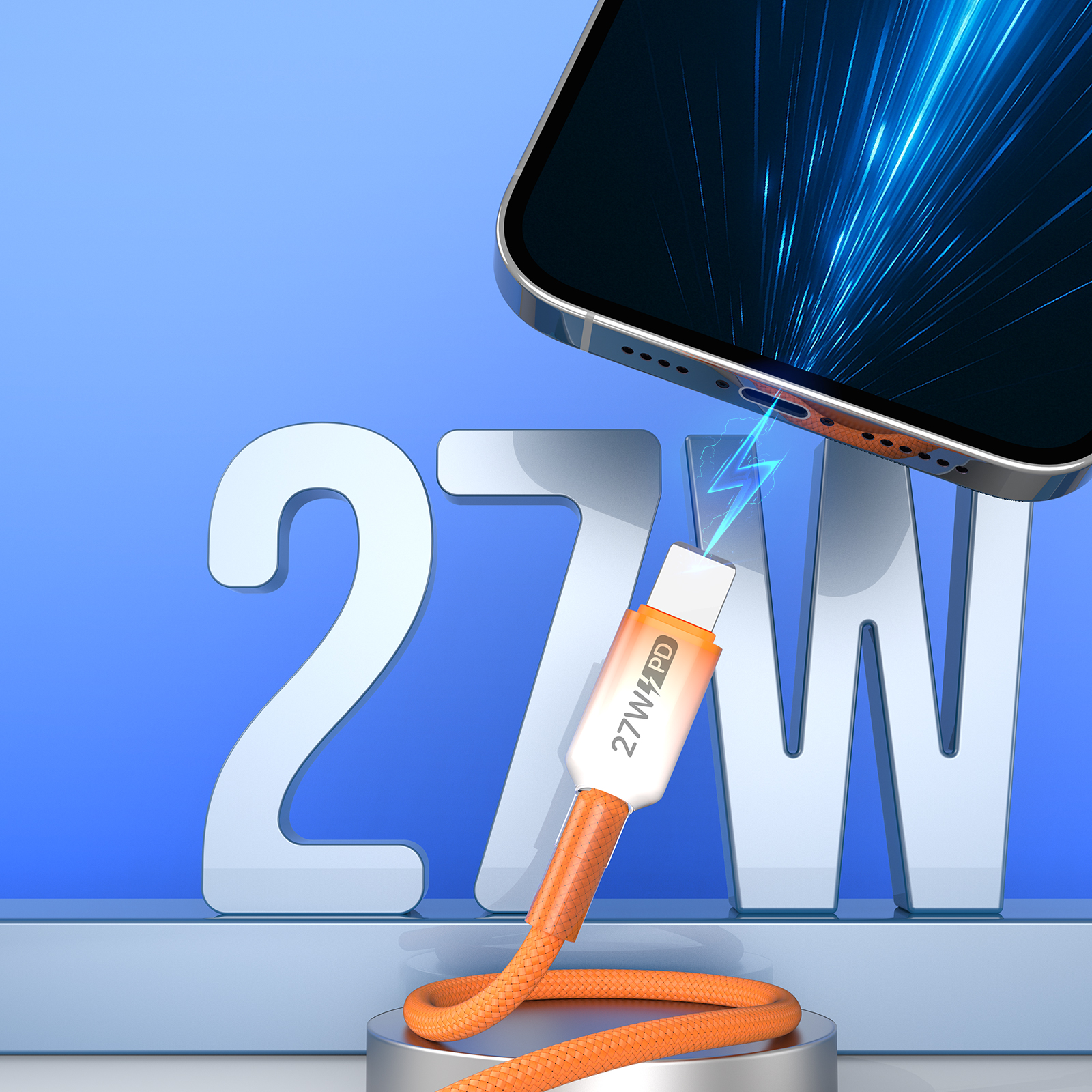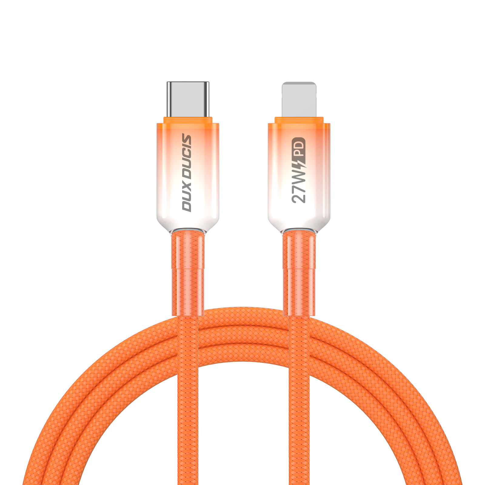 Быстрая зарядка 27 Вт, Заряжает iPhone до 50% за 30 минут на полной скорости. Оранжевый нейлон высокой плотности выдерживает более 10 000 изгибов для длительного использования. Быстрая синхронизация 480 Мбит/с для передача файлов во время зарядки устройства. Градиентный дизайн разъем оранжевого цвета.