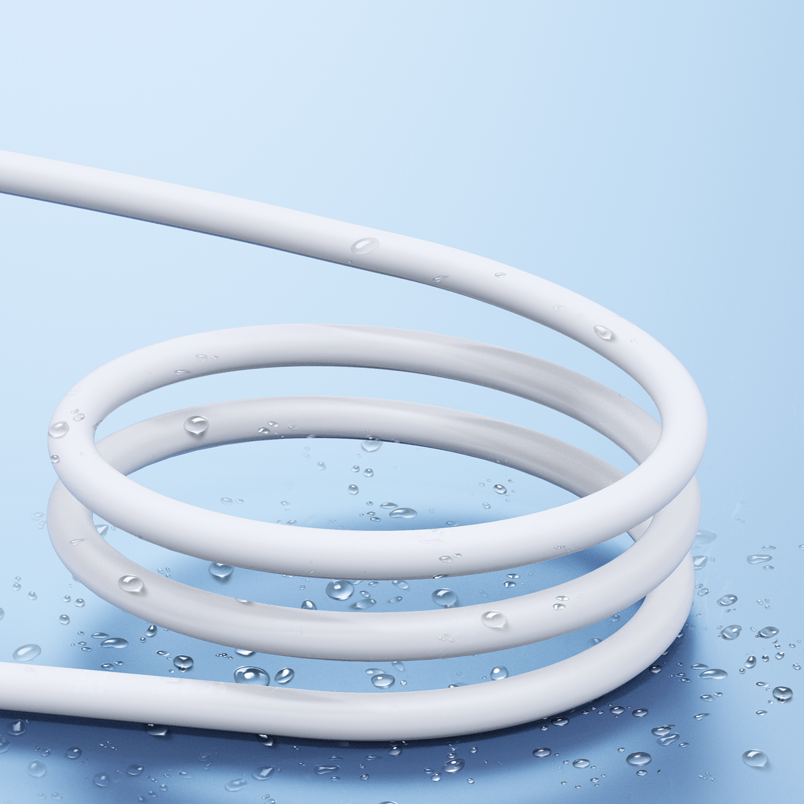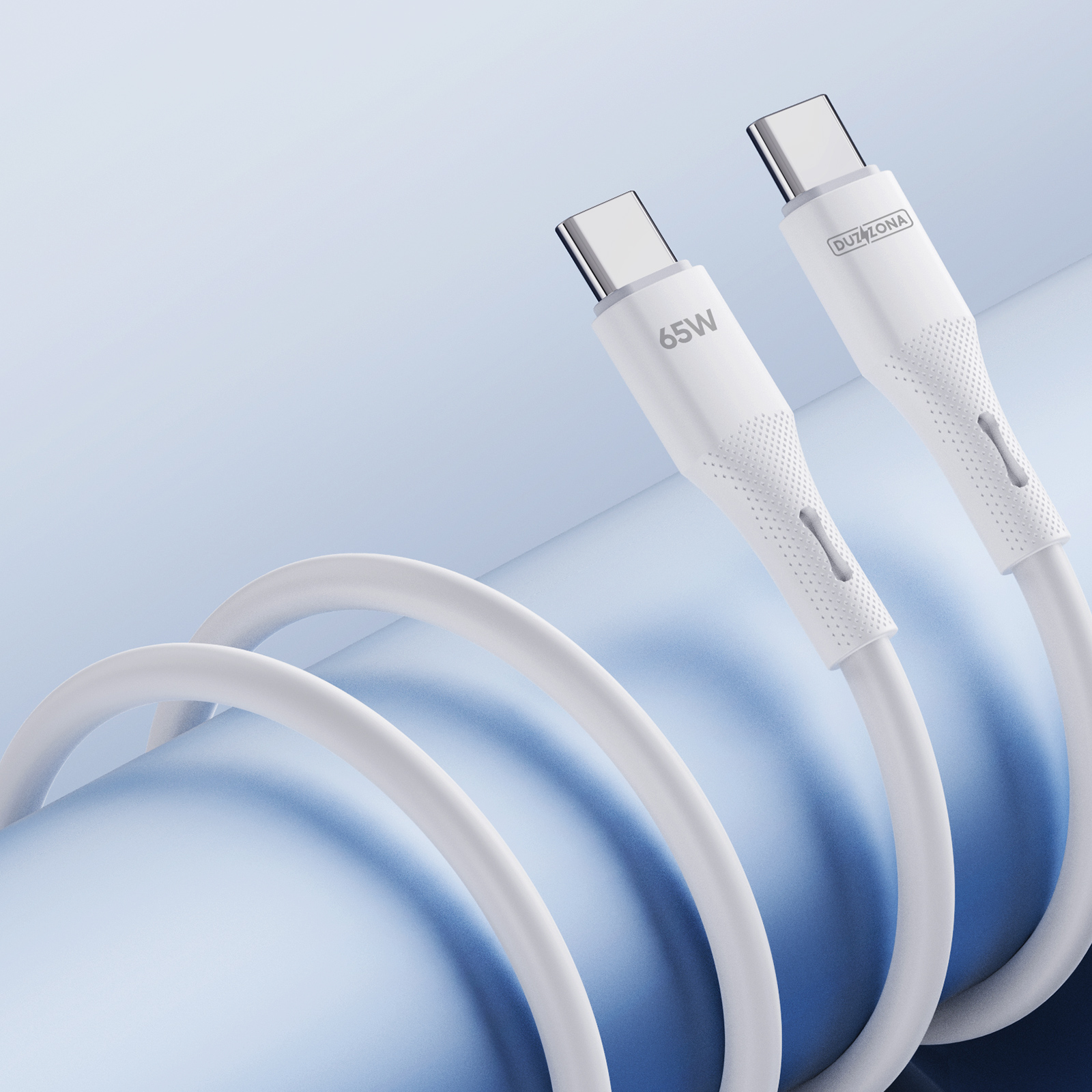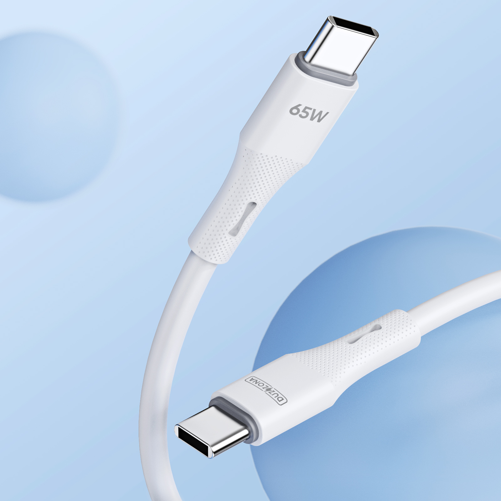 Кабель покрытый силиконом белого цвета 100см с разъемом Type C-Type C с быстрой зарядкой PD 65W от Duzzona, серия A11 Cable. Повышенная устойчивость к изгибу благодаря интегрированному процессу литья под давлением и армированию хвостовой части сеткой