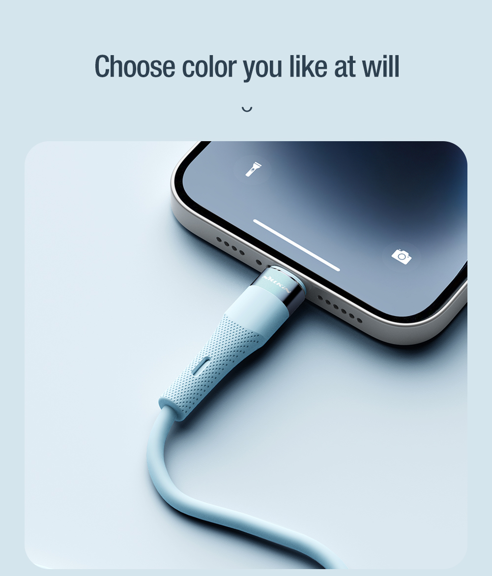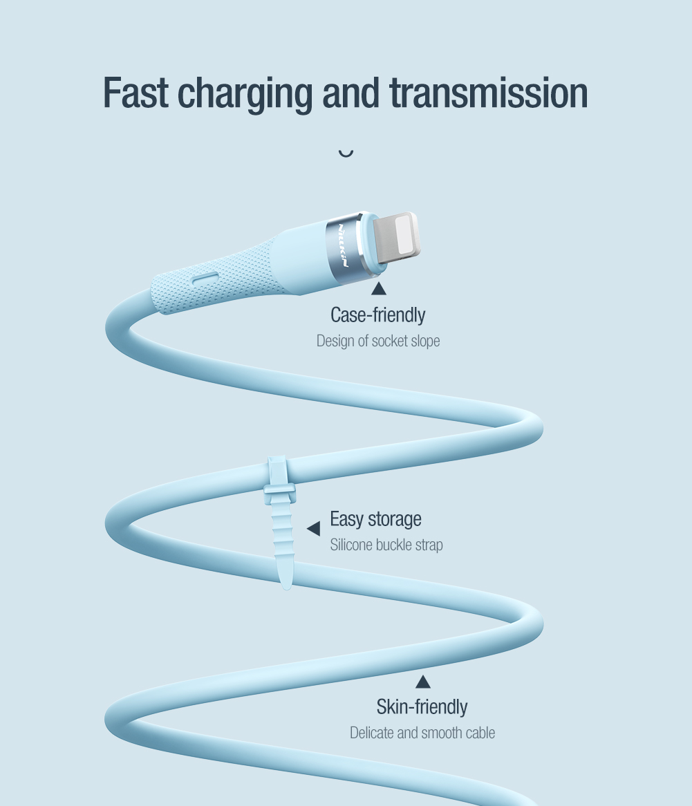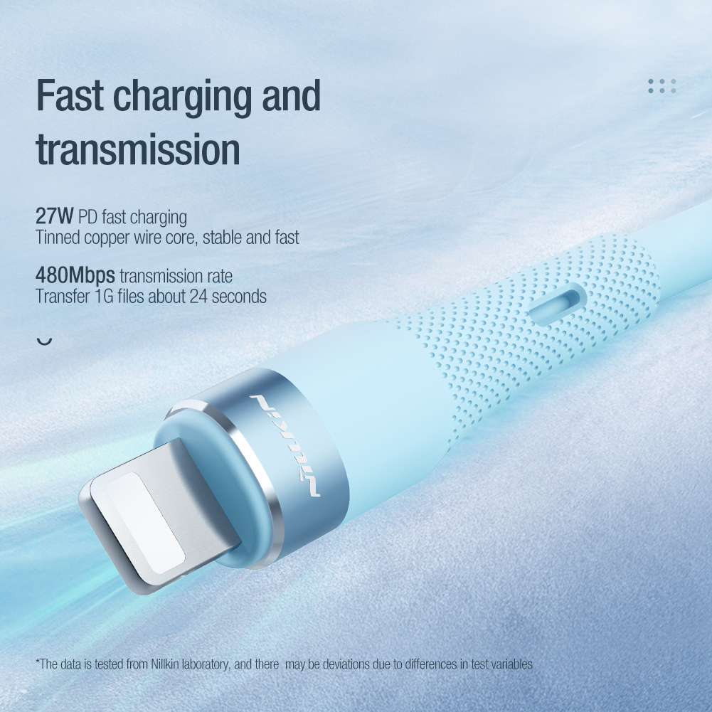 Кабель для iPhone с поддержкой быстрой зарядки PD 27W от Nillkin серия Flowspeed Liquid Silicone Cable из жидкого силикона синего цвета. Повышенная устойчивость к изгибу благодаря интегрированному процессу литья под давлением и армированию хвостовой части сеткой