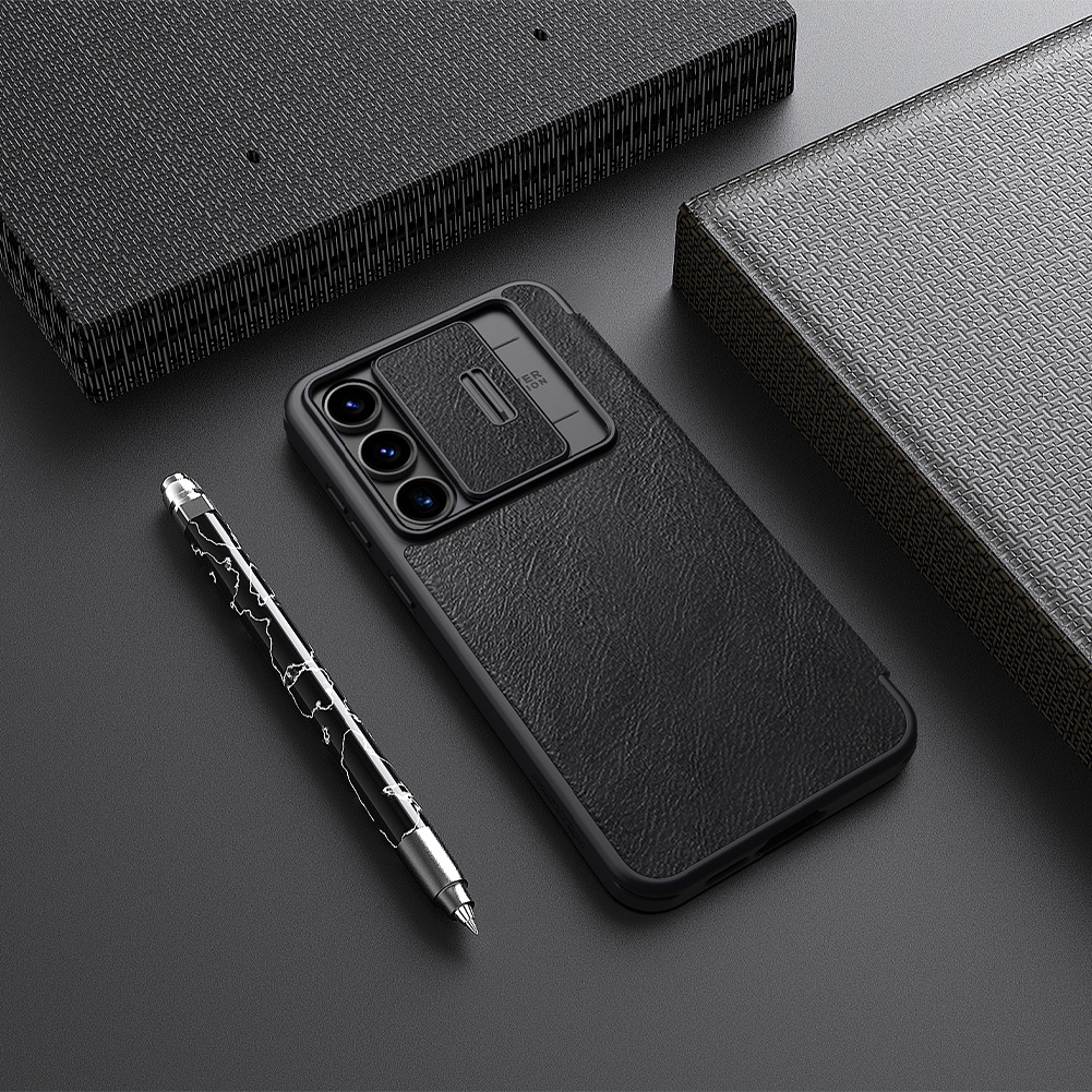 Ударопрочный, устойчивый к царапинам и нескользящий чехол книжка от Nillkin Qin Pro Leather черного цвета на телефон Samsung Galaxy S24 FE, с защитной шторкой для задней камеры