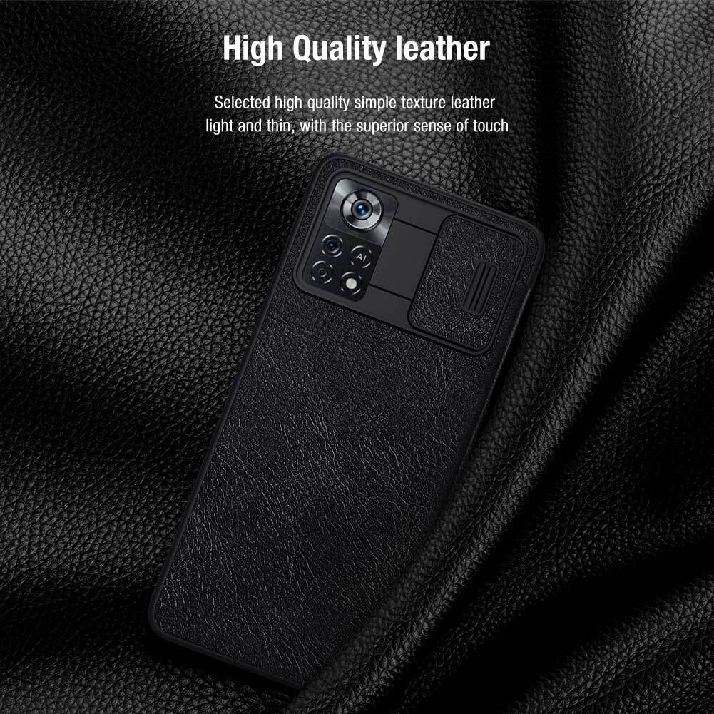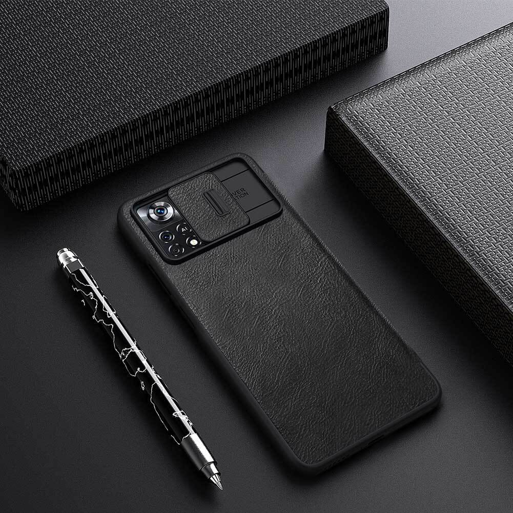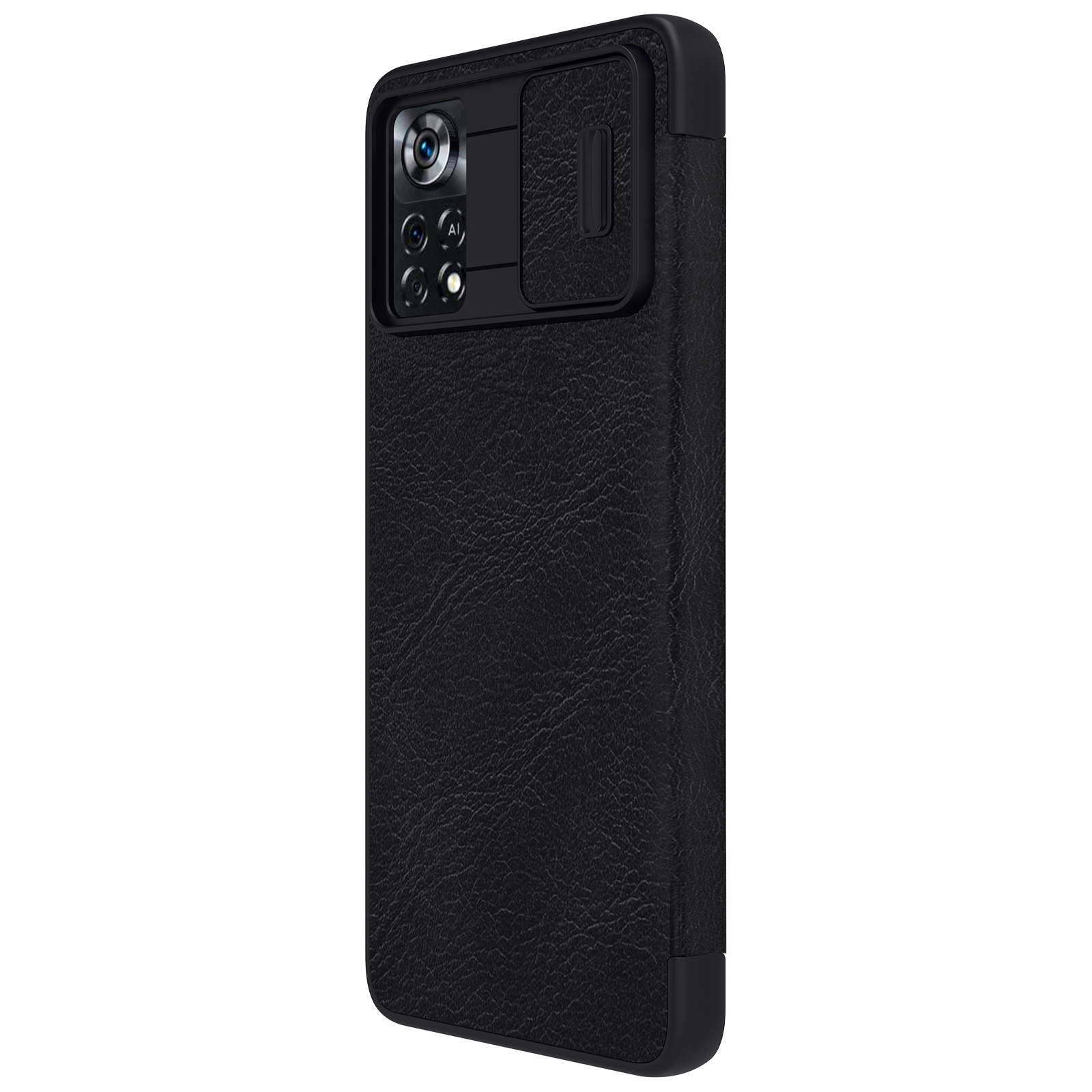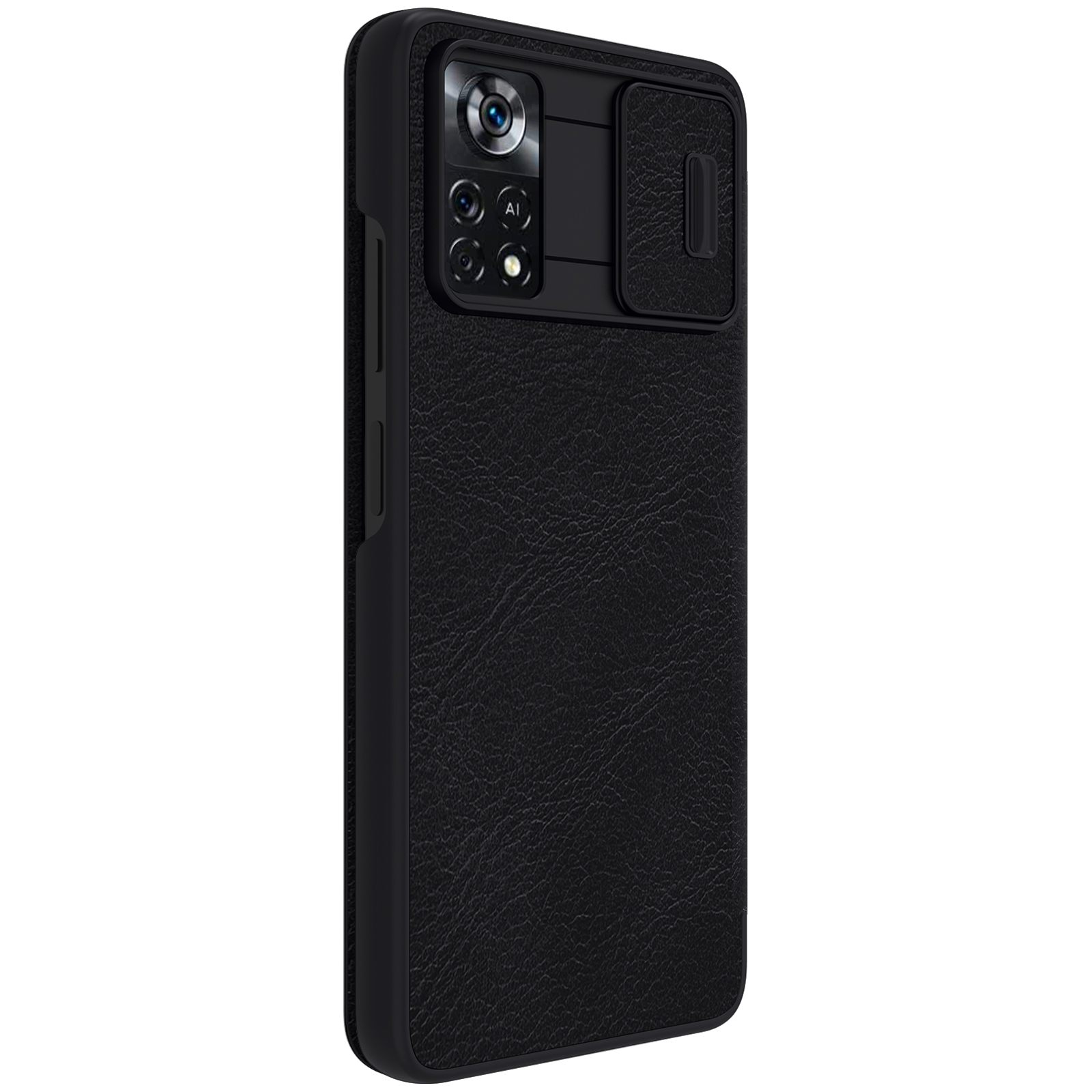 Ударопрочный, устойчивый к царапинам и нескользящий чехол книжка от Nillkin Qin Pro Leather черного цвета на телефон Xiaomi Poco X4 Pro 5G, с защитной шторкой для задней камеры