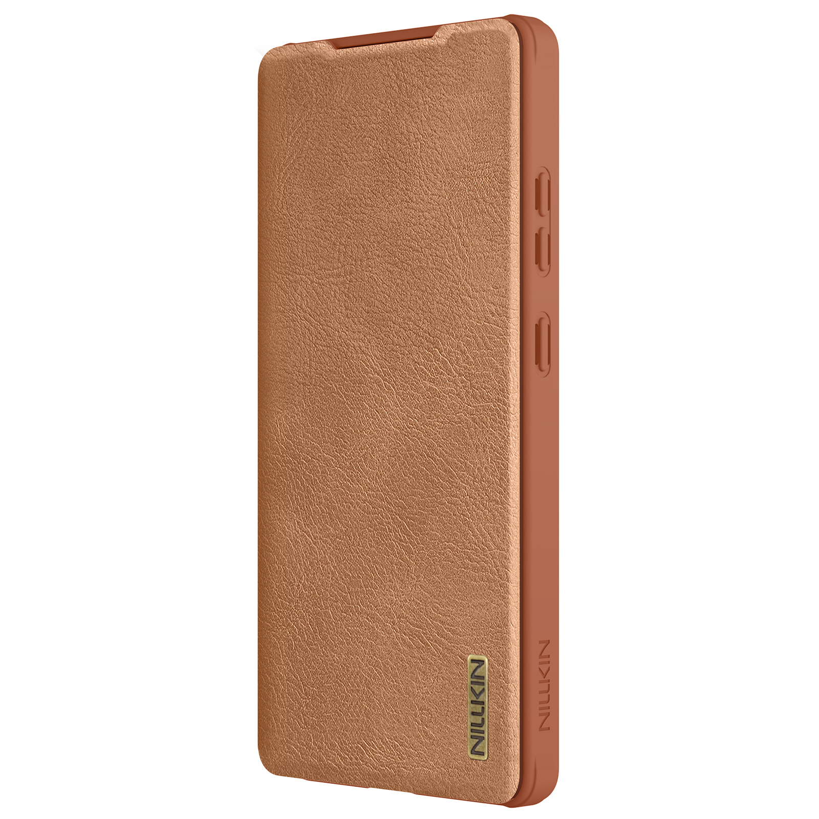 Ударопрочный, устойчивый к царапинам и нескользящий чехол книжка от Nillkin Qin Pro Leather коричневого цвета на телефон Samsung Galaxy S25 Ultra, с защитной шторкой для задней камеры