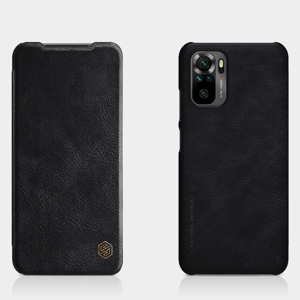 Ударопрочный, устойчивый к царапинам и нескользящий чехол книжка от Nillkin Qin Leather черного цвета на Xiaomi Redmi Note 10 и Note 10S