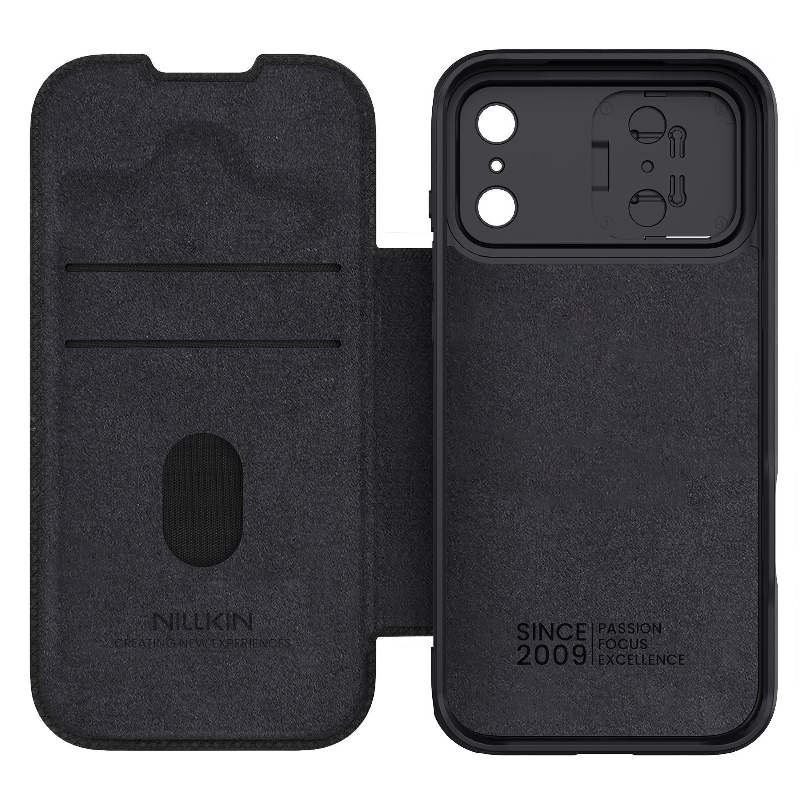 Чехол книжка от Nillkin Qin Pro Leather черного цвета на телефон iPhone 17 Pro Max, с защитной шторкой нового двойного дизайна, новая шторка позволяет открывать доступ к вспышке и датчикам Айфона 17 Про Макс!