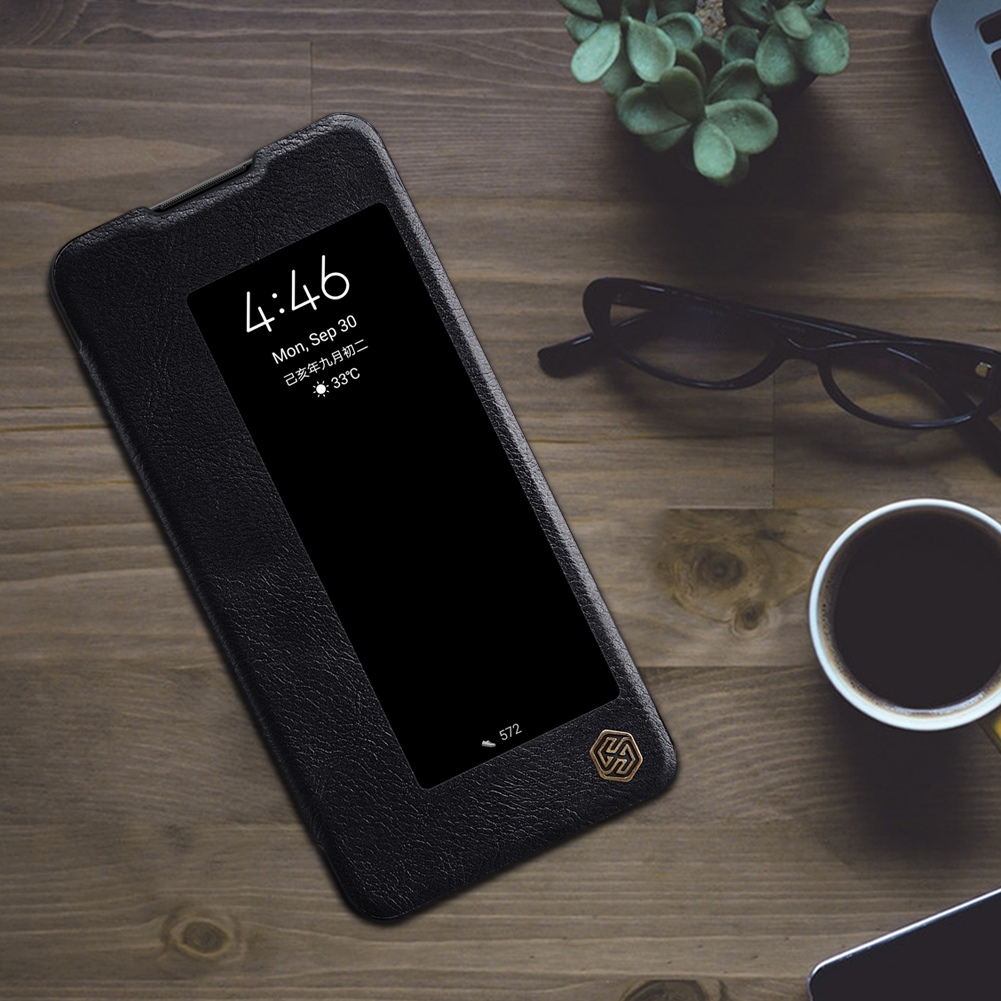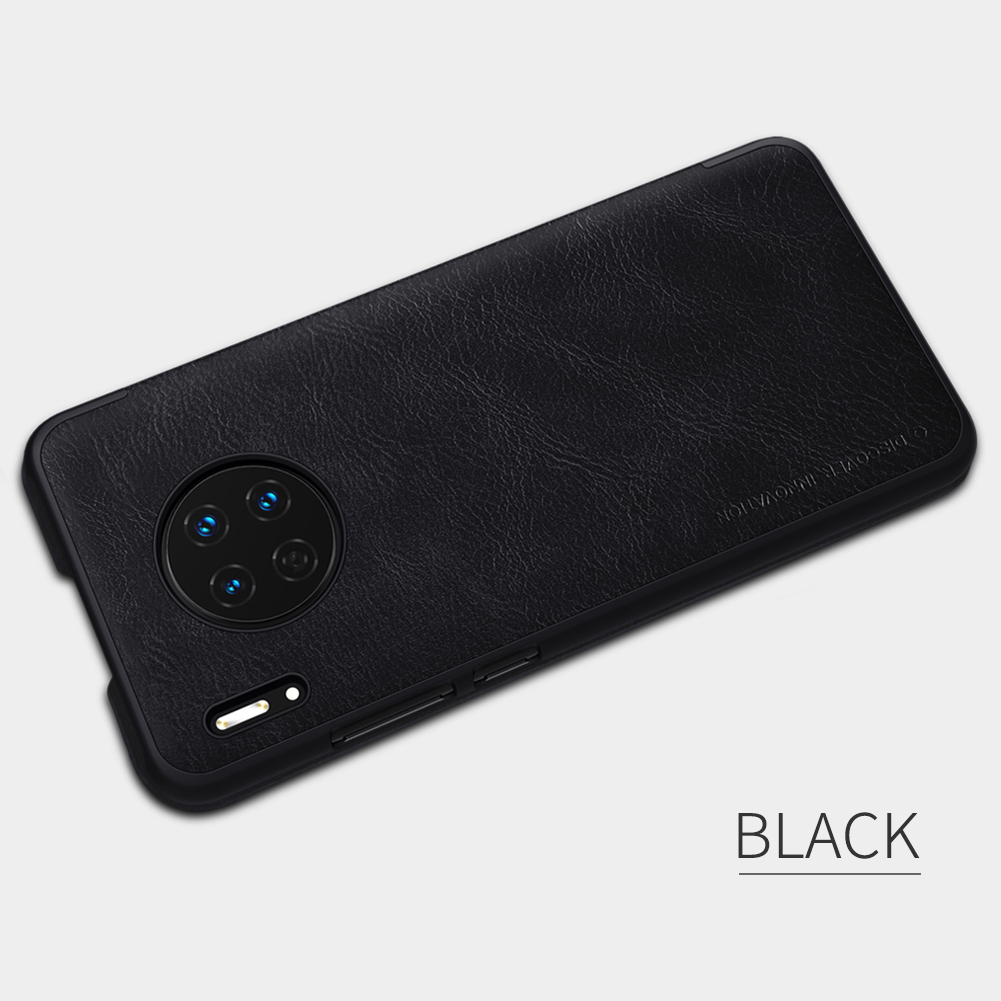 Ударопрочный устойчивый к царапинам и нескользящий чехол книжка от Nillkin серии Qin Leather черного цвета на телефон Huawei Mate 30