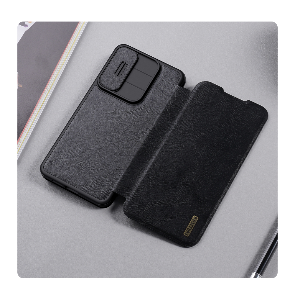 Ударопрочный, устойчивый к царапинам и нескользящий чехол книжка от Nillkin Qin Pro Leather черного цвета на телефон Samsung Galaxy S25 Edge, с защитной шторкой для задней камеры
