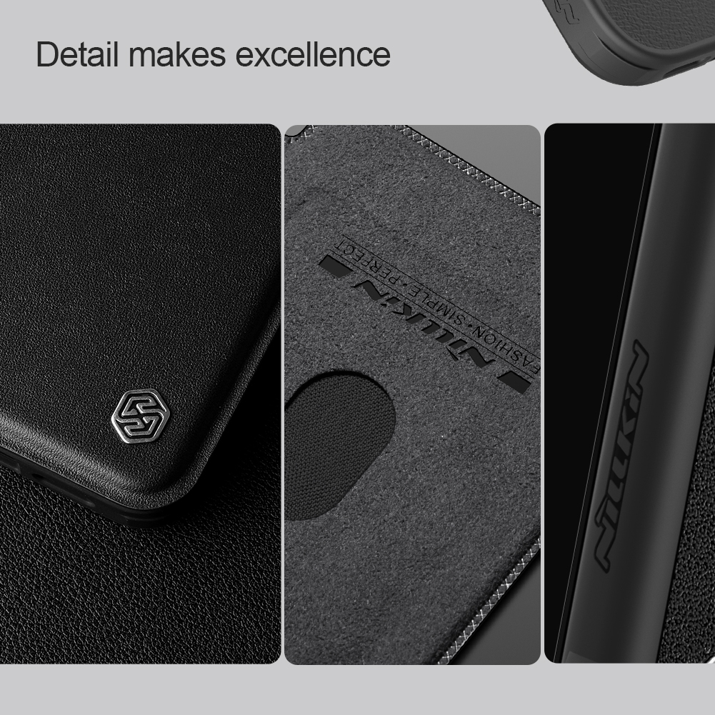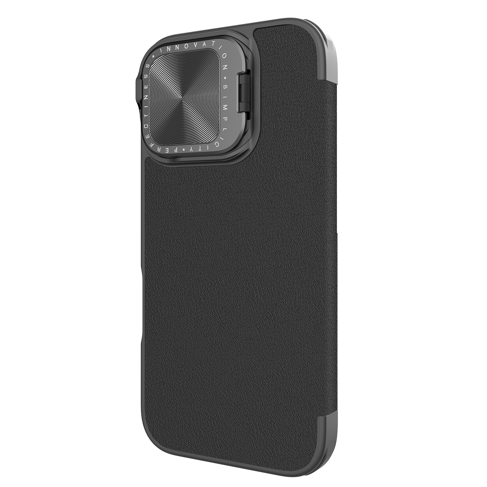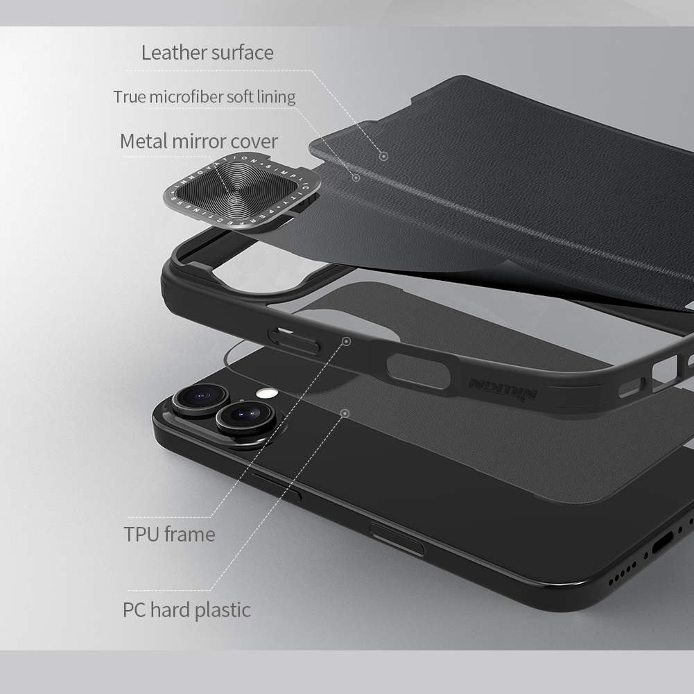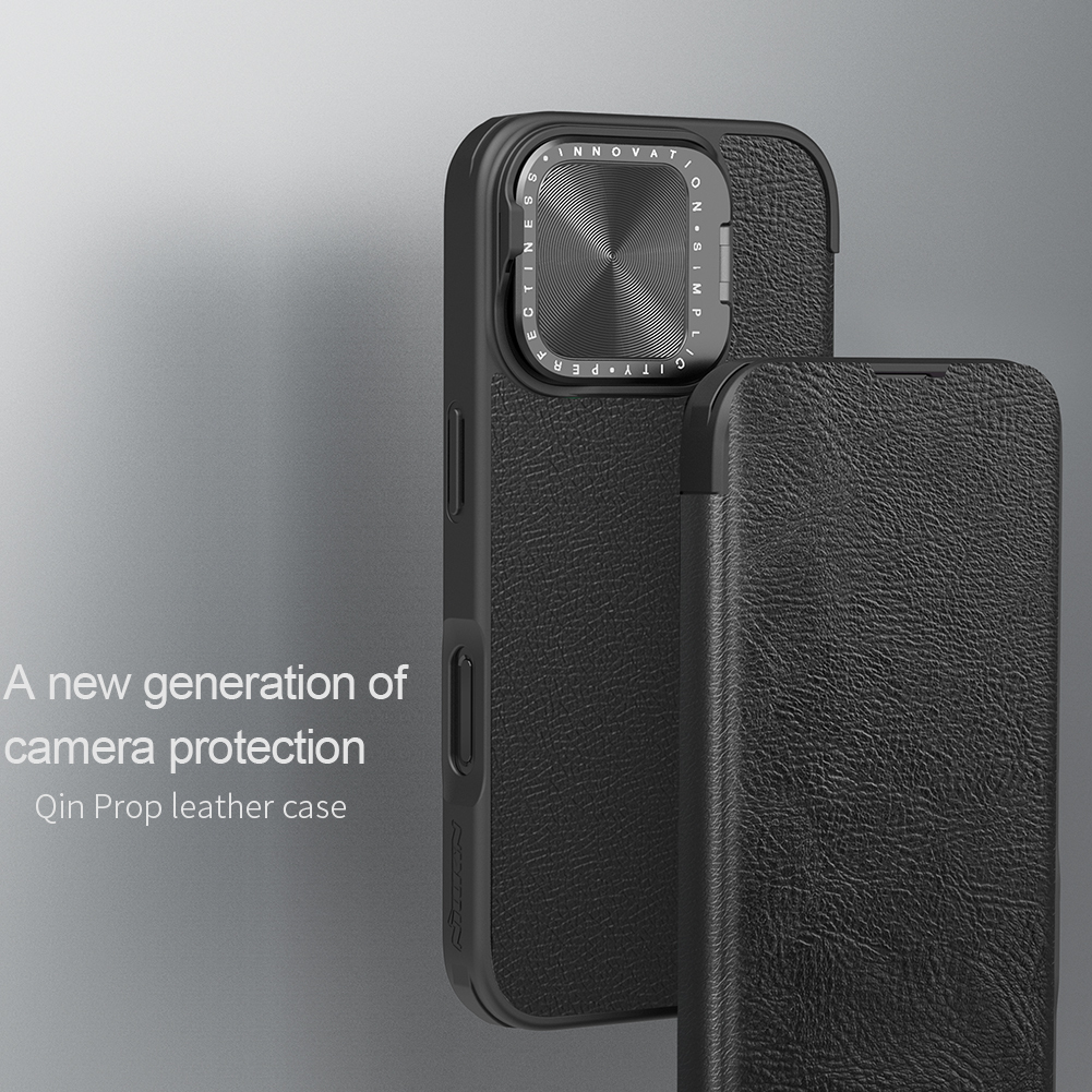 Чехол книжка от Nillkin серии Qin Prop Leather Case черного цвета на телефон iPhone 16, с откидной металлической крышкой для камеры