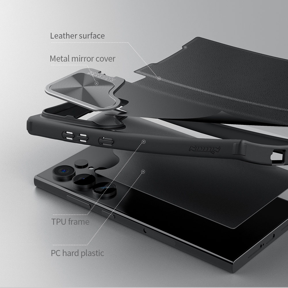 Чехол книжка от Nillkin серии Qin Prop Leather Case черного цвета на телефон Samsung Galaxy S24 Ultra, с откидной металлической крышкой для камеры