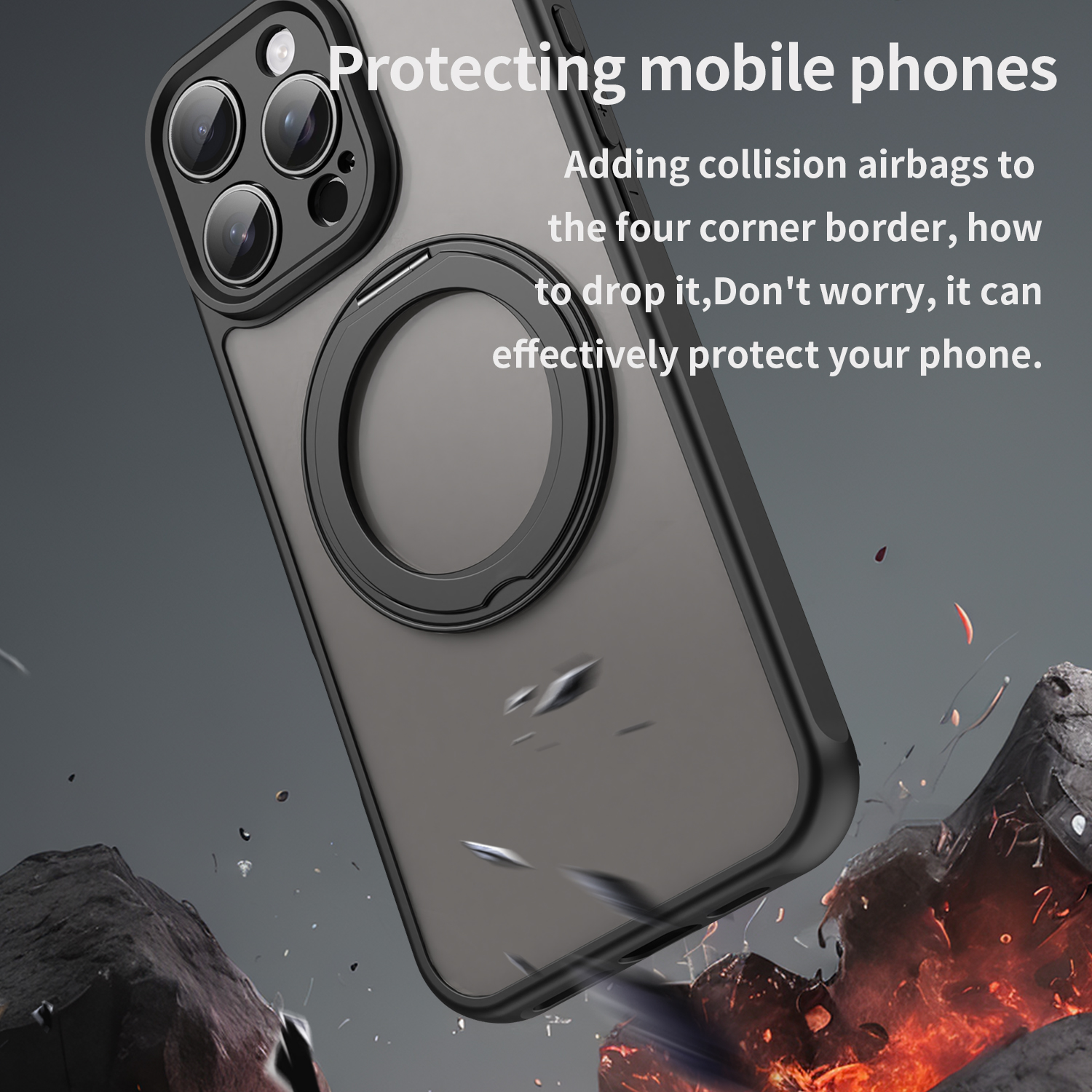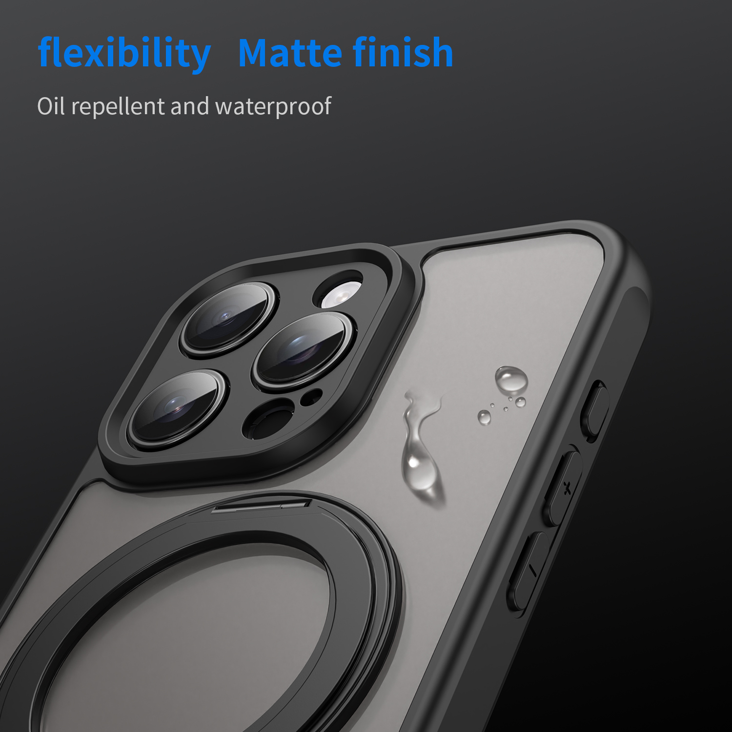 Усиленный матовый чехол черного цвета с поворотным на 360 градусов магнитным кольцом и поддержкой беспроводной зарядки MagSage для смартфона iPhone 16 Pro изготавливается из экологичных материалов путем высокоточного литья под давление с высокой температурой. Задняя стенка матовая, боковые рамки мягкие защитные черного цвета. Чехол подставка дополняется магнитным кольцом, которое можно использовать как подставка или как держатель с аксессуарами MagSafe.