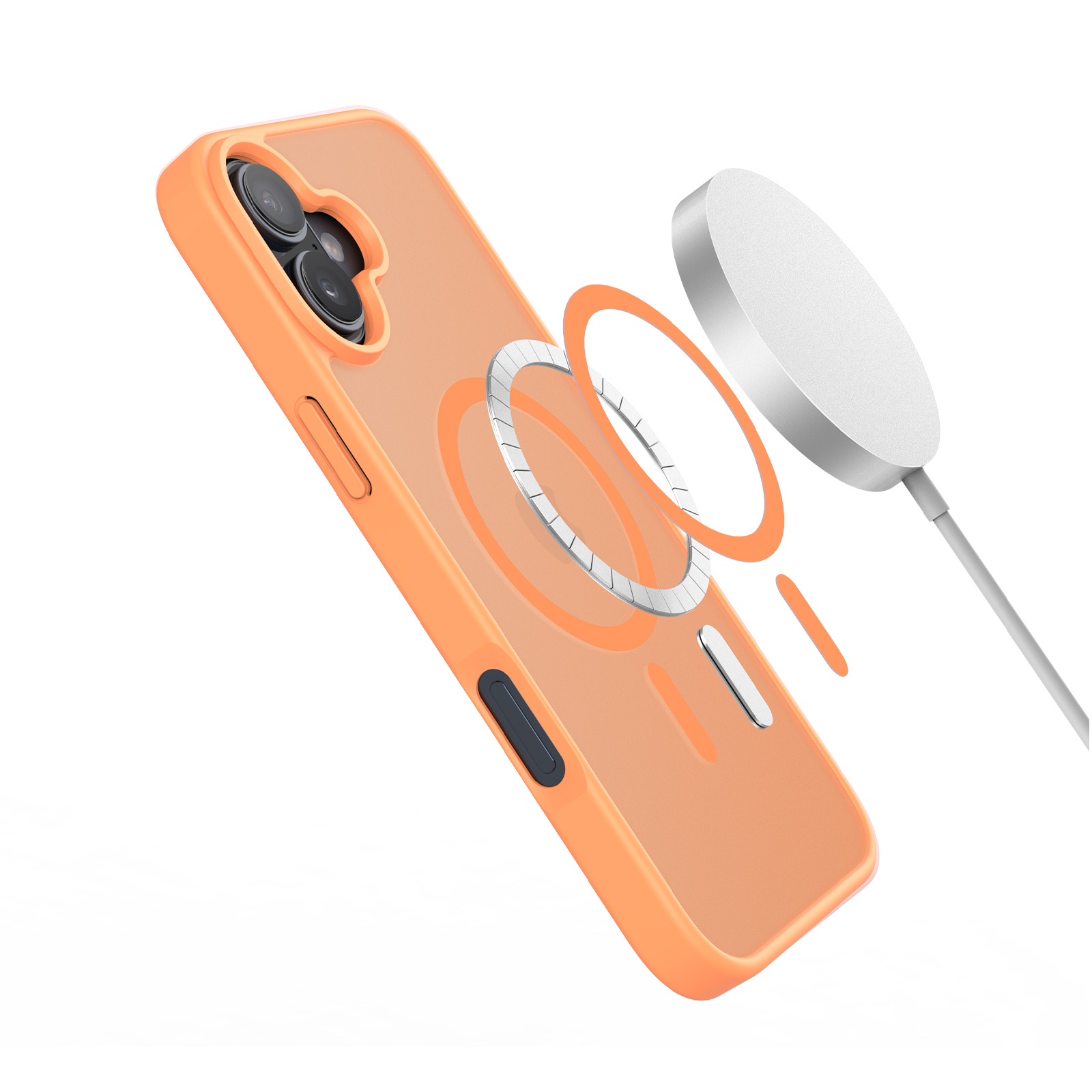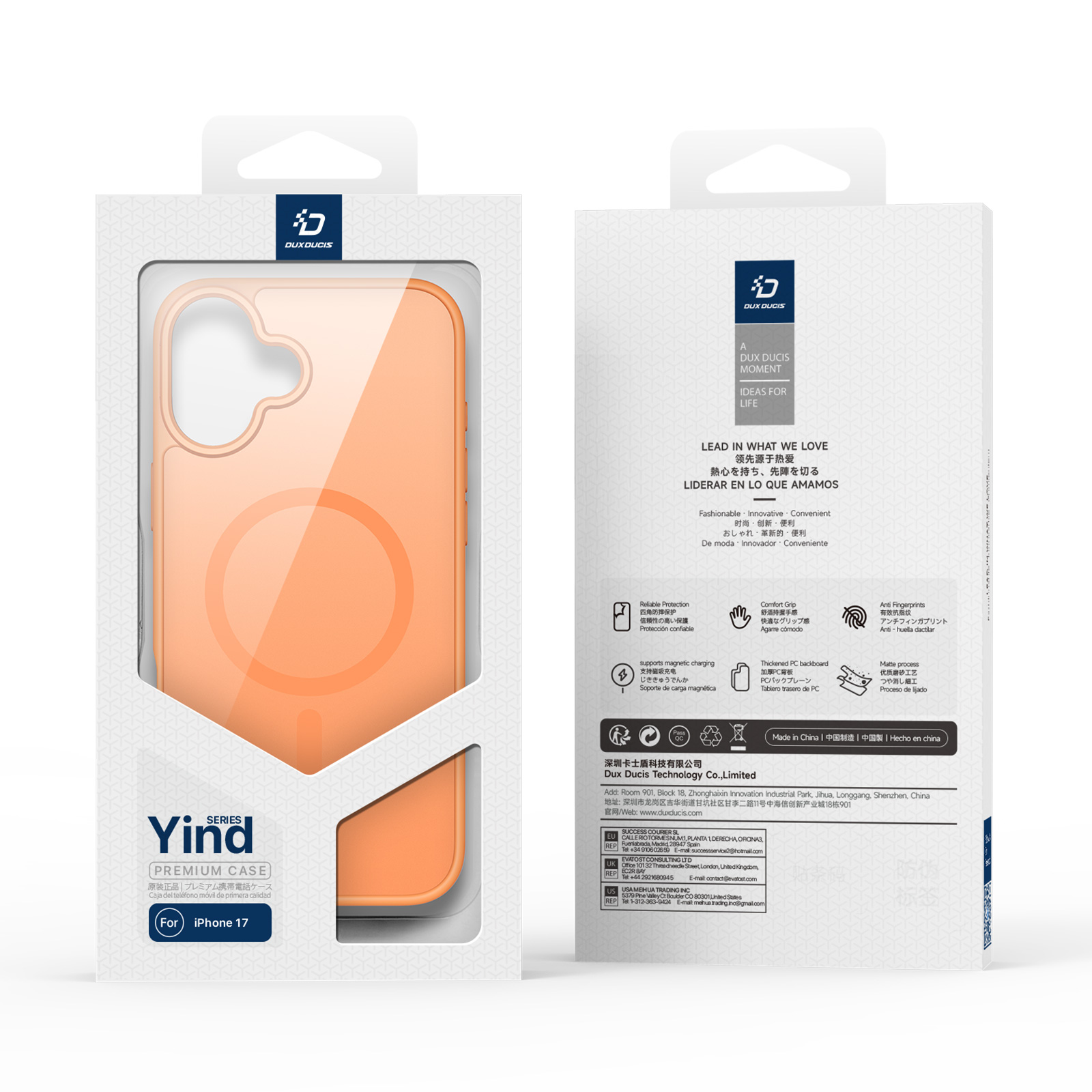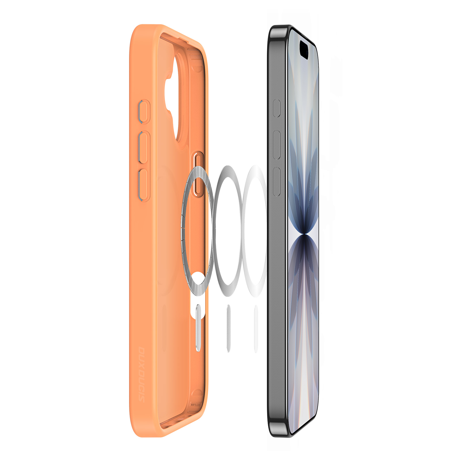 Матовый прозрачный чехол оранжевого цвета с поддержкой беспроводной зарядки MagSage от Dux Ducis серии Yind Series Case для смартфона iPhone 17 изготавливается из экологичных материалов путем высокоточного литья под давление с высокой температурой.