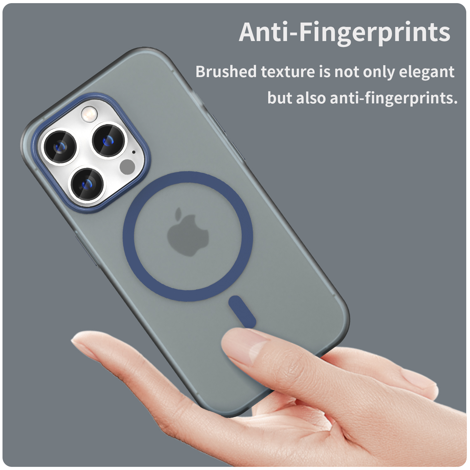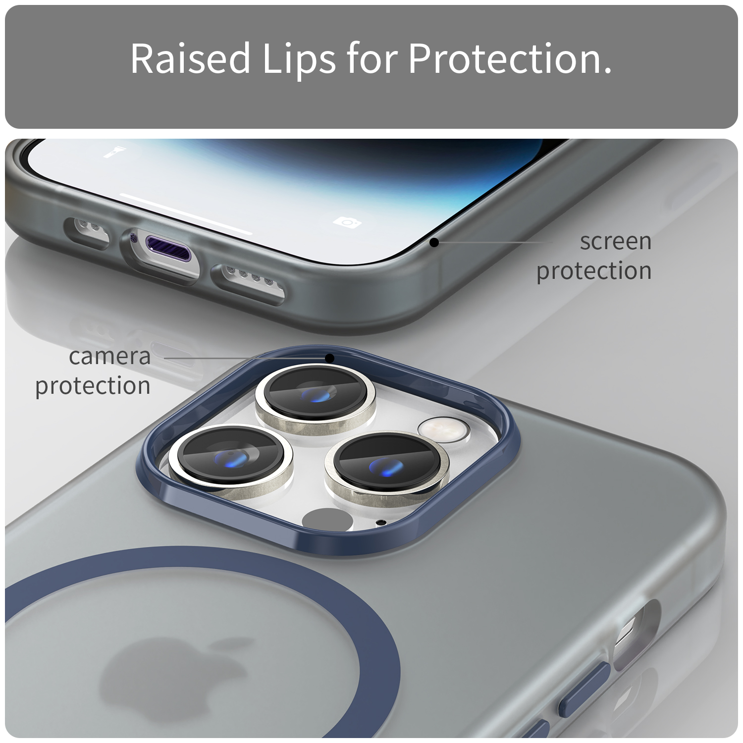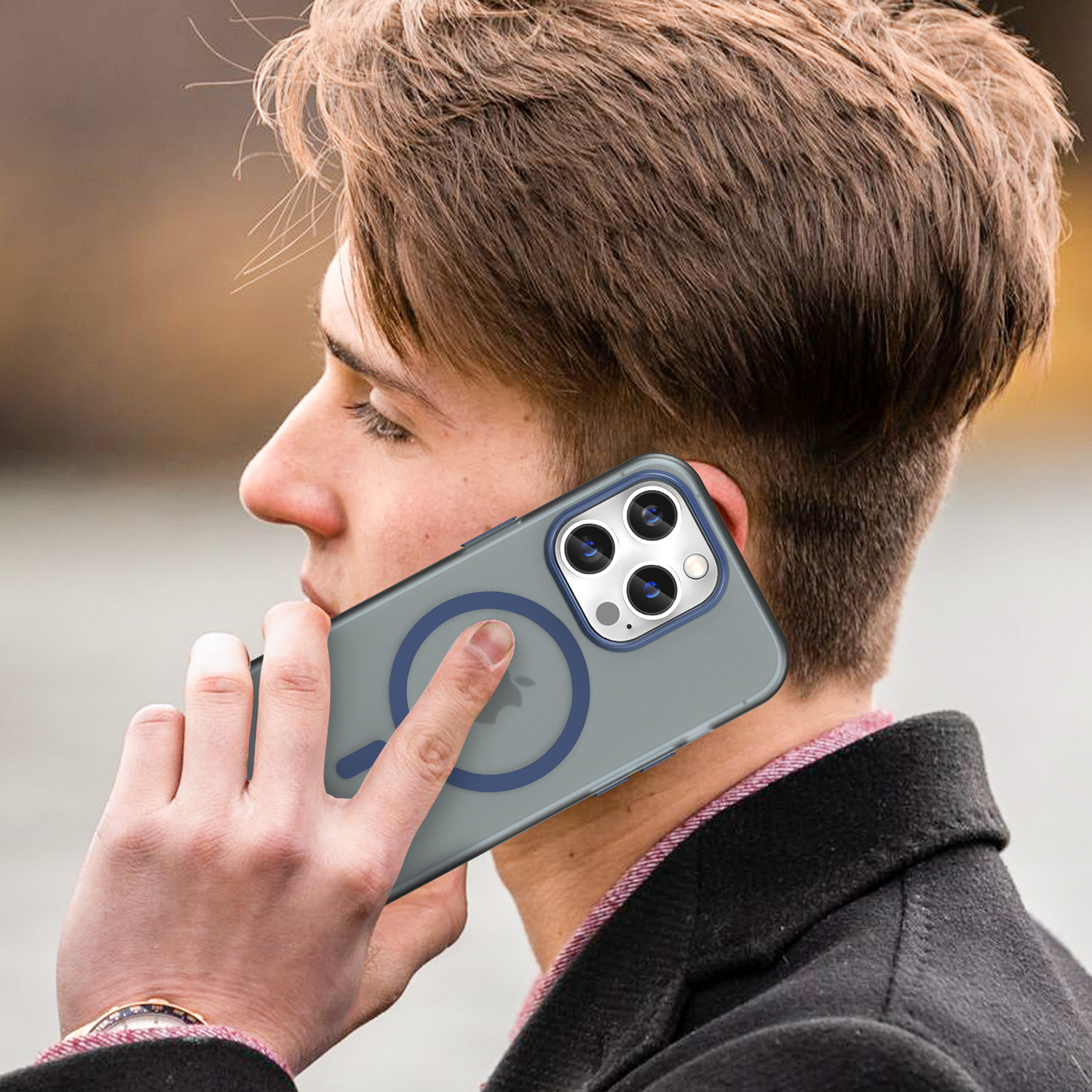 Защитный противоударный чехол с вставками темно-синего цвета и поддержкой MagSafe на телефон iPhone 14 Pro Max от Caseport, серия Frosted Magnetic