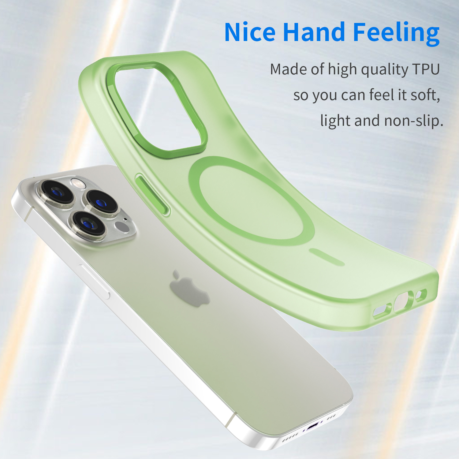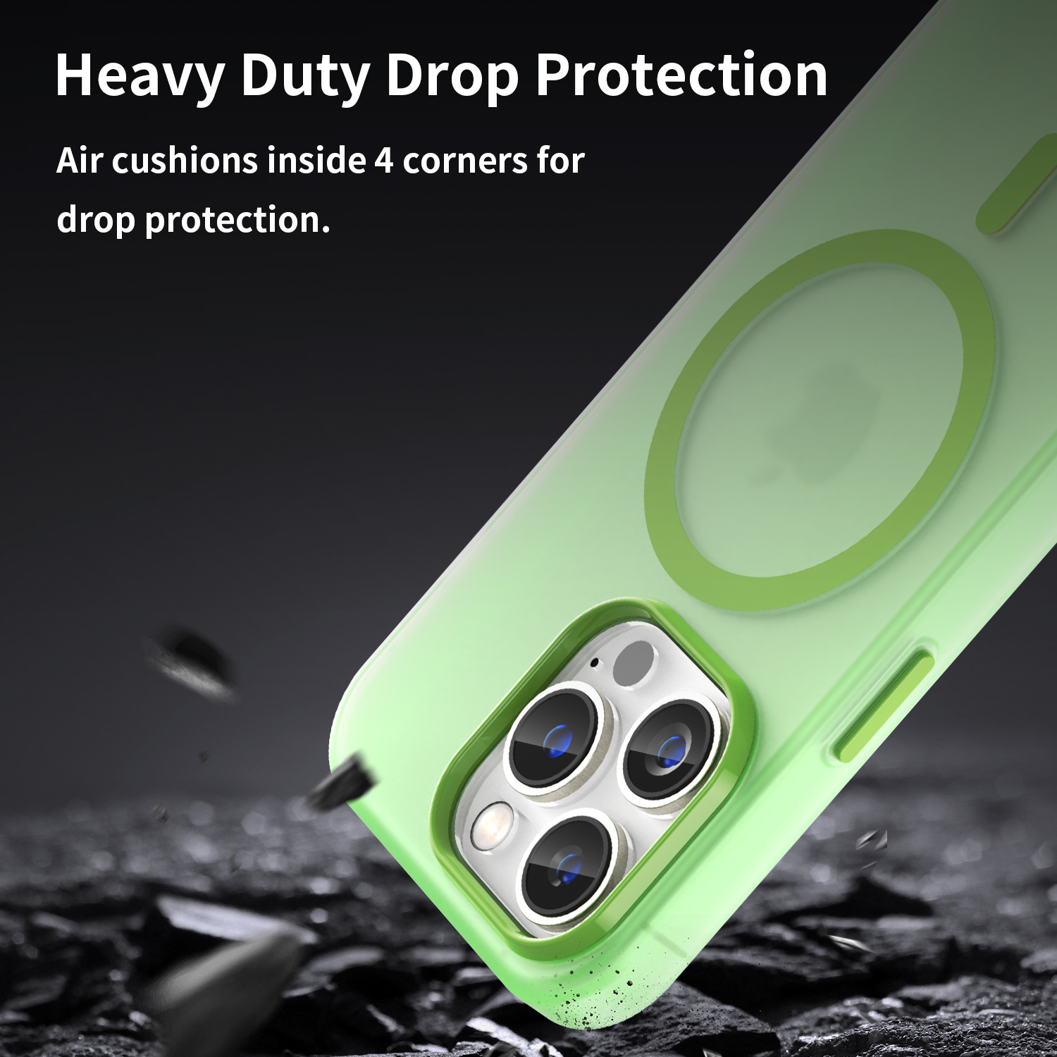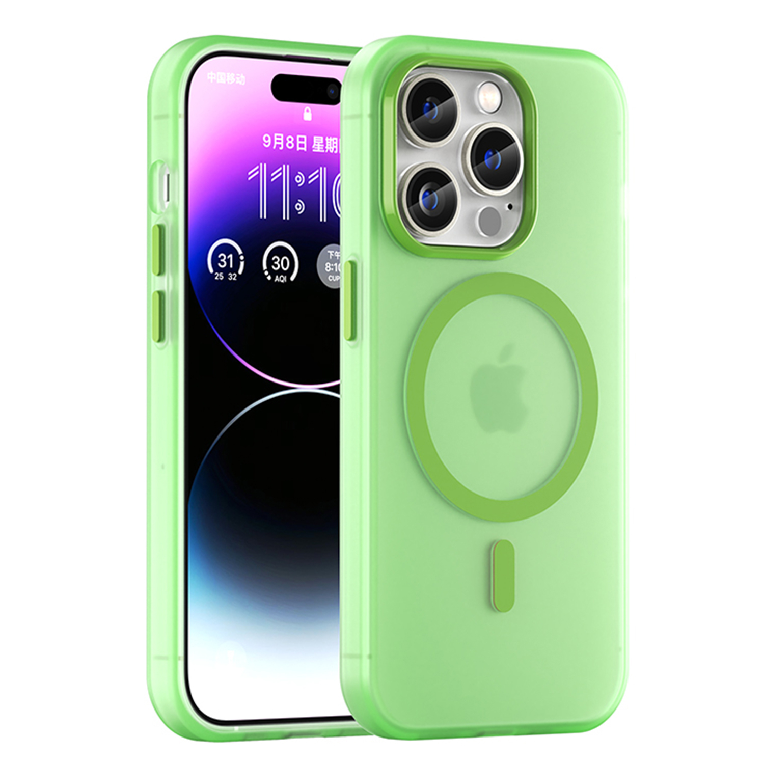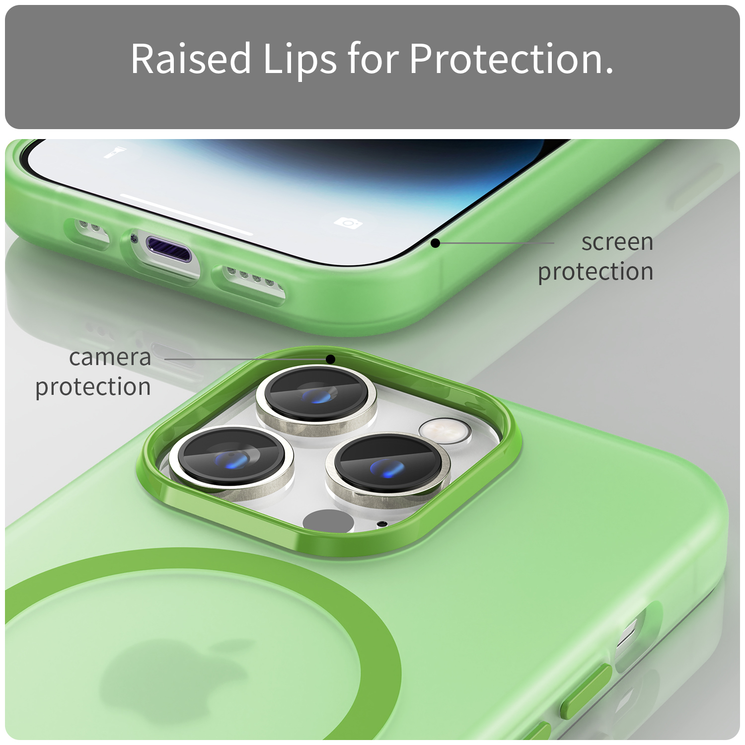 Защитный противоударный чехол с вставками ярко-зеленого цвета и поддержкой MagSafe на телефон iPhone 14 Pro от Caseport, серия Frosted Magnetic