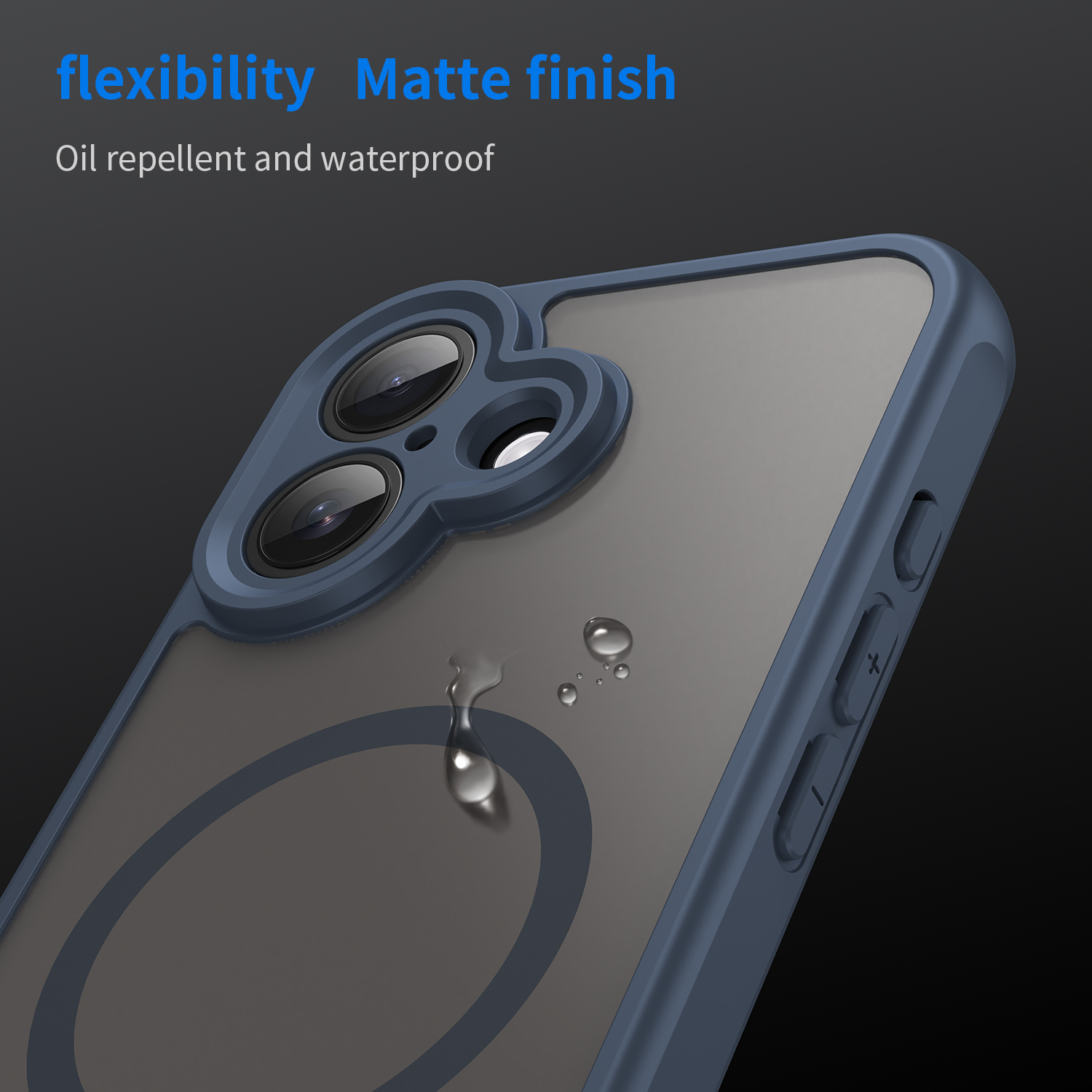 Усиленный матовый чехол с поддержкой беспроводной зарядки MagSage для смартфона iPhone 17 изготавливается из экологичных материалов путем высокоточного литья под давление с высокой температурой. Задняя стенка матовая, боковые рамки мягкие защитные синего цвета.