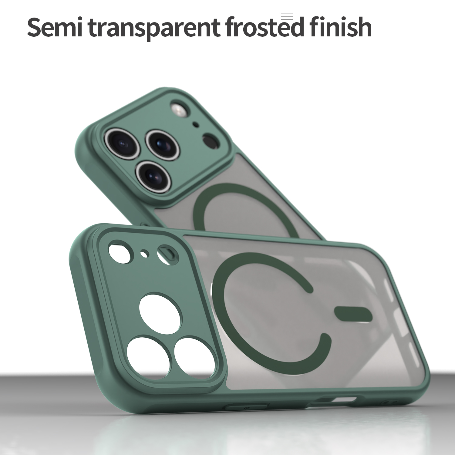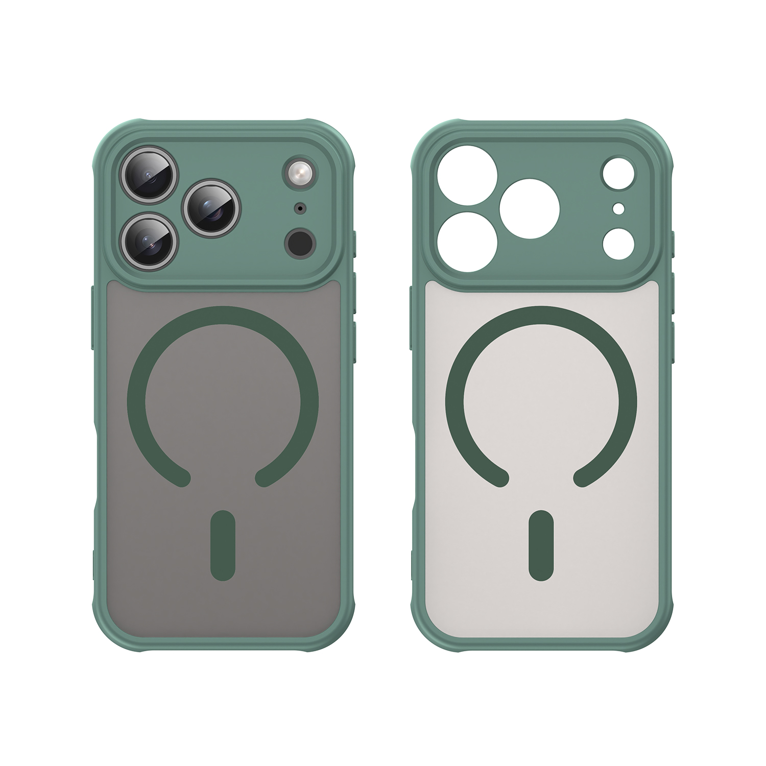 Усиленный матовый чехол с поддержкой магнитной беспроводной зарядки MagSage для смартфона iPhone 17 Pro изготавливается из экологичных материалов путем высокоточного литья под давление с высокой температурой. Задняя стенка матовая, боковые рамки мягкие защитные зеленого цвета.