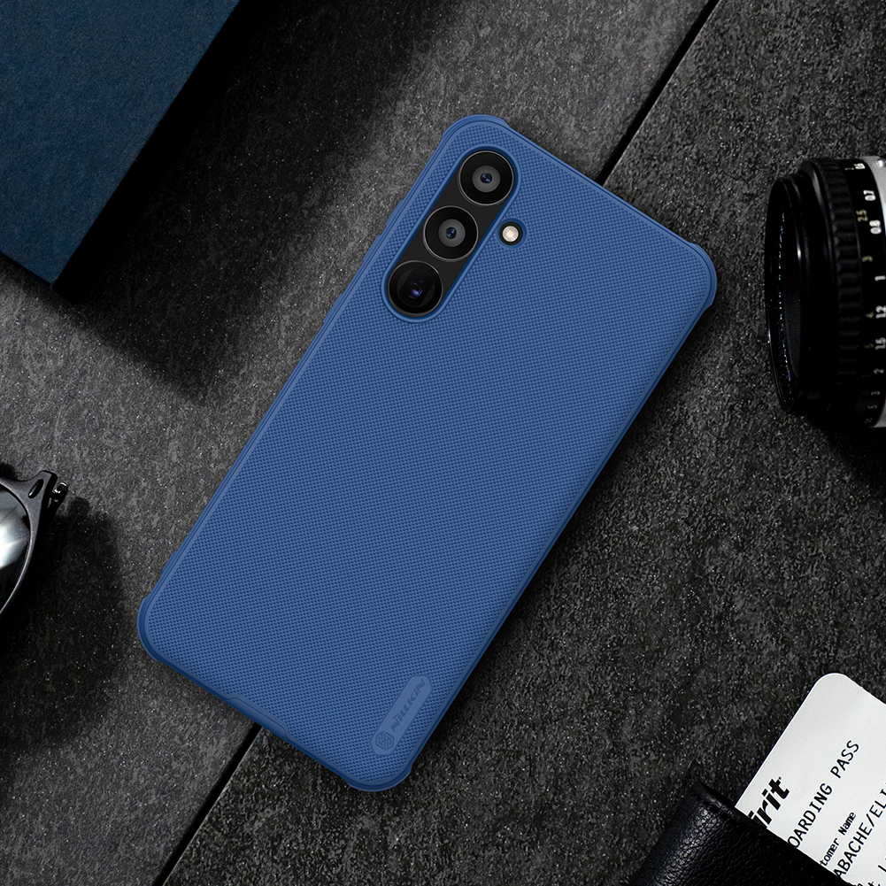 Усиленный защитный чехол синего цвета от Nillkin серии Super Frosted Shield для смартфона Samsung Galaxy A55 с усиленными боковыми рамками по четырем углам, изготавливается из экологичных материалов PC и TPU путем высокоточного литья под давление с высокой температурой.
