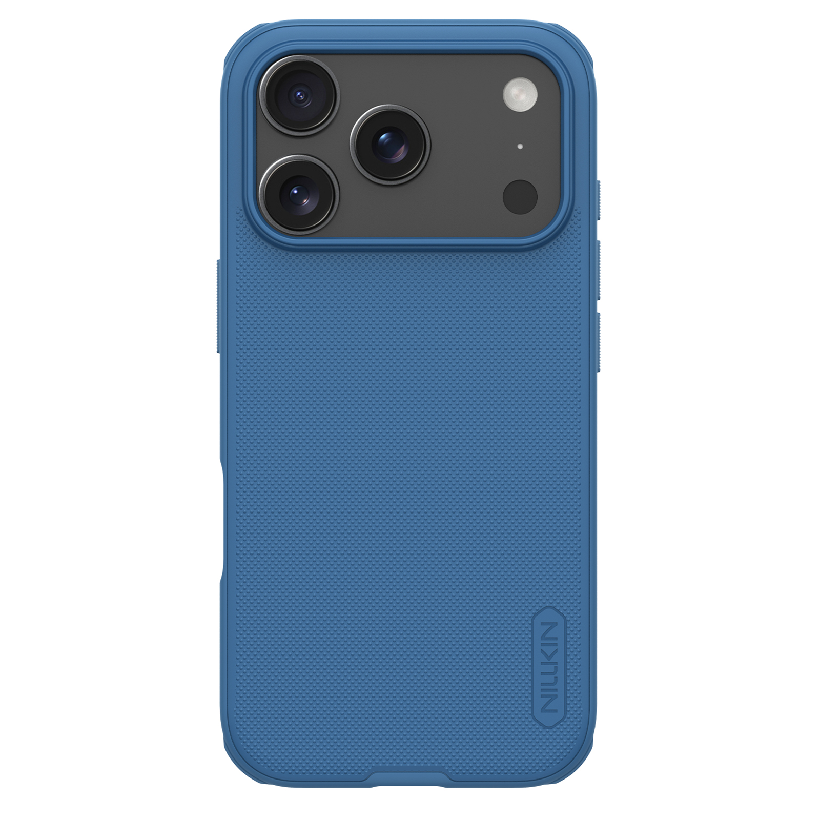 Защитный чехол синего цвета от Nillkin серии Super Frosted Shield Pro для смартфона iPhone 17 Pro с усиленными боковыми рамками по четырем углам, изготавливается из экологичных материалов PC и TPU путем высокоточного литья под давление с высокой температурой.
