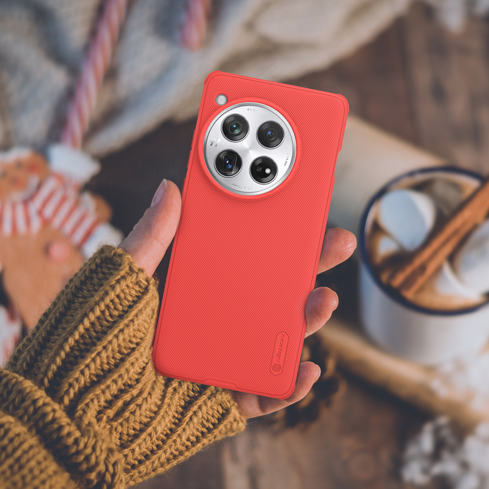 Защитный чехол красного цвета от Nillkin серии Super Frosted Shield для смартфона Oneplus 12 с усиленными боковыми рамками по четырем углам, изготавливается из экологичных материалов PC и TPU путем высокоточного литья под давление с высокой температурой.