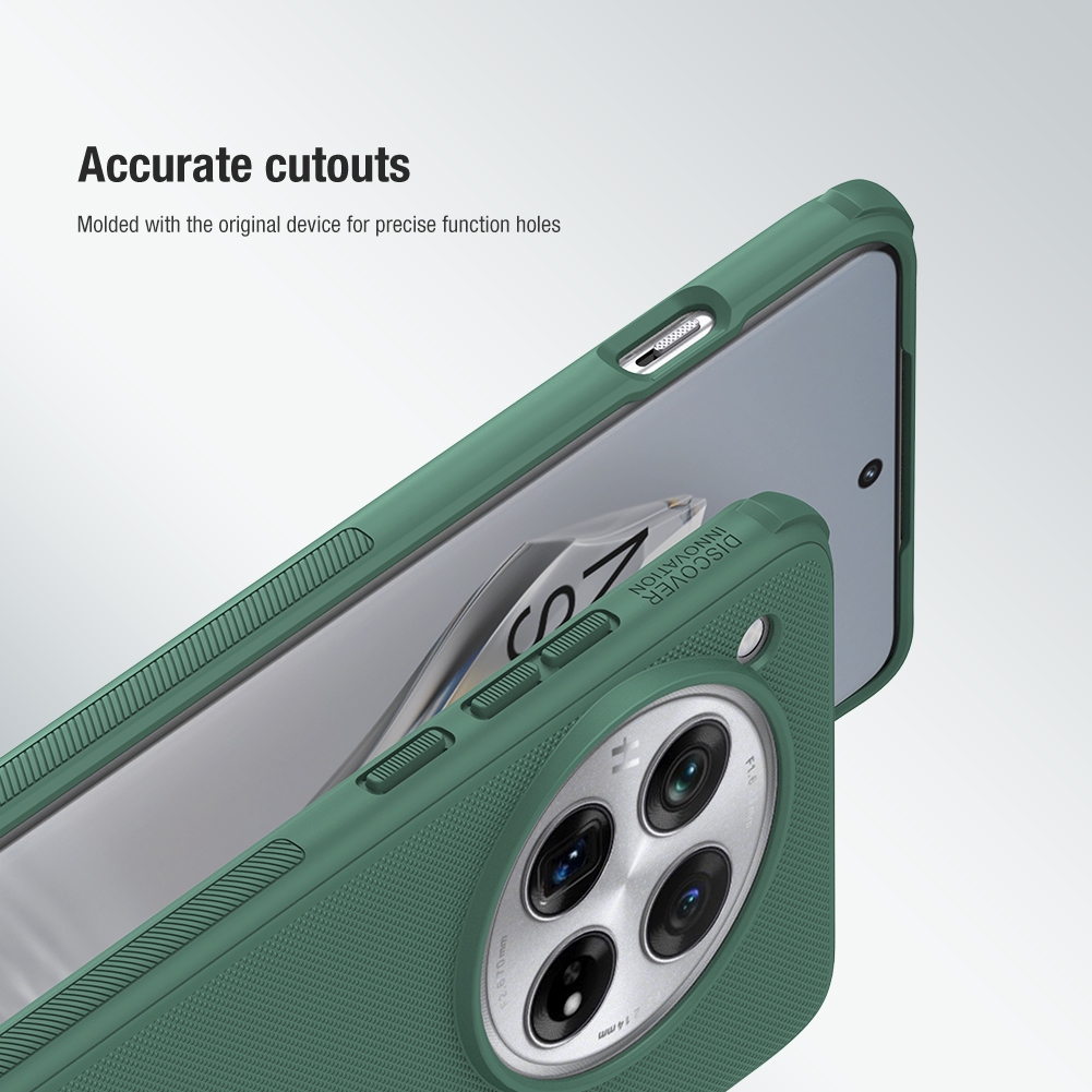 Защитный чехол зеленого цвета (Deep Green) от Nillkin серии Super Frosted Shield для смартфона Oneplus 12 с усиленными боковыми рамками по четырем углам, изготавливается из экологичных материалов PC и TPU путем высокоточного литья под давление с высокой температурой.