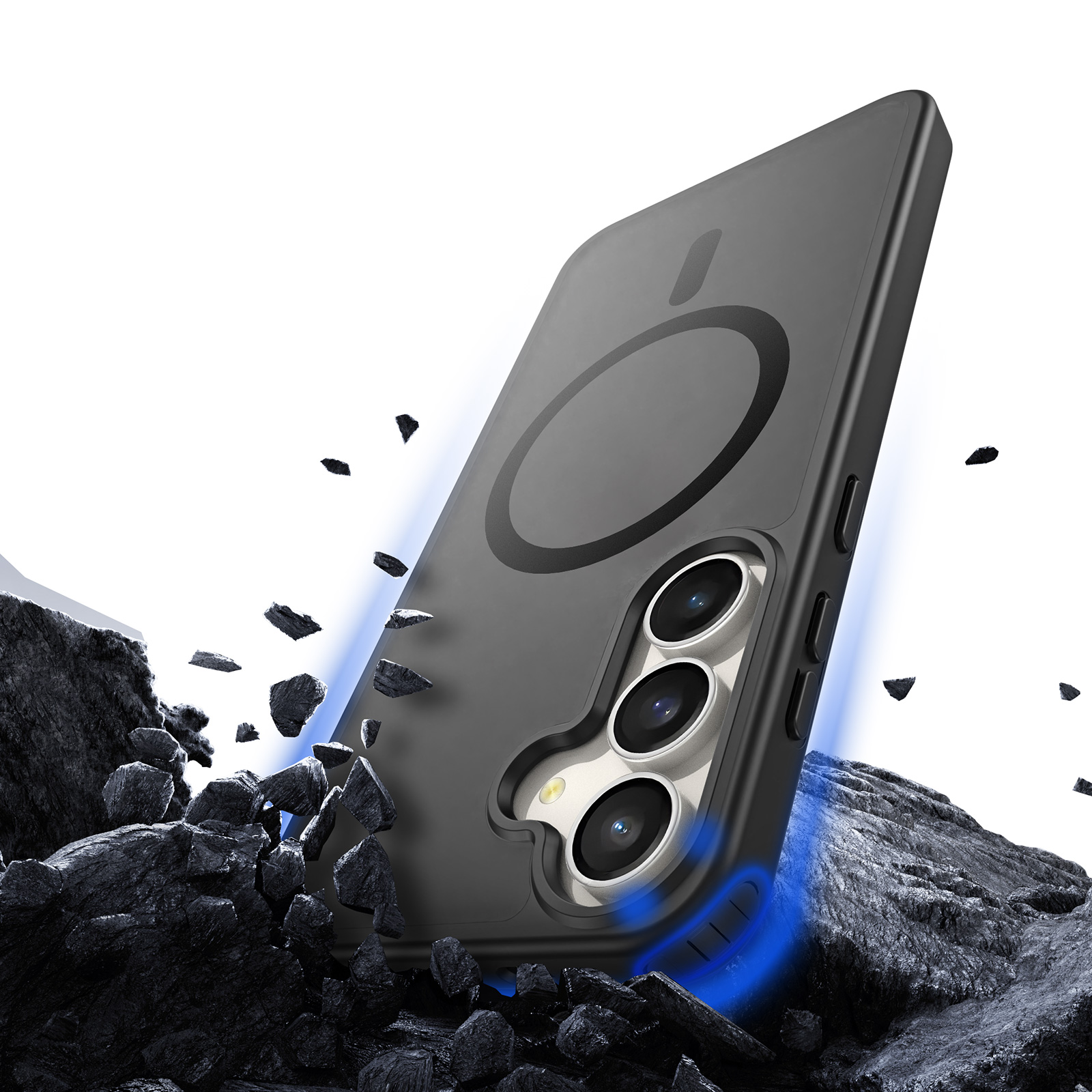 Матовый прозрачный чехол с рамками черного и с поддержкой беспроводной зарядки MagSage от Dux Ducis серии Yind Series Case для смартфона Samsung Galaxy S25 FE изготавливается из экологичных материалов путем высокоточного литья под давление с высокой температурой.