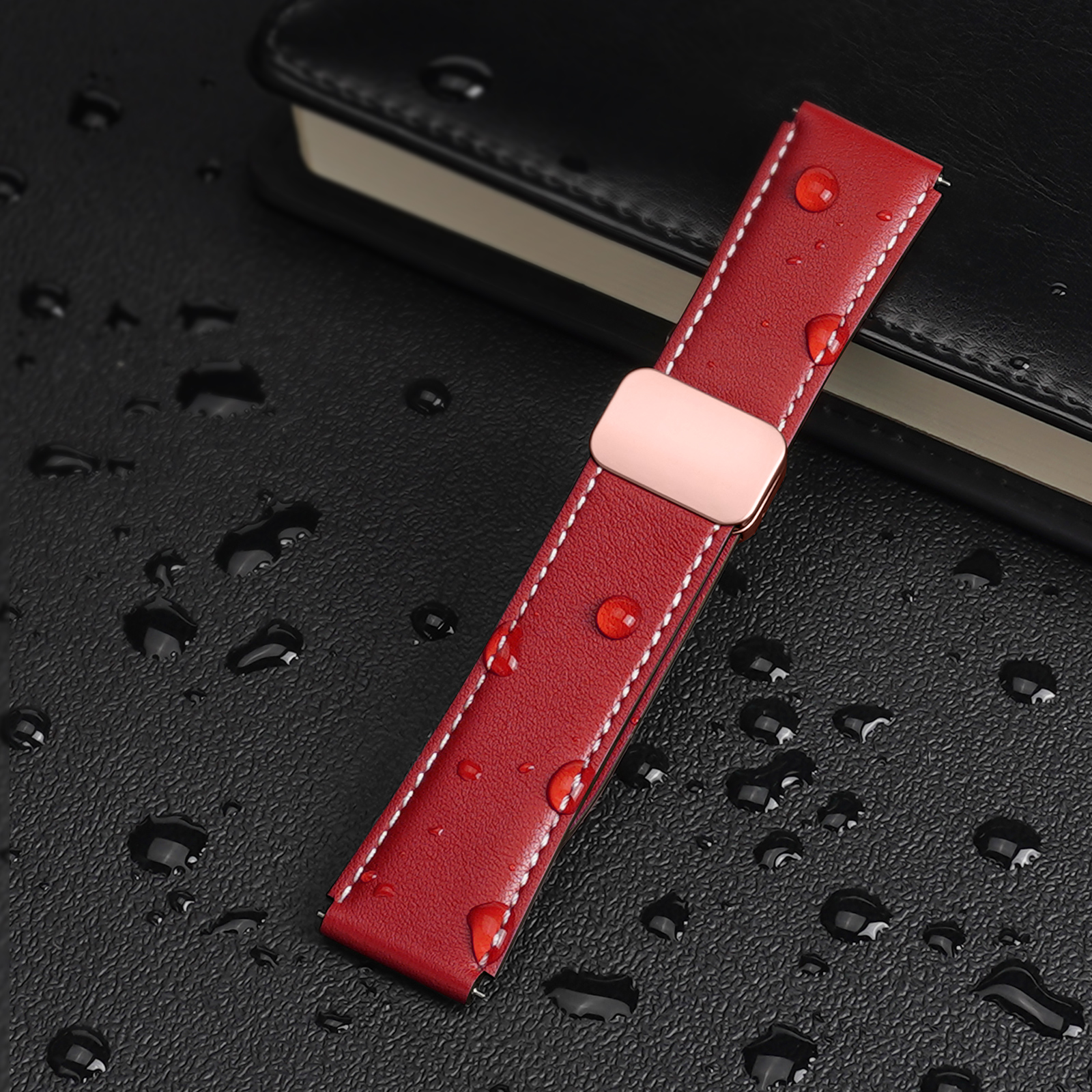 Ремешок из натуральной телячьей кожи красного цвета от Dux Ducis для смарт часов Samsung Galaxy Watch 3, 4, 5, 6 и 7 (размер крепления 20мм), серия YA Series. Изготовлен из отборной телячьей кожи первого сорта, внешняя сторона мягкая и нежная, с естественным блеском, а внутренняя часть гладкая и дышащая, сохраняя вашу кожу сухой в любое время. Ремешок очень приятен для кожи, удобен для ношения в течение длительного времени и не выделяет запаха.