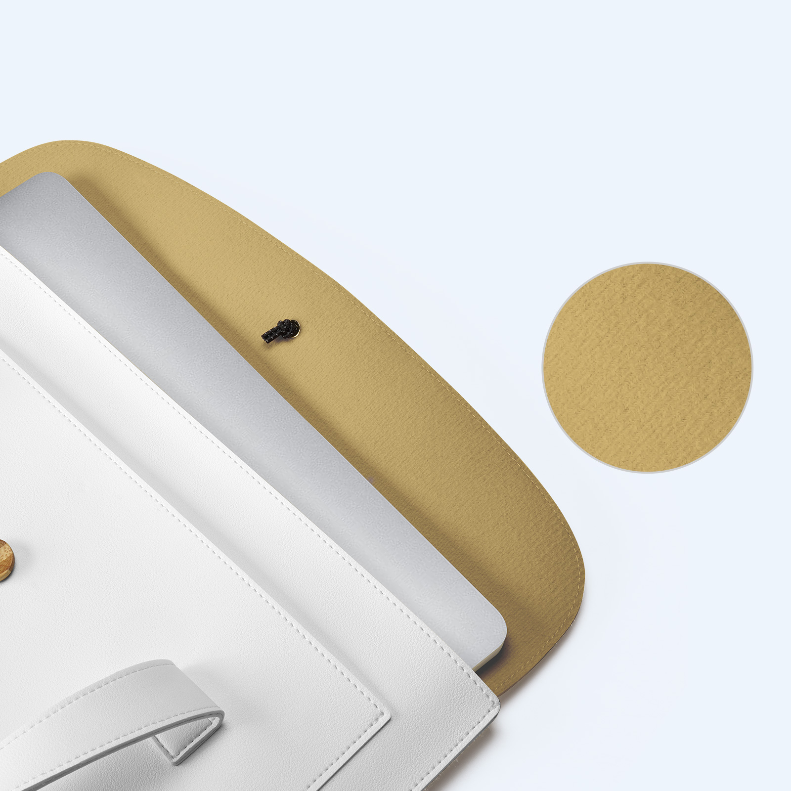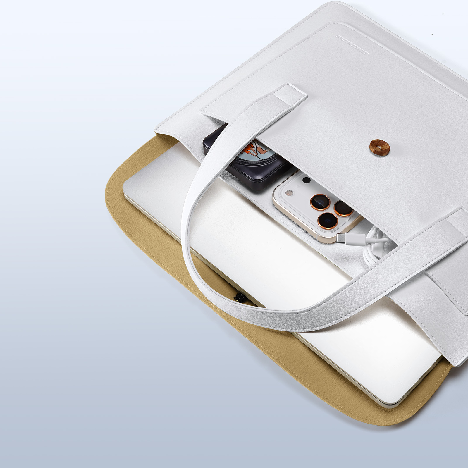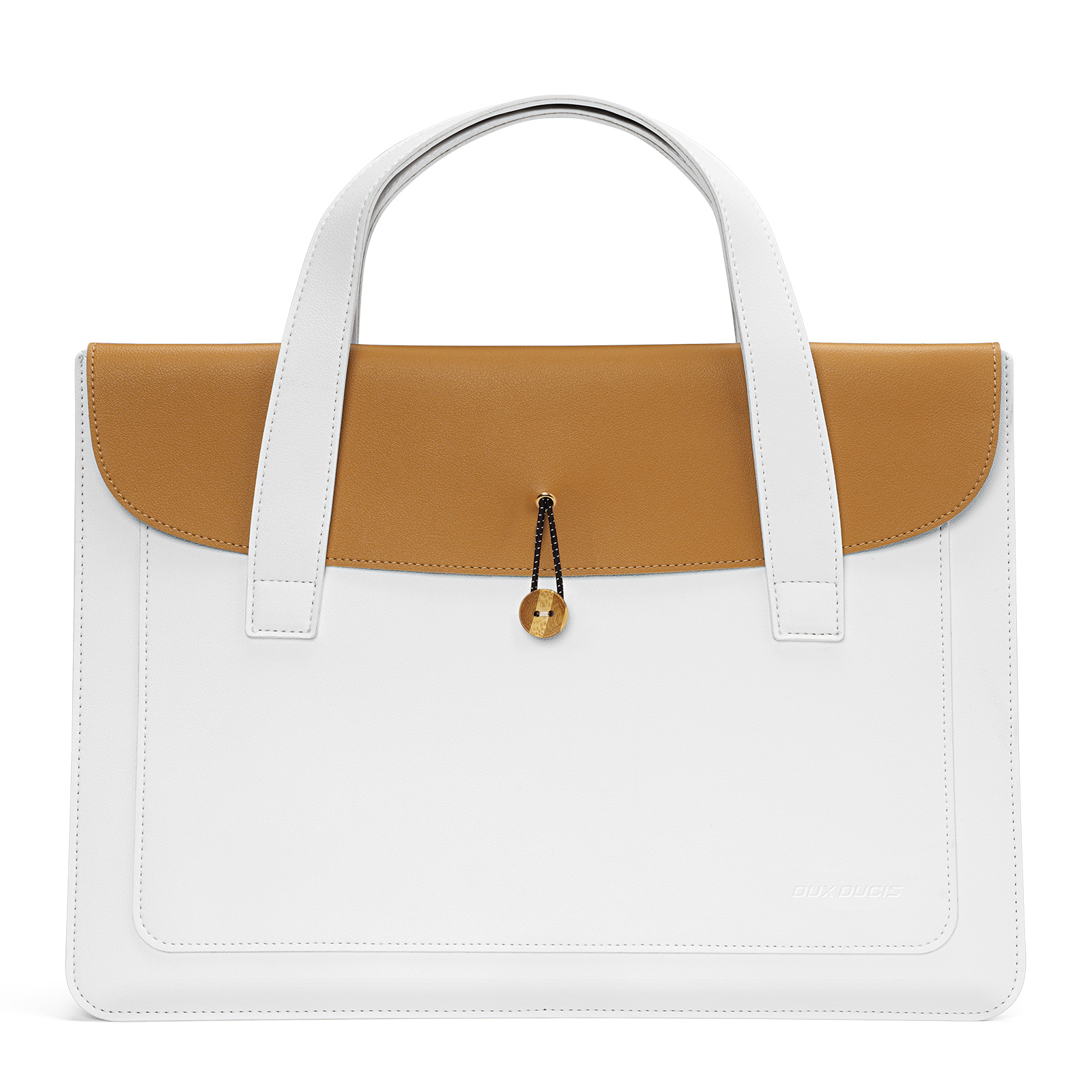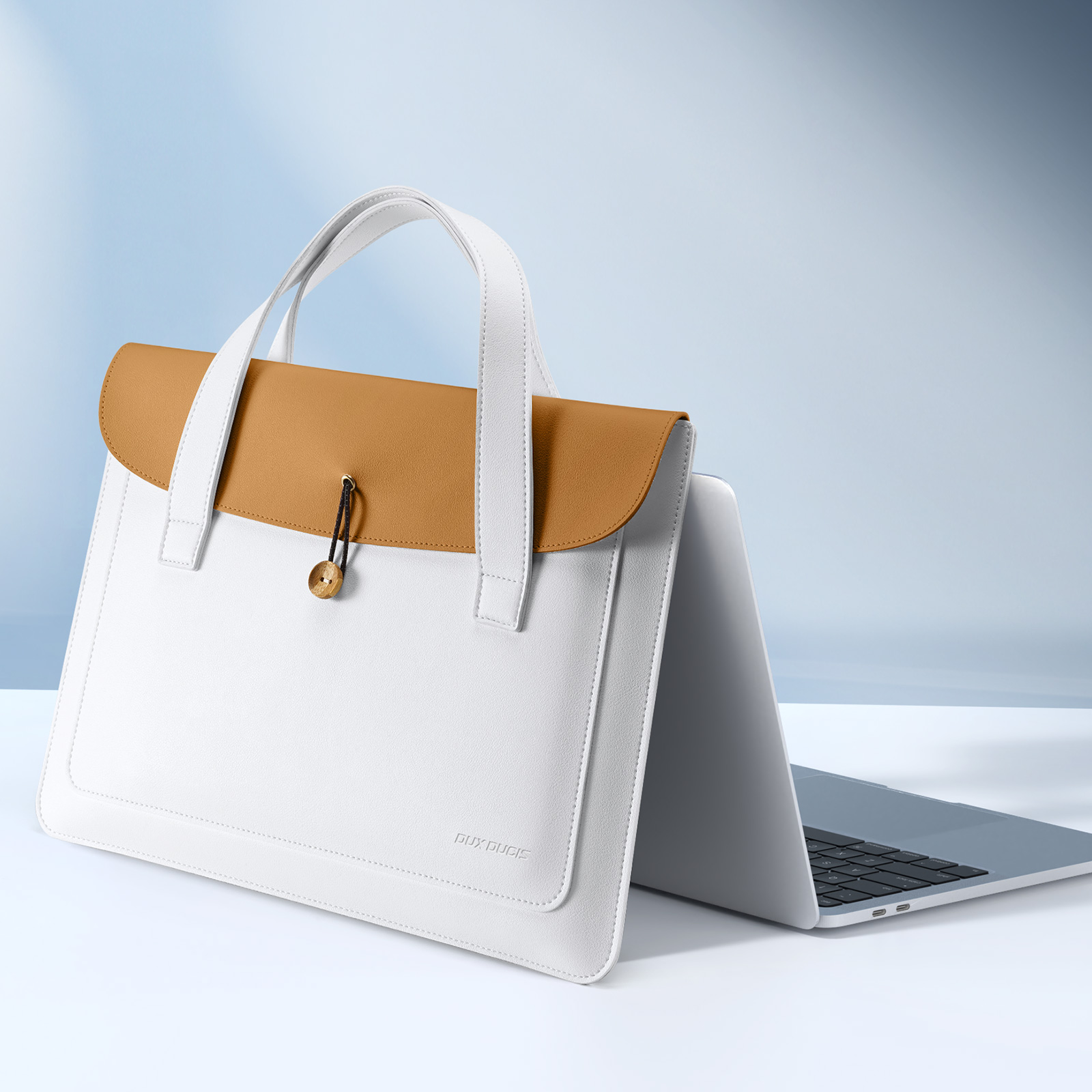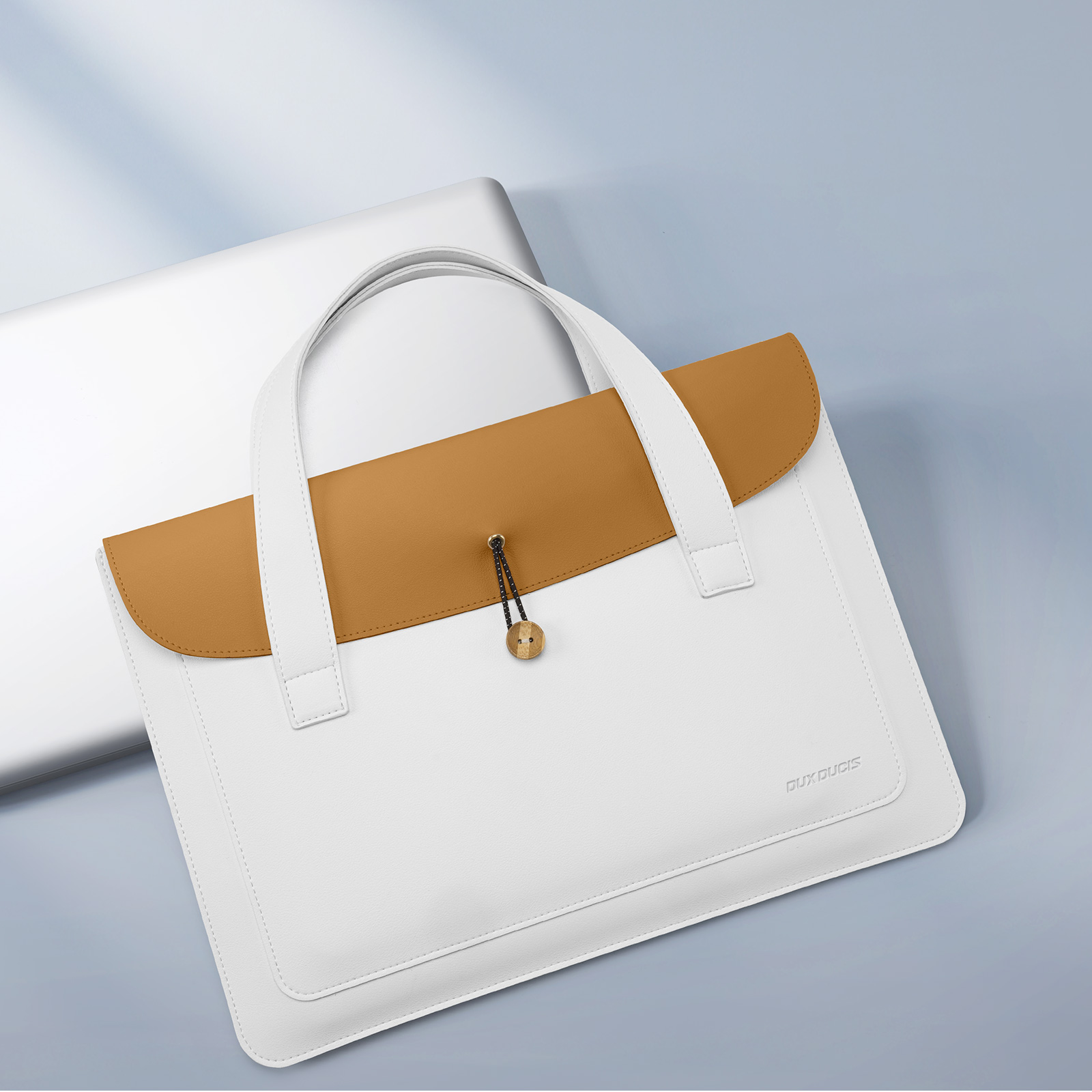 Ручная сумка белый с хаки цвет (white+Khaki) ультратонкая для ноутбука или планшета до 16 дюймов, серия AURA Series Handbag от Dux Ducis. Ультратонкая и легкая: толщина всего 5 мм, вес около 230 г, очень портативная. Двухслойное отделение: основное отделение для ноутбука, дополнительное отделение для аксессуаров, таких как планшеты и внешние аккумуляторы. Премиальные материалы: приятная на ощупь искусственная кожа снаружи и замшевая подкладка, защищающая от царапин внутри. Универсальное использование: минималистичный дизайн подходит для работы, путешествий и ежедневных поездок. Прочная конструкция: эластичная резинка, пуговица из массива дерева и усиленная прострочка.