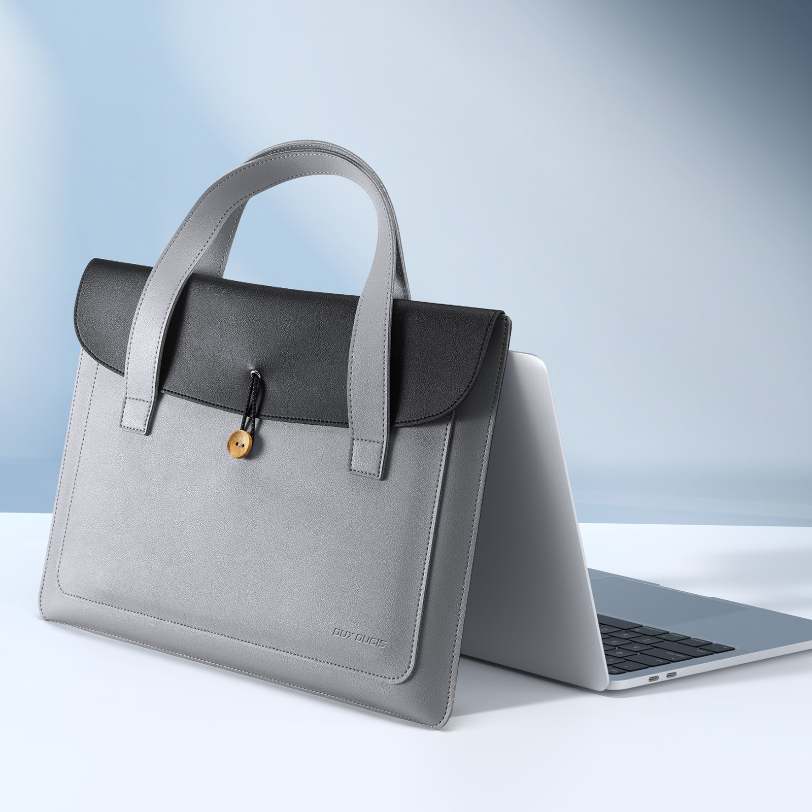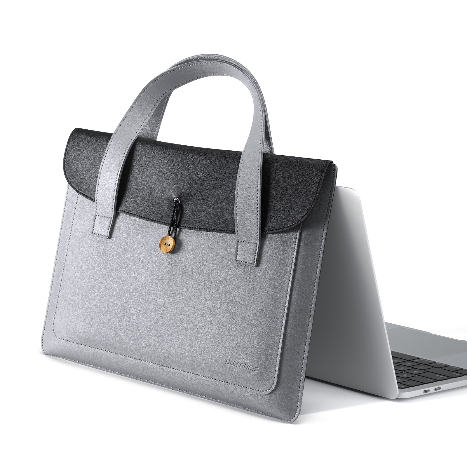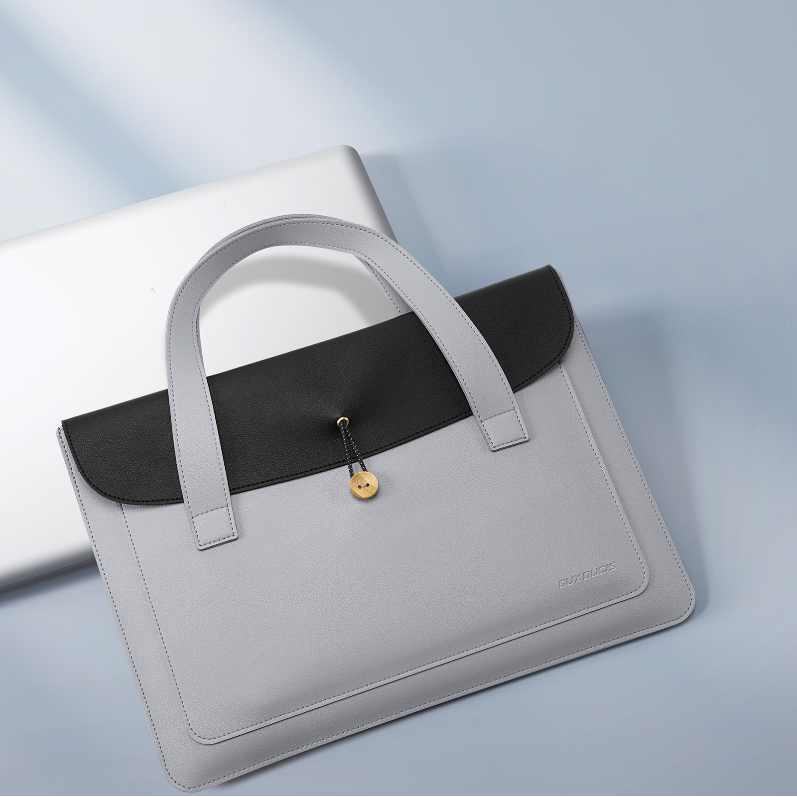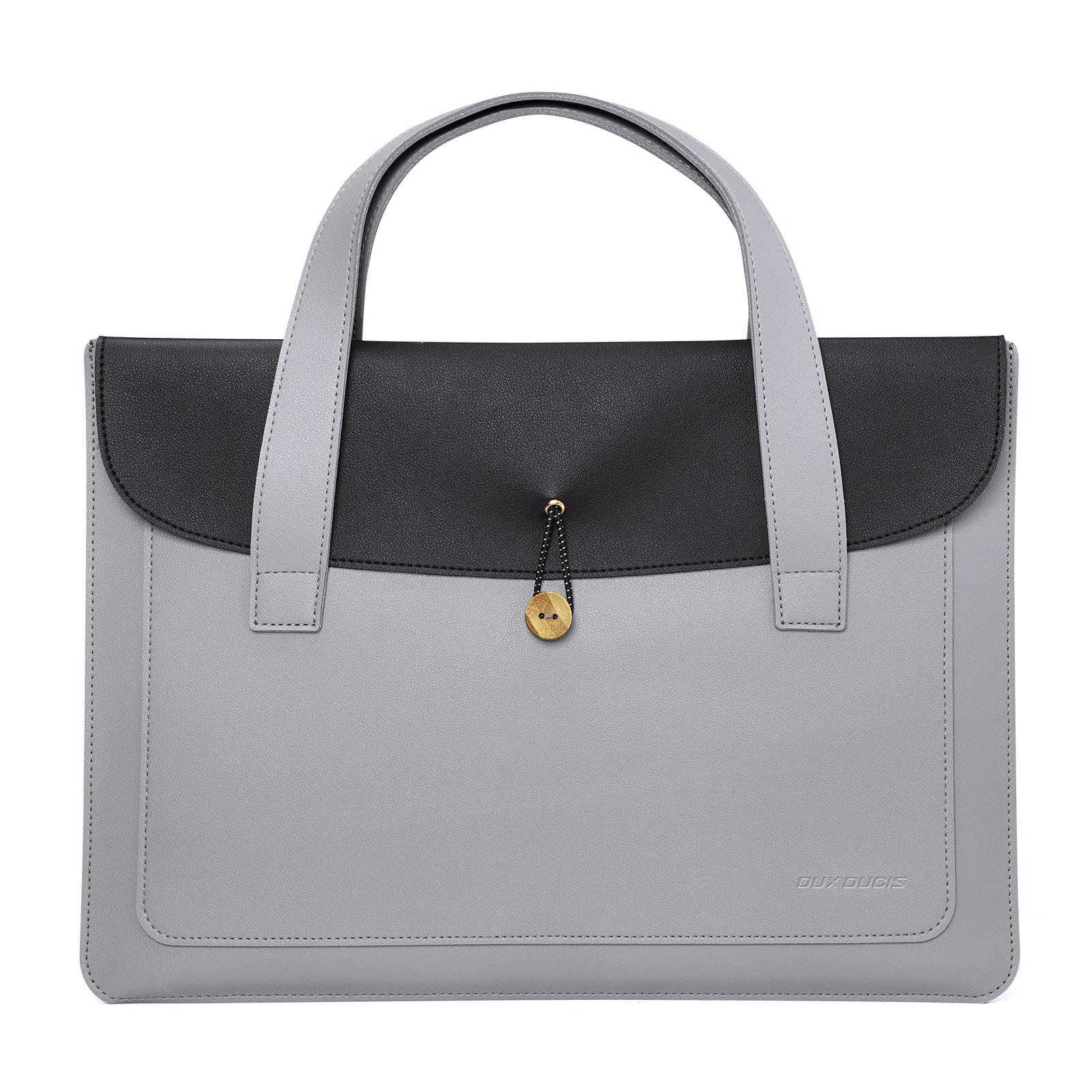 Ручная сумка из искусственной кожи черный с серым цвет (Grey+Black) ультратонкая для ноутбука или планшета до 16 дюймов, серия AURA Series Handbag от Dux Ducis. Ультратонкая и легкая: толщина всего 5 мм, вес около 230 г, очень портативная. Двухслойное отделение: основное отделение для ноутбука, дополнительное отделение для аксессуаров, таких как планшеты и внешние аккумуляторы. Премиальные материалы: приятная на ощупь искусственная кожа снаружи и замшевая подкладка, защищающая от царапин внутри. Универсальное использование: минималистичный дизайн подходит для работы, путешествий и ежедневных поездок. Прочная конструкция: эластичная резинка, пуговица из массива дерева и усиленная прострочка.
