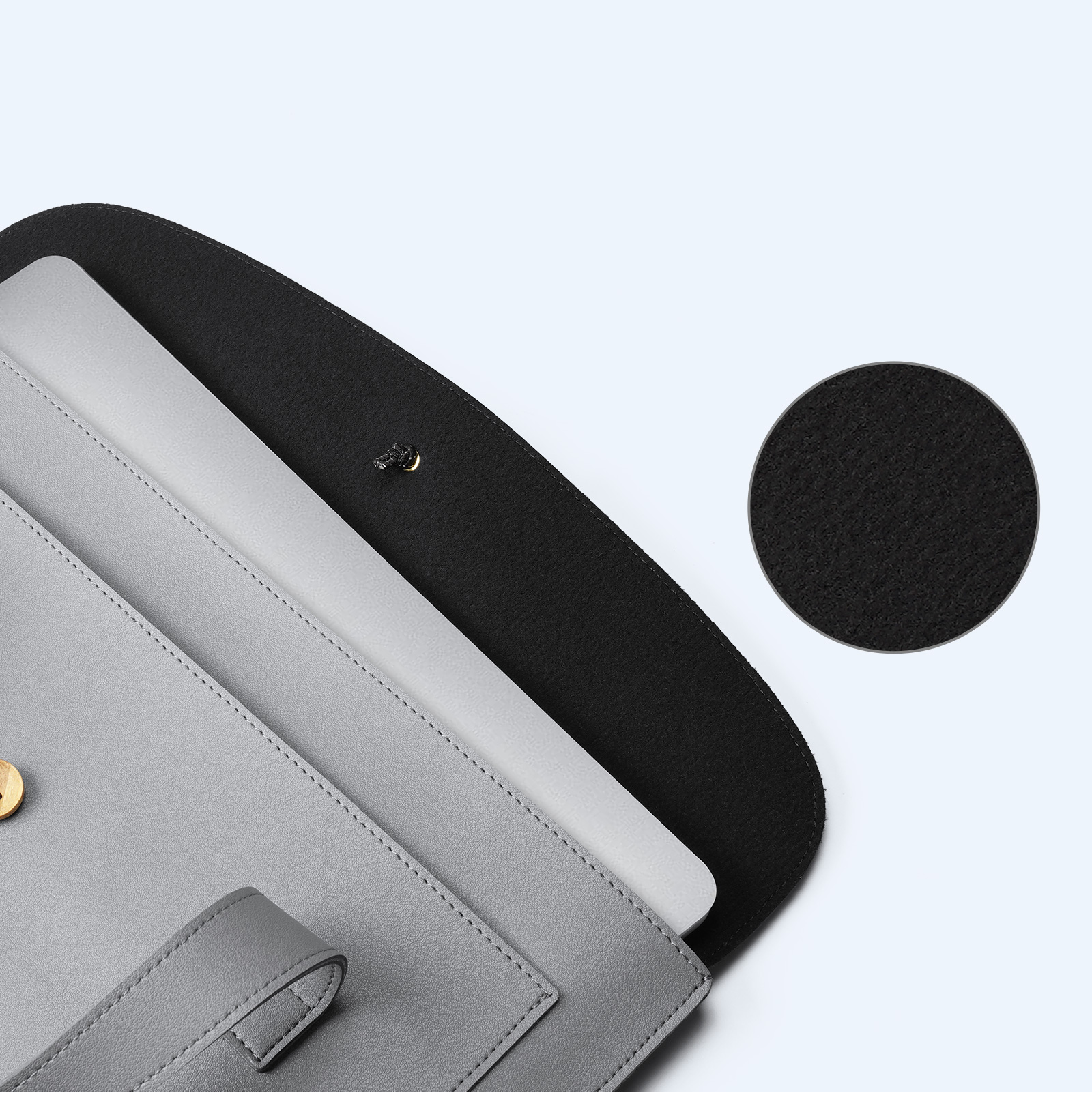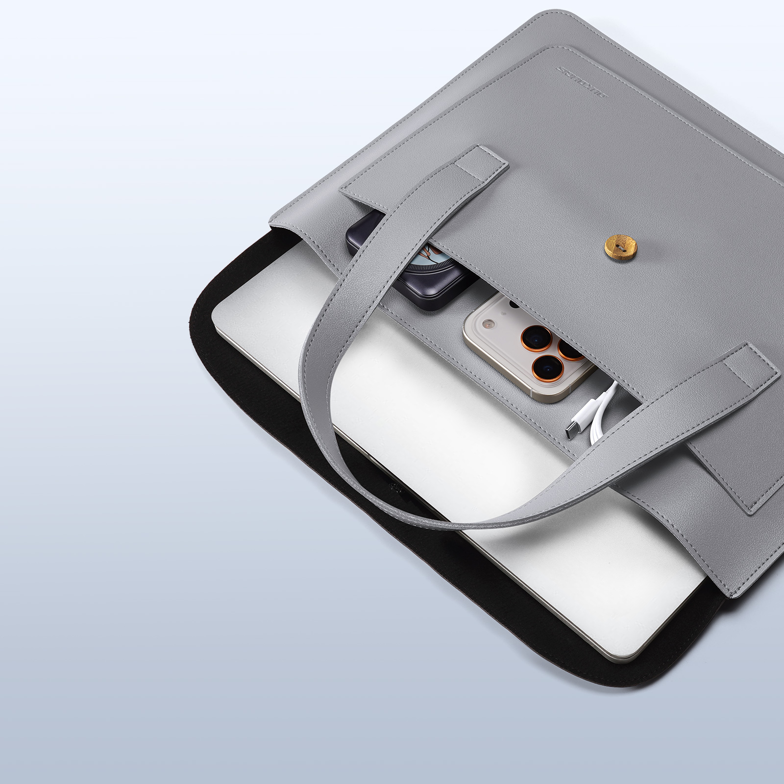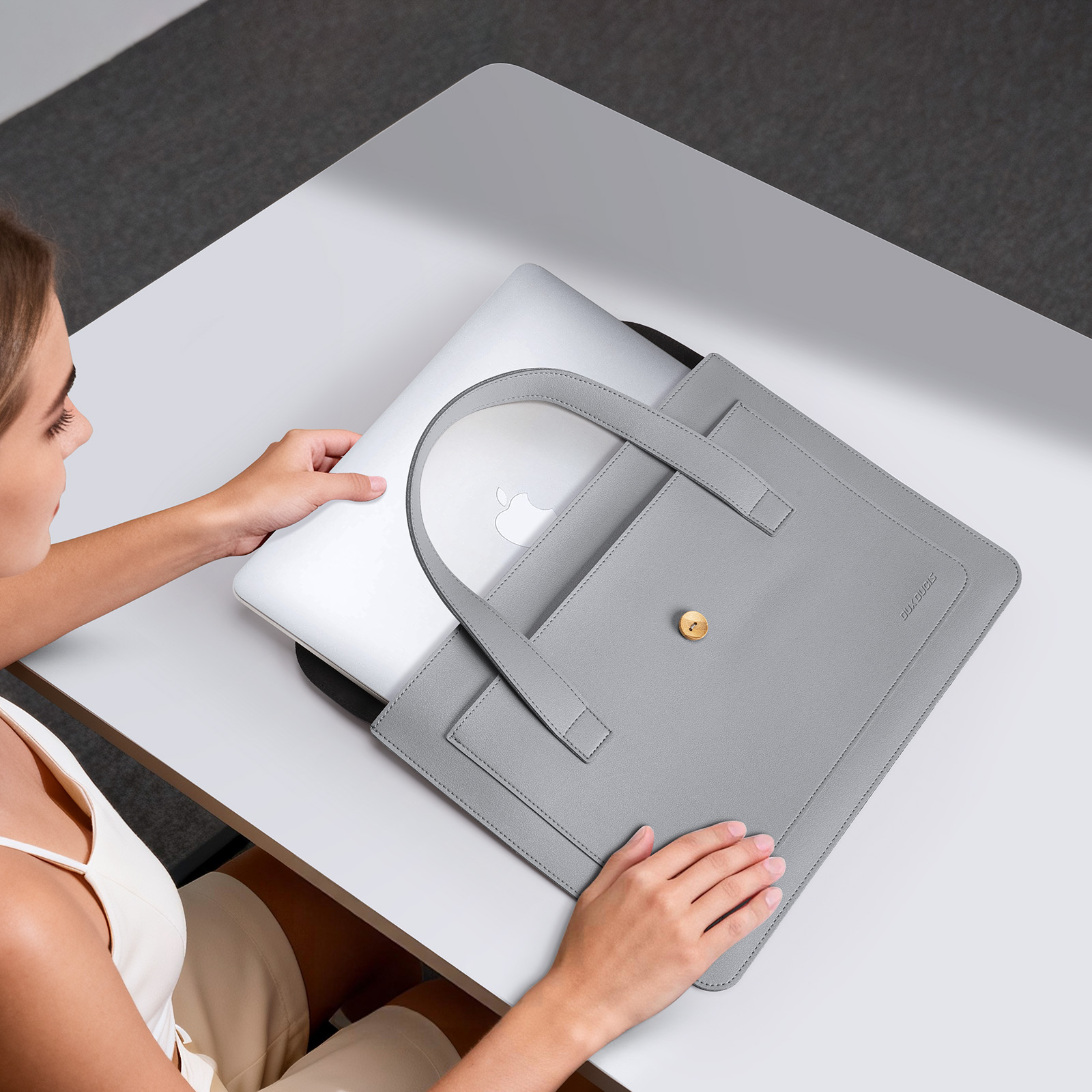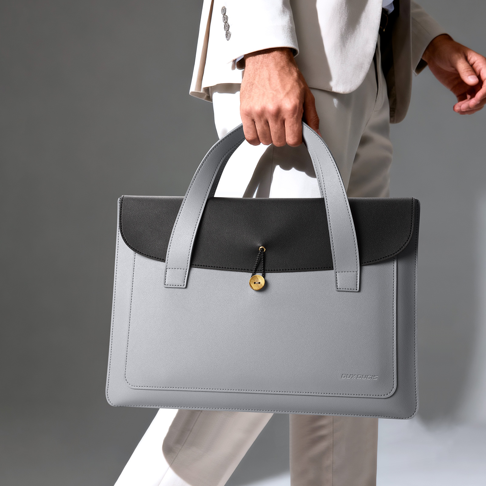Ручная сумка из искусственной кожи черный с серым цвет (Grey+Black) ультратонкая для ноутбука или планшета до 16 дюймов, серия AURA Series Handbag от Dux Ducis. Ультратонкая и легкая: толщина всего 5 мм, вес около 230 г, очень портативная. Двухслойное отделение: основное отделение для ноутбука, дополнительное отделение для аксессуаров, таких как планшеты и внешние аккумуляторы. Премиальные материалы: приятная на ощупь искусственная кожа снаружи и замшевая подкладка, защищающая от царапин внутри. Универсальное использование: минималистичный дизайн подходит для работы, путешествий и ежедневных поездок. Прочная конструкция: эластичная резинка, пуговица из массива дерева и усиленная прострочка.
