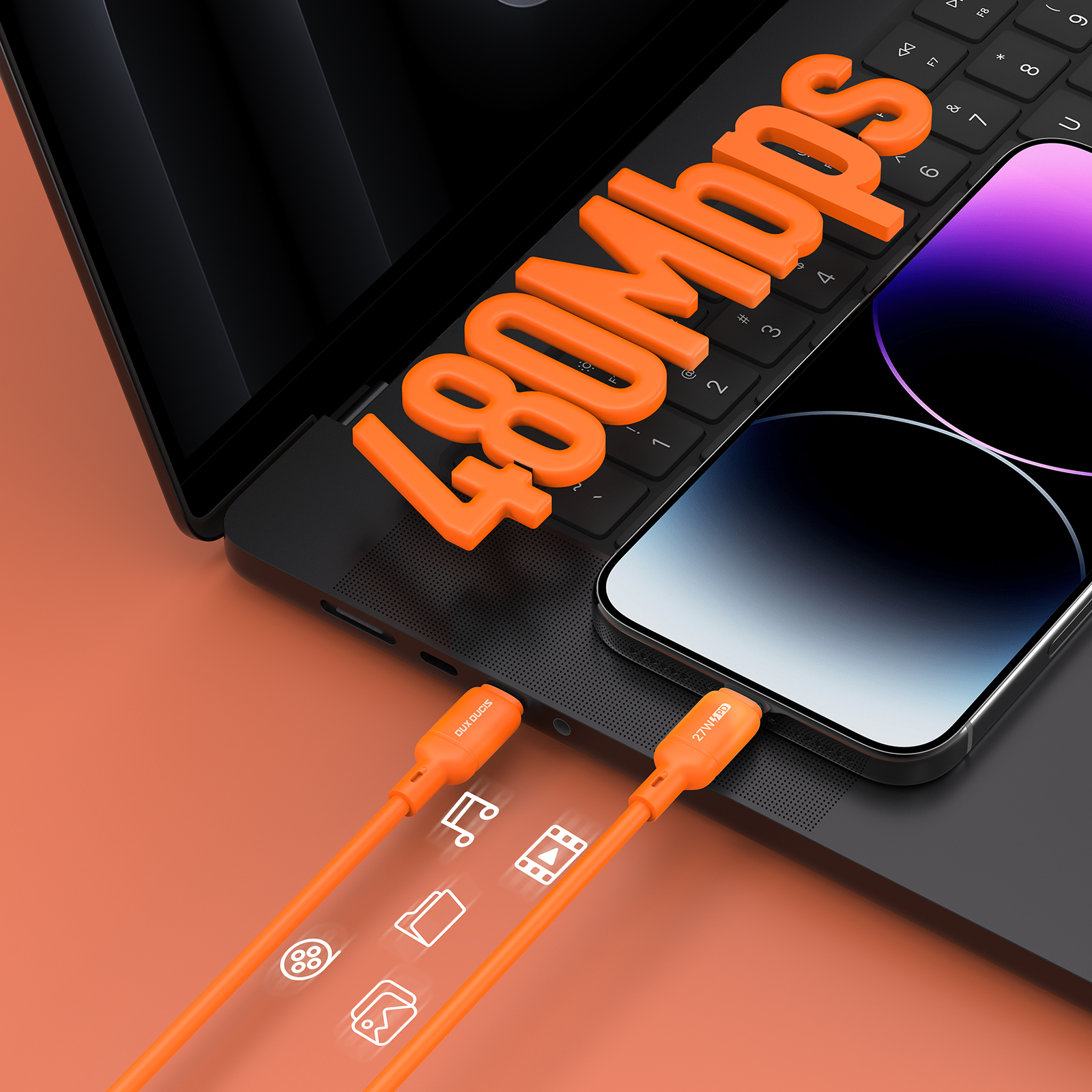 Силиконовый кабель оранжевого цвета с USB-C на Lightning, быстрая зарядка 27W, длина 100см (1м), серия SILI Series от Dux Ducis. Максимальная мощность быстрой зарядки 27 Вт, быстро заряжает iPhone и поддерживает зарядку мощностью 27 Вт для новейших моделей. Ультрамягкий силикон, гибкий, не спутывается и приятен для кожи, обеспечивая комфорт при ежедневном использовании. Усилен с помощью конструкции SR и протестирован на устойчивость к более чем 10 000 изгибам. Работает с телефонами, планшетами и ноутбуками, использующими протоколы быстрой зарядки PD, QC. Одновременная зарядка и передача данных, обеспечивает скорость передачи данных 480 Мбит/с во время зарядки вашего устройства.