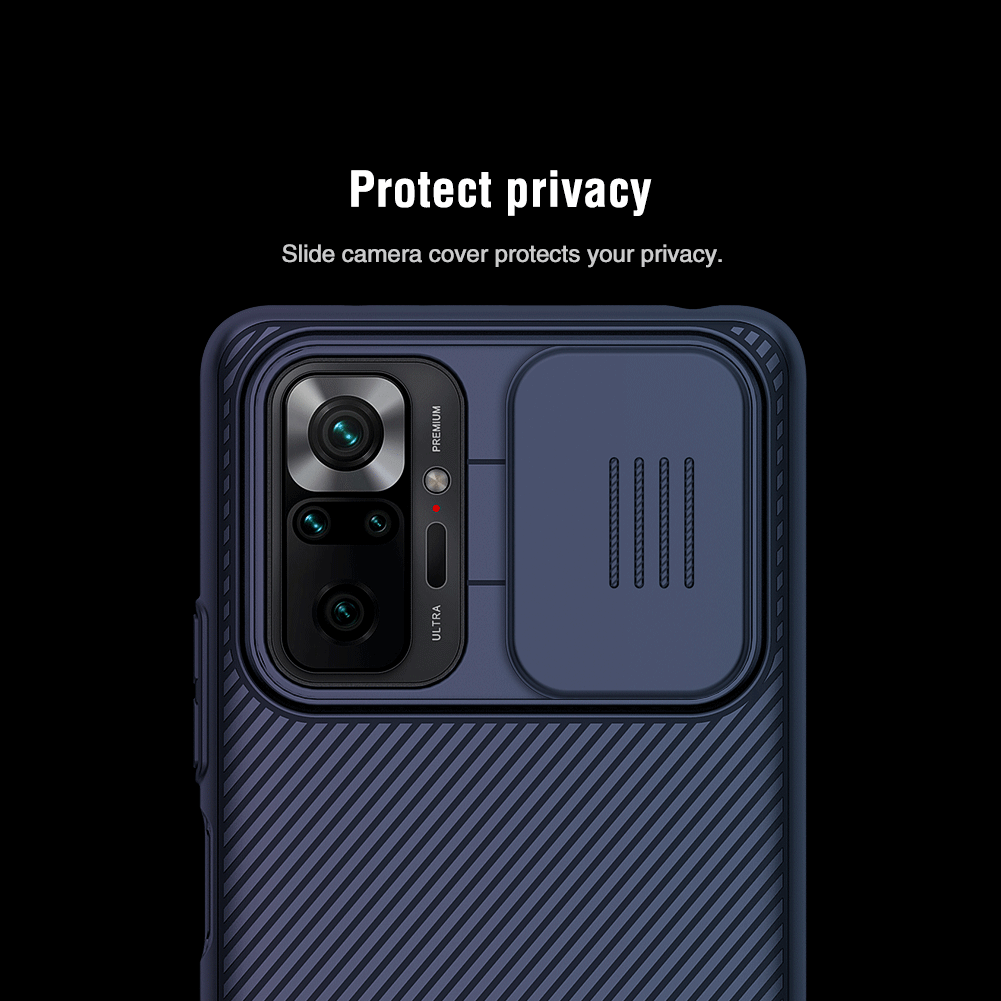 Противоударный чехол синего цвета с защитной крышкой задней камеры серии CamShield Case от Nillkin для Xiaomi Redmi Note 10 Pro и 10 Pro Max создан для любителей активного отдыха.