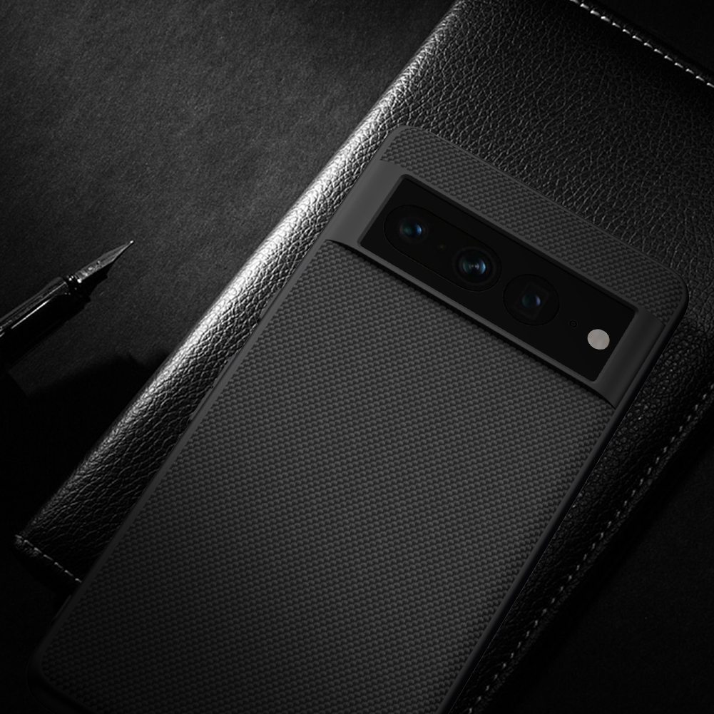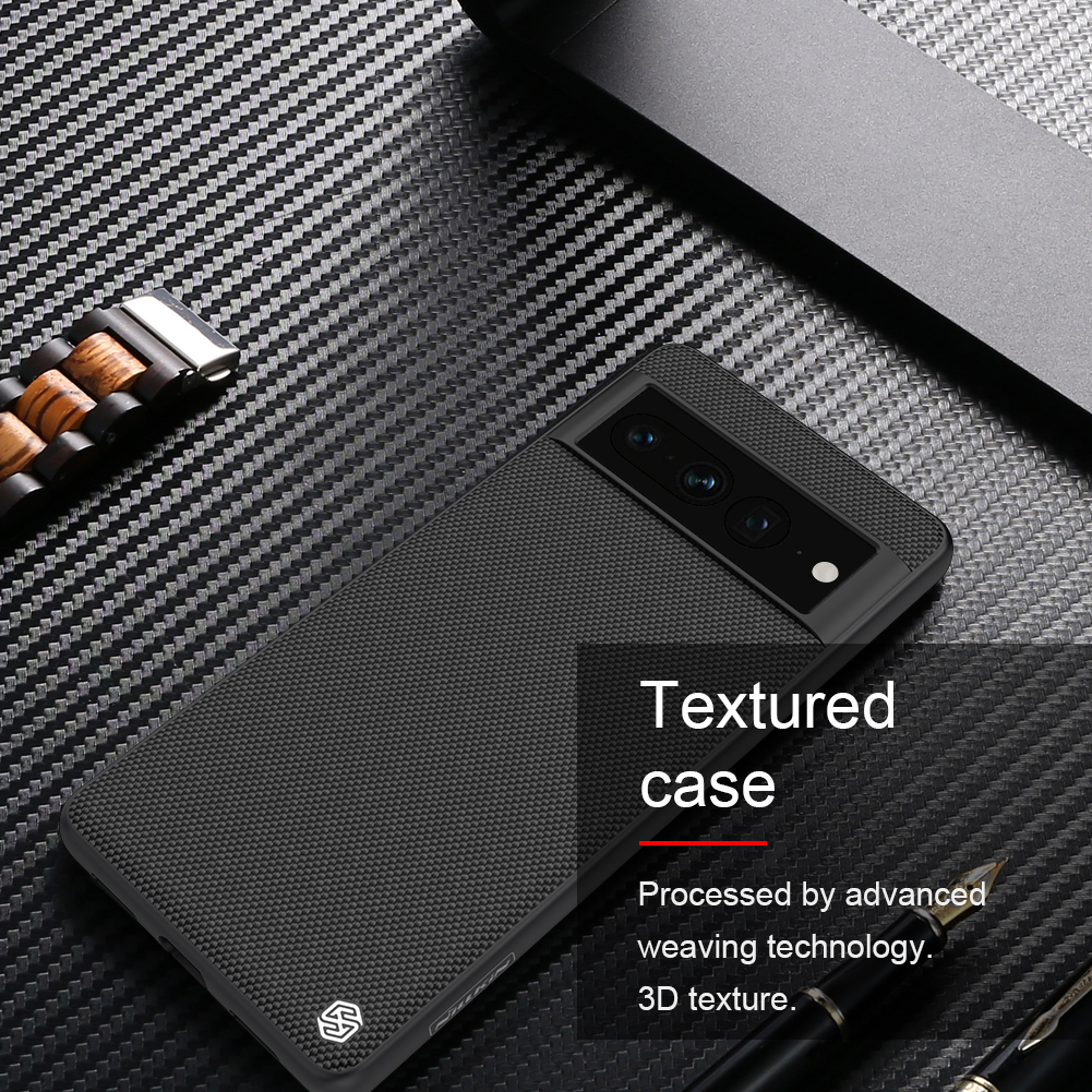 Тонкий чехол черного цвета из нейлонового волокна от Nillkin серии Textured Case для смартфона Google Pixel 7 Pro изготавливается из прочного и долговечного материала из очищенного нейлонового волокна.
