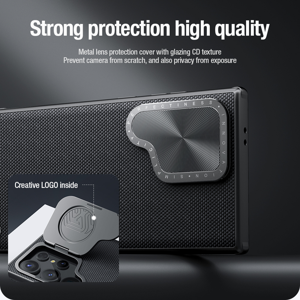 Противоударный текстурный чехол черного цвета с откидной крышкой для камеры от Nillkin серии Textured Prop Case для телефона Samsung Galaxy S24 Ultra создан для любителей активного отдыха.