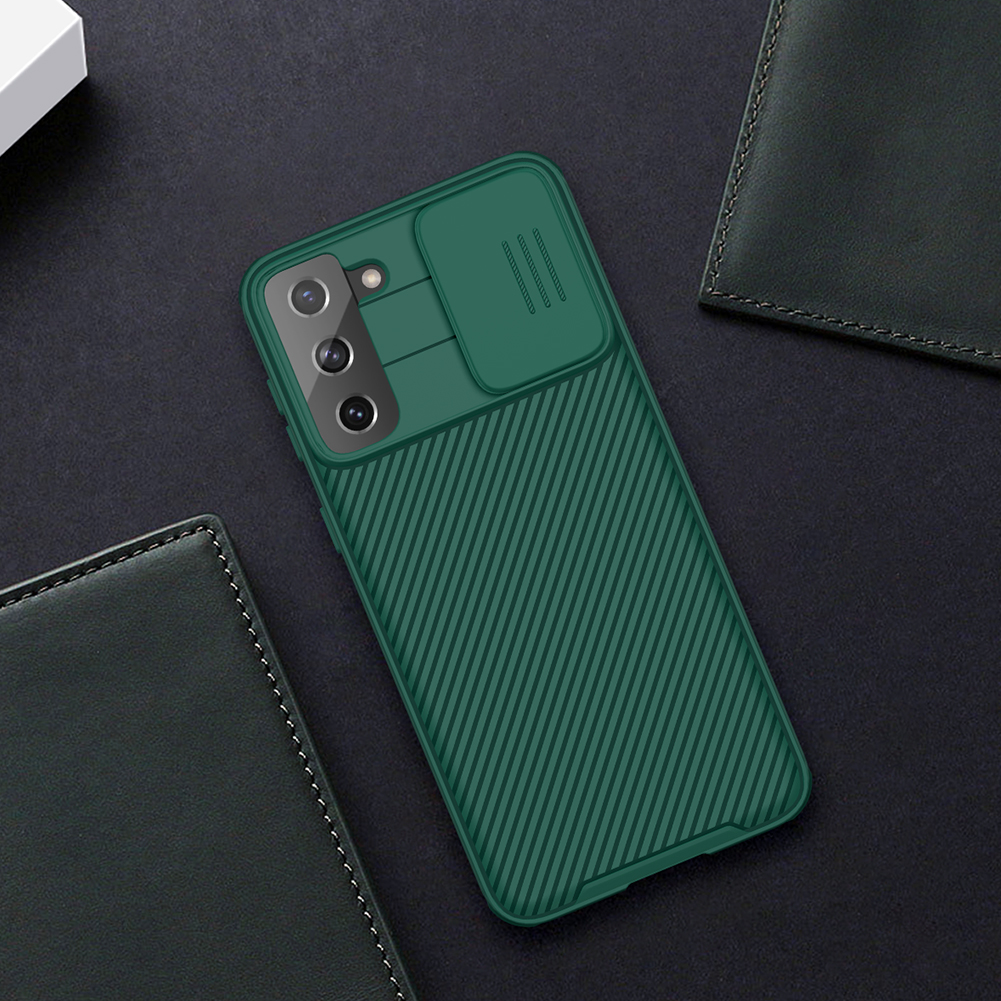 Противоударный чехол темно-зеленого цвета с защитной крышкой задней камеры от Nillkin серии CamShield Pro Case для телефона Samsung Galaxy S21+ Плюс создан для любителей активного отдыха.