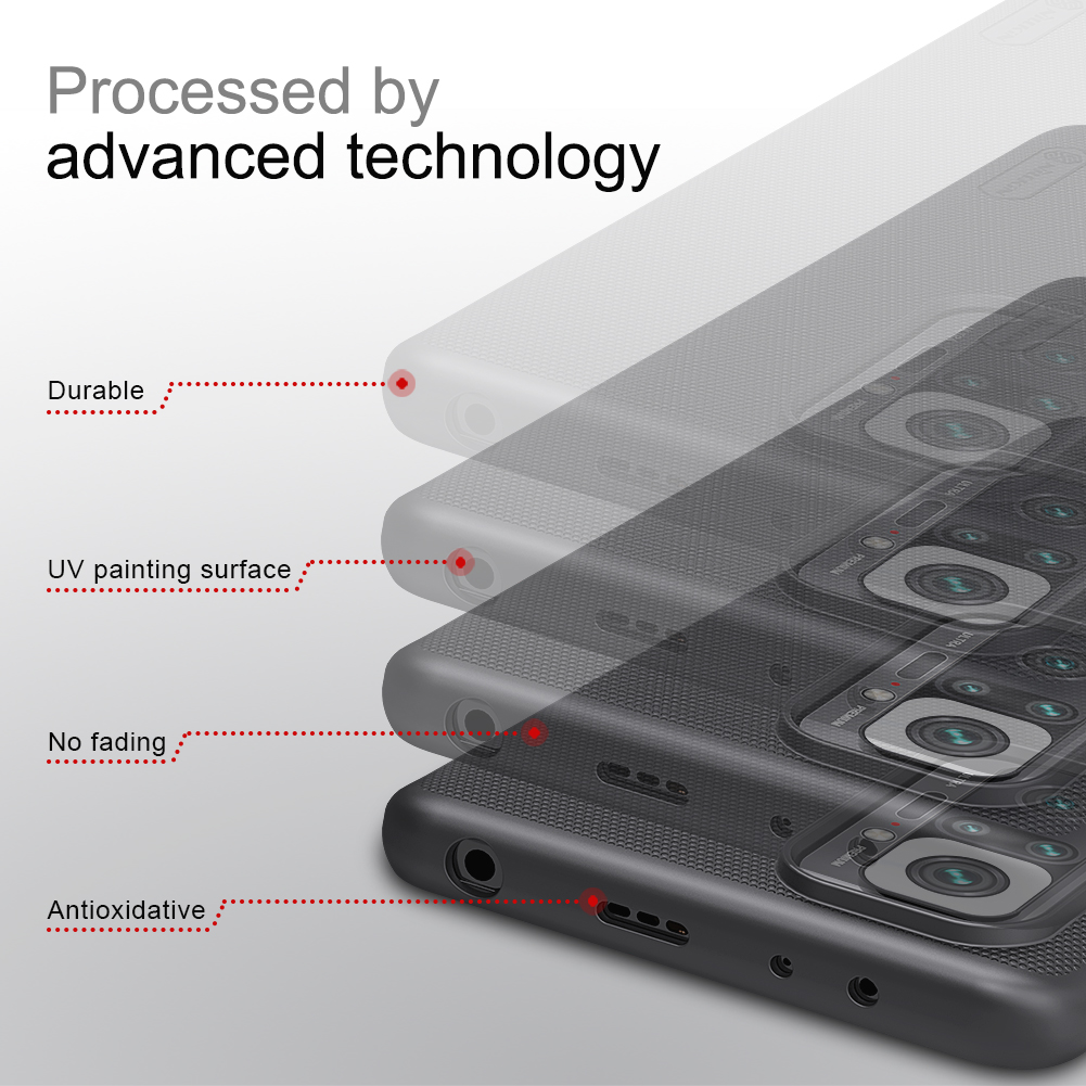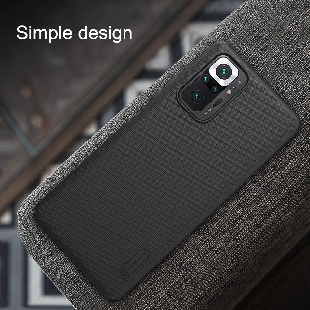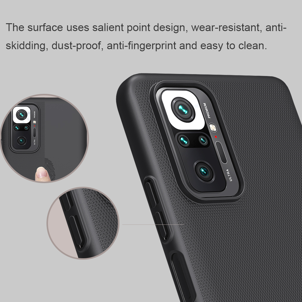 Тонкий чехол черного цвета от Nillkin серии Super Frosted Shield для смартфона Xiaomi Redmi Note 10 Pro и 10 Pro Max изготавливается из экологичных материалов путем высокоточного литья под давление с высокой температурой.