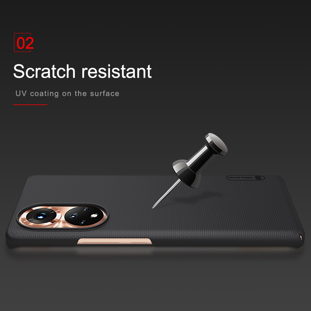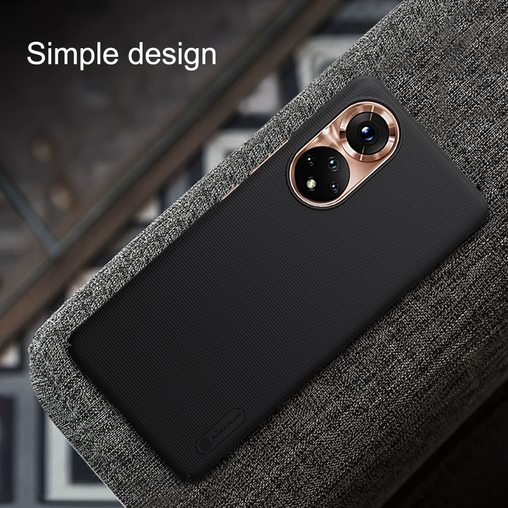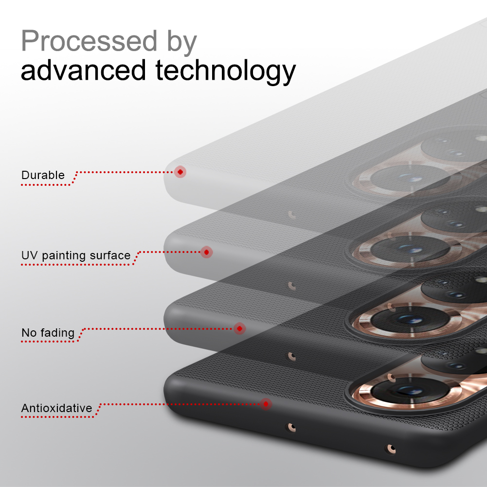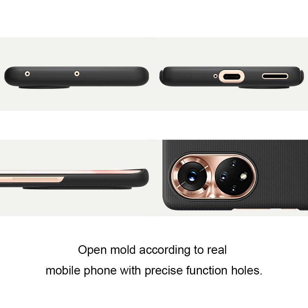 Тонкий чехол черного цвета от Nillkin серии Super Frosted Shield для смартфона Huawei Honor 50 с 2021 года изготавливается из экологичных материалов путем высокоточного литья под давление с высокой температурой.