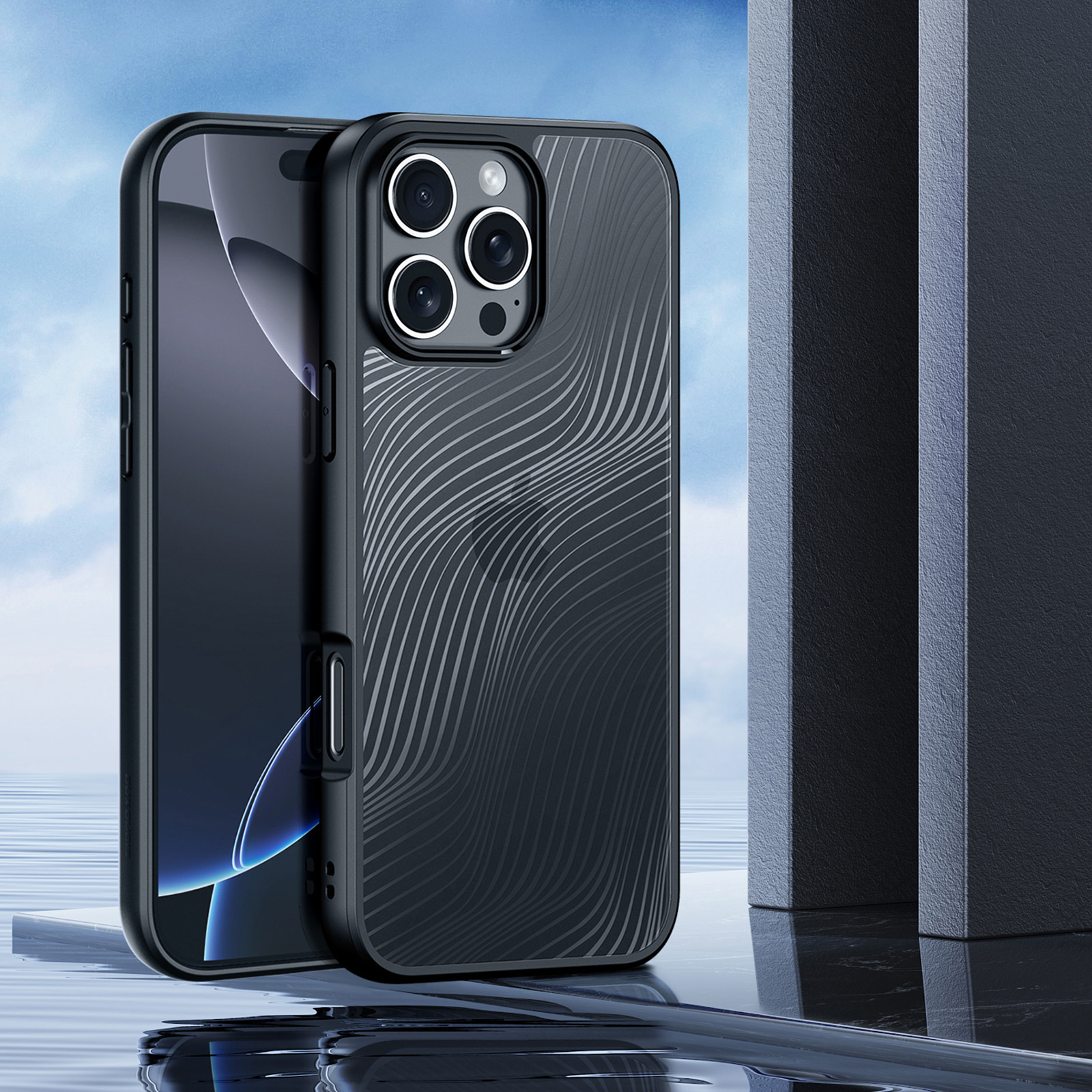 Тонкий чехол с мягкими черными рамками от Dux Ducis серии Aimo Series Case для смартфона iPhone 16 Pro Max изготавливается из экологичных материалов путем высокоточного литья под давление с высокой температурой.