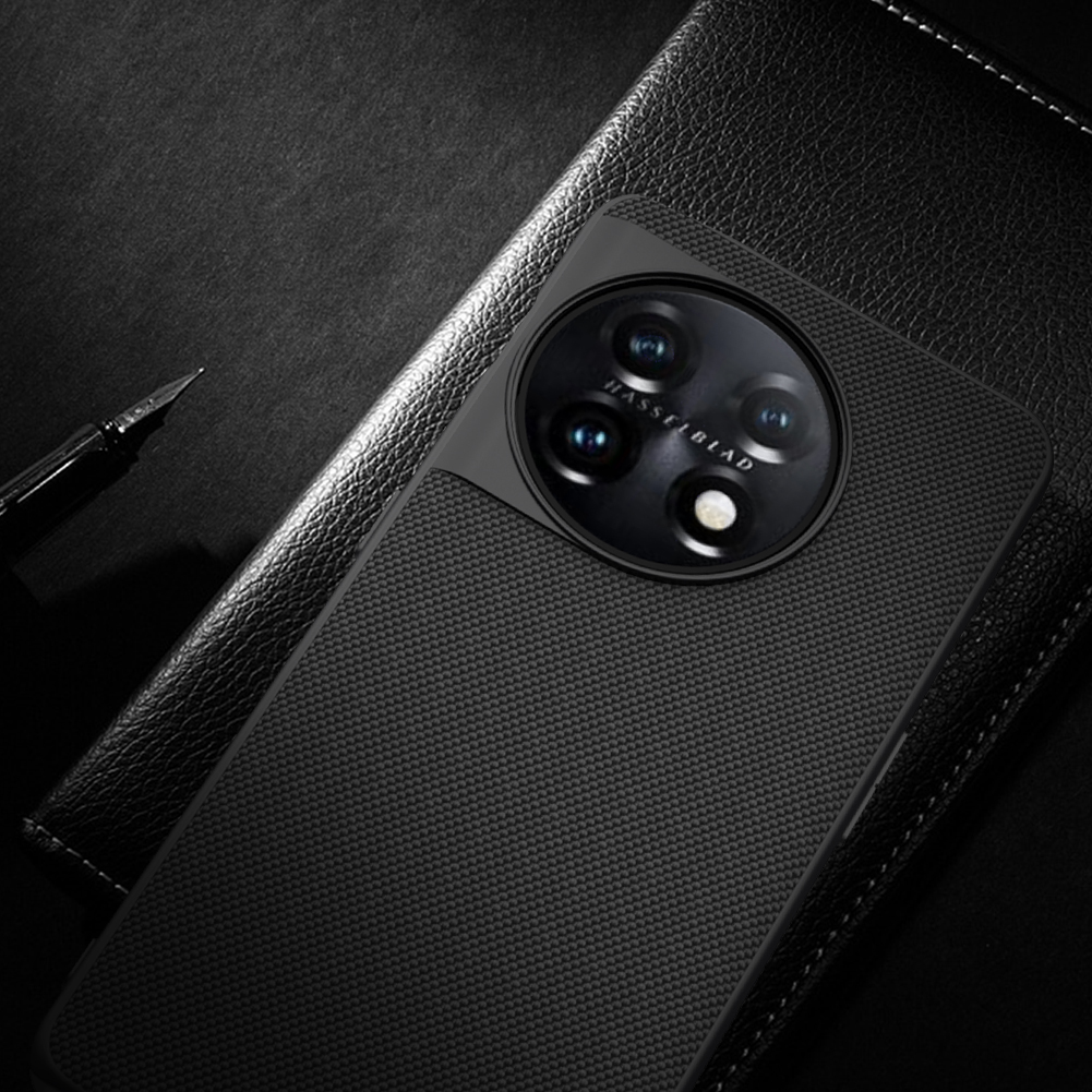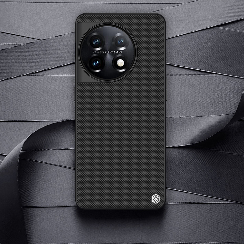 Тонкий чехол черного цвета из нейлонового волокна от Nillkin серии Textured Case для смартфона OnePlus 11 изготавливается из прочного и долговечного материала из очищенного нейлонового волокна.