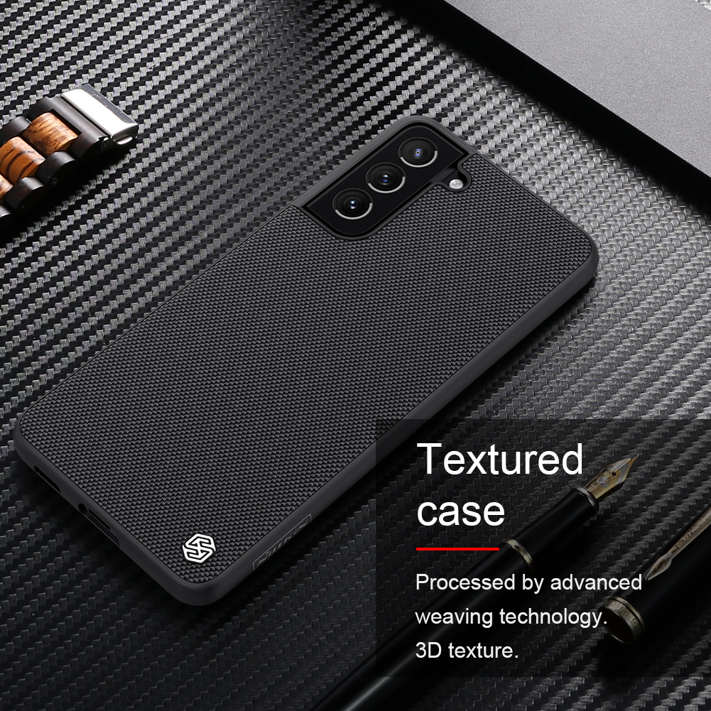 Тонкий чехол черного цвета из нейлонового волокна от Nillkin серии Textured Case для смартфона Samsung Galaxy S21 FE изготавливается из прочного и долговечного материала из очищенного нейлонового волокна.